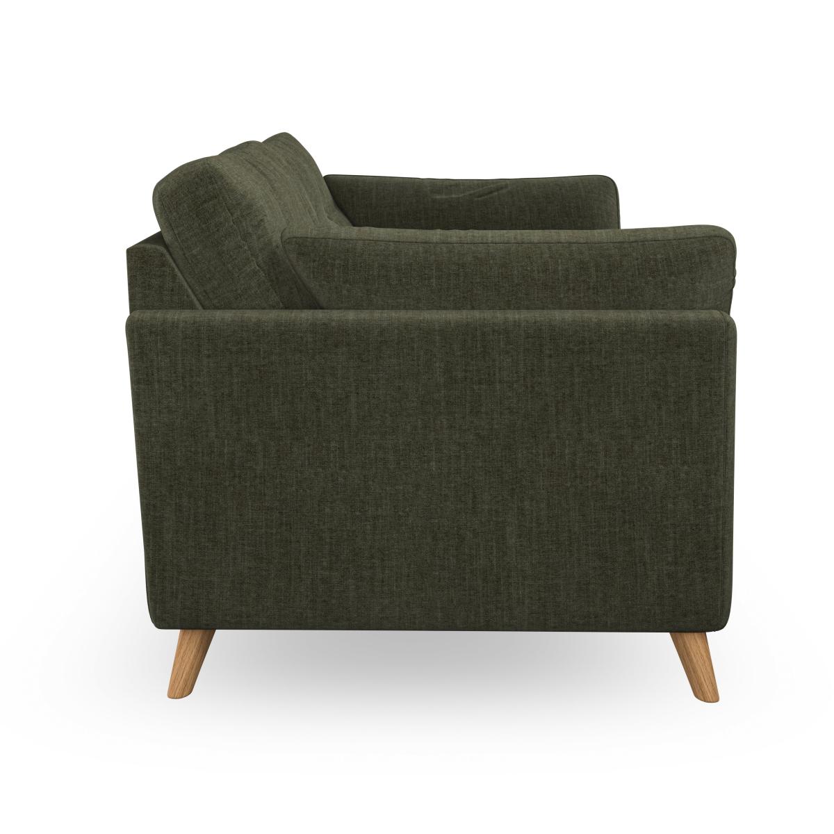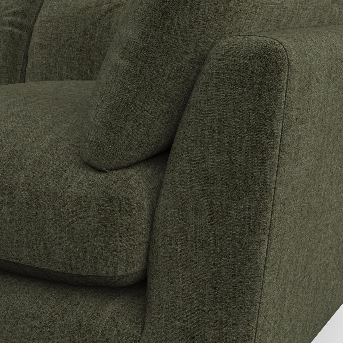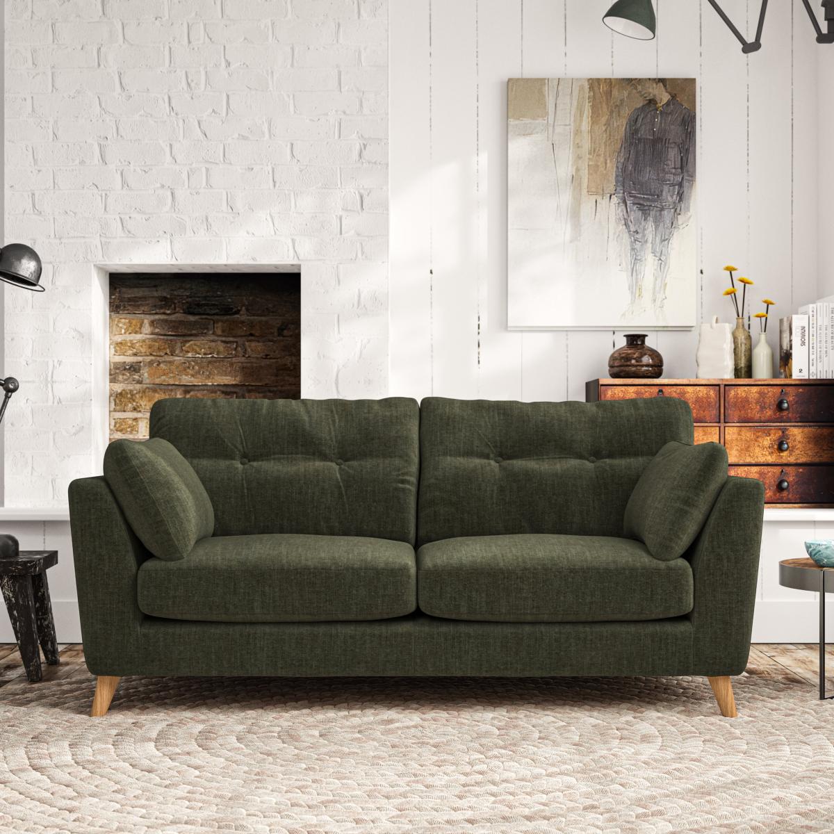 I’m a big fan of this deep-green chenille sofa because its plush texture and muted tone instantly warm up both modern and Scandi-inspired living rooms. The angled wooden legs keep the look light, while the rich colour acts as a subtle focal point without overwhelming the scheme. To style, layer in cushions in soft neutrals or warm terracotta to break up the green, and drape a cosy throw in a contrasting texture. Pair with a natural-fibre rug and oak or walnut side tables for a balanced, inviting feel. Finish with matte black or brass lighting and a few potted plants to echo the sofa’s earthy tone.