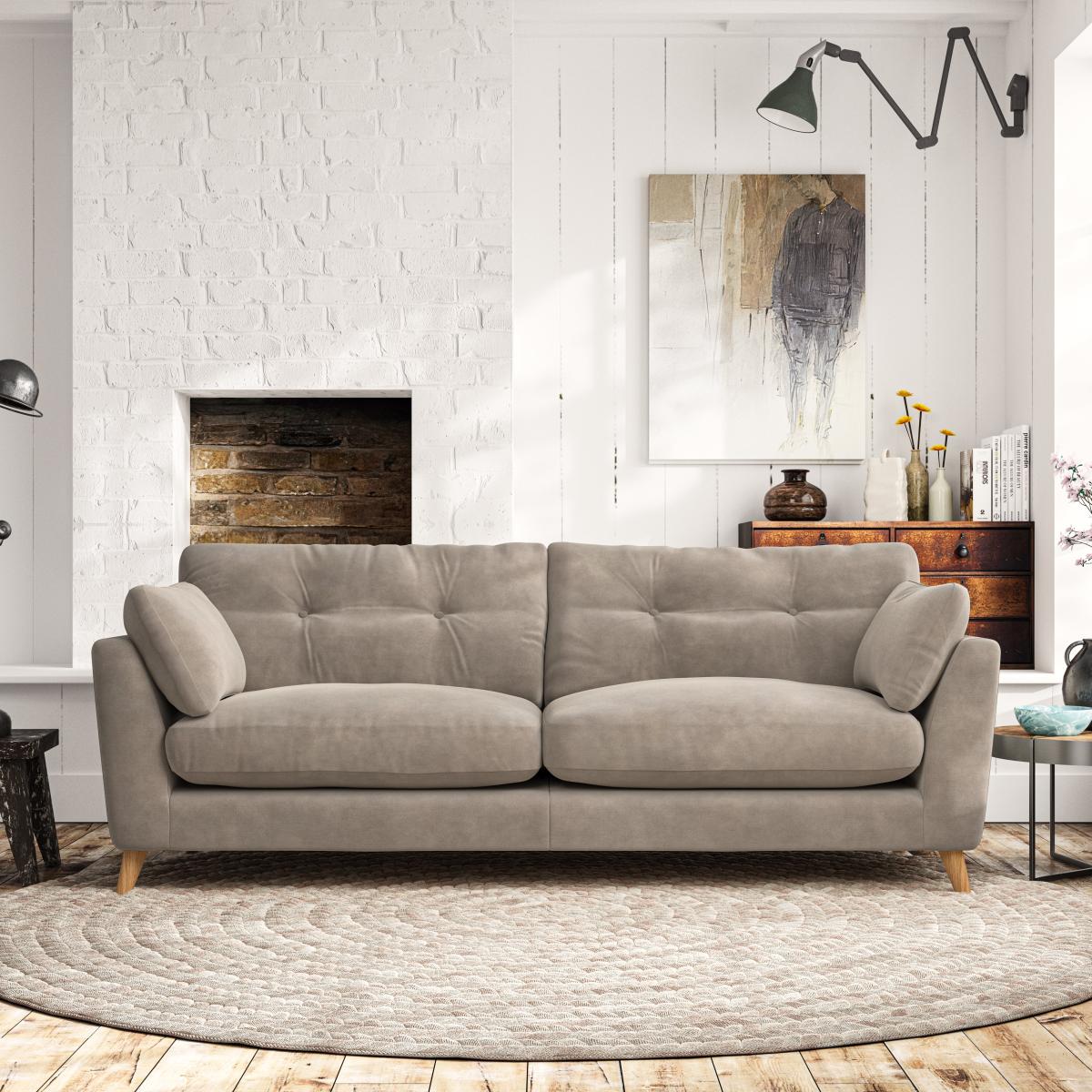 I’m a fan of the Peyton four-seater in mushroom chenille because its soft, neutral tone and clean lines slot effortlessly into contemporary, Scandi or transitional living rooms. The Aqua Clean fabric means you can use your sofa hard without worrying about spills - ideal for family homes or those who entertain often. To style, anchor the seat with a low-pile rug in muted greys or dusty pinks, then layer in cushions with different textures (think boucle or velvet) for added depth. A simple black or brass side table holds drinks, while a tall leafy plant beside one arm adds height and softens the overall look.