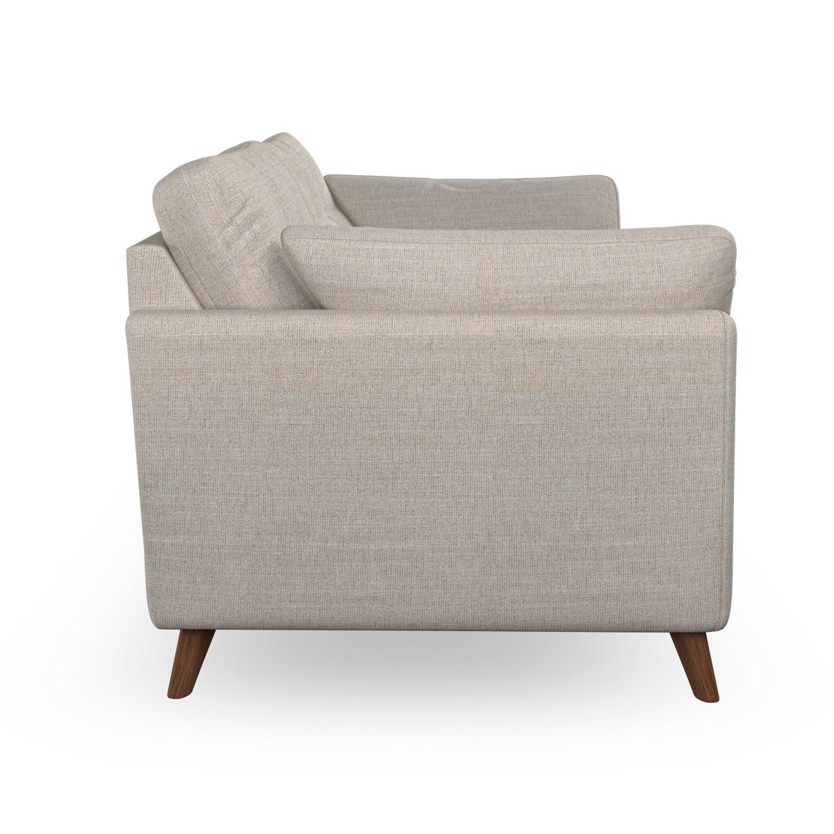 * Mid-century style* Pillow top arms* Button pull details* Choose fabric type, leg colour and cushion filling With its high legs and plush fibre-filled arm pads, this sofa combines sleek design with an inviting feel. Button-pull details on the supportive, fibre-filled back cushions add a touch of refinement, while the higher back cushions provide excellent support for your back and shoulders. Customise your Peyton sofa by choosing between a low-maintenance foam seat or a more relaxed 'Qualofill Blue' fibre seat for a softer sit. Built with serpentine seat springs for durability and long-lasting comfort, this sofa also features splayed hardwood legs available in two finishes for a personal touch.