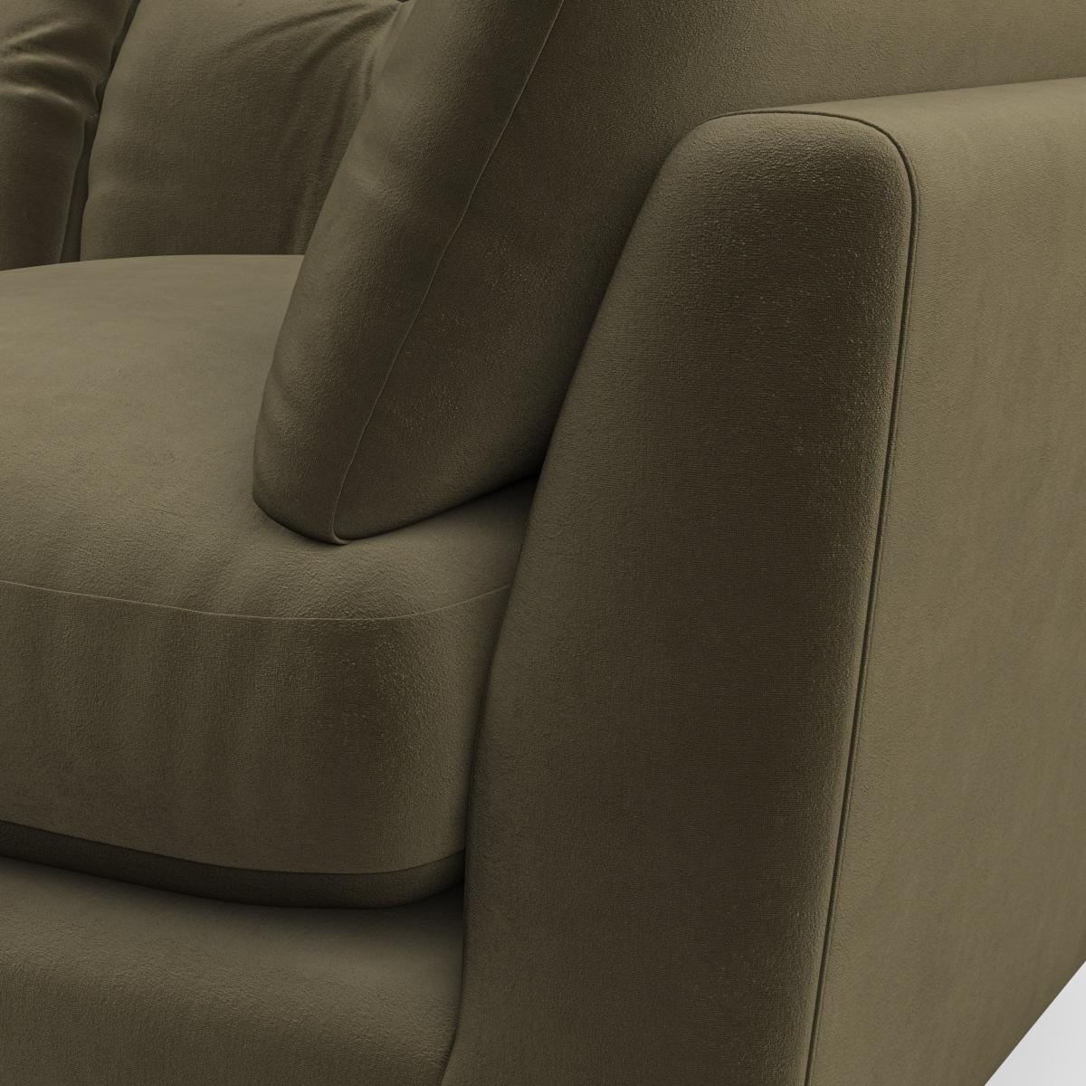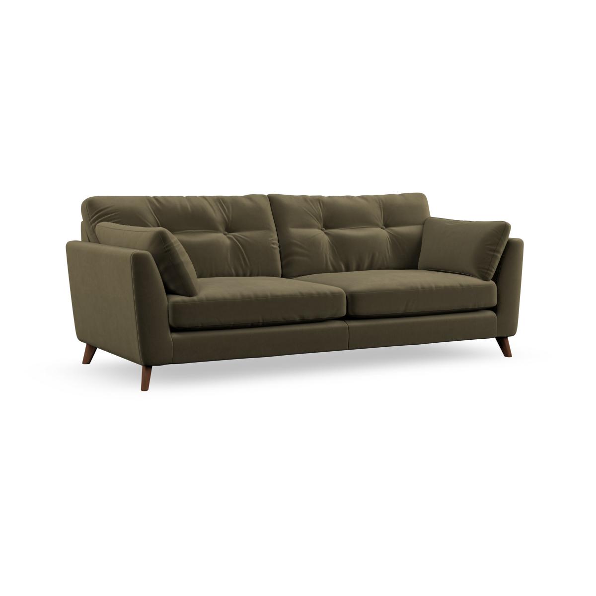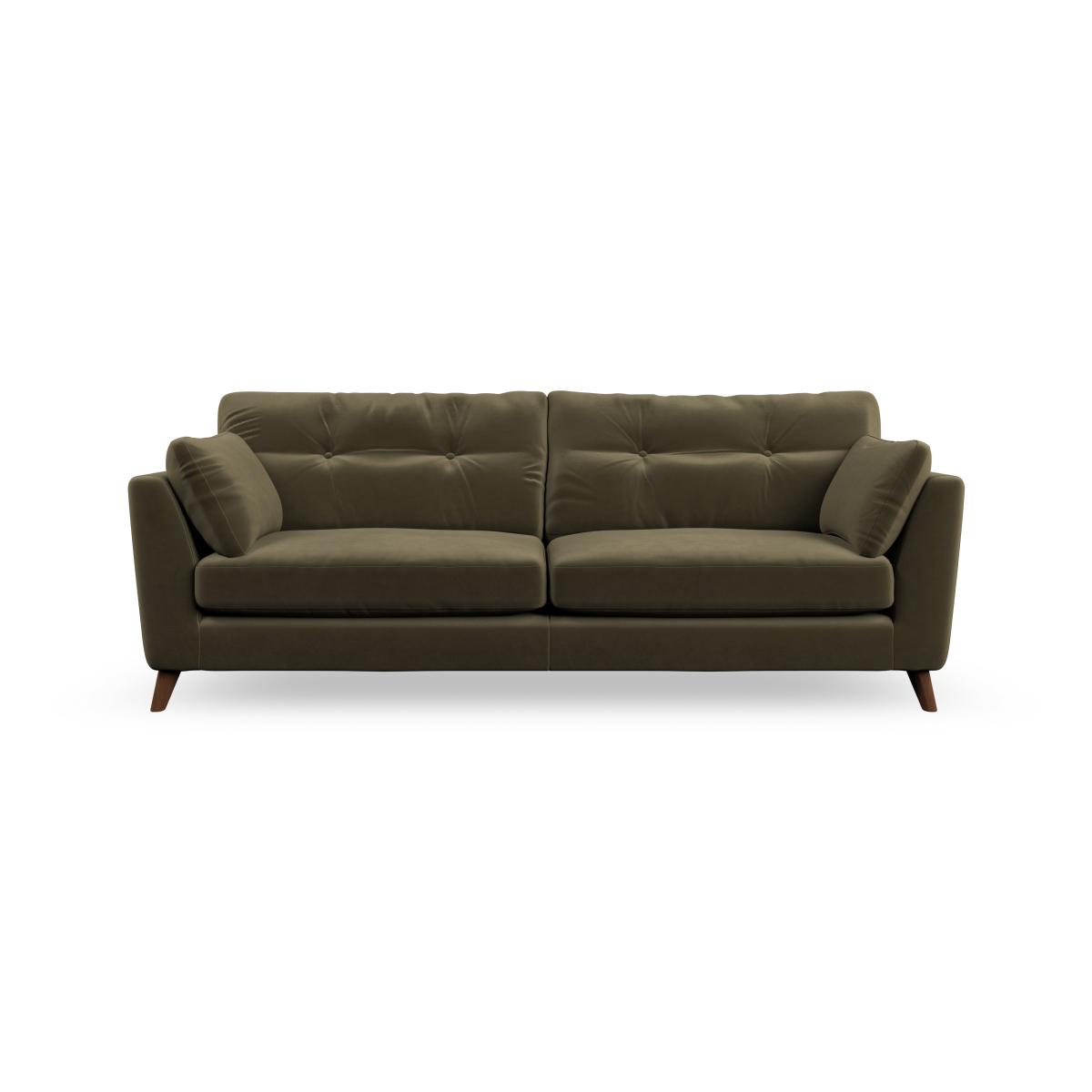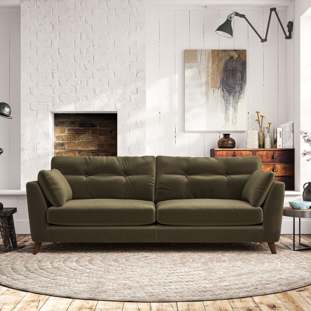 I’m a fan of the Peyton sofa in olive velvet because its clean lines and low arms give it a modern yet inviting feel. The deep, muted green works beautifully against neutral walls or alongside darker jewel tones, so it fits equally well in a Scandi-inspired living room or a more dramatic, moody lounge. To style it, I’d layer in cushions in tactile fabrics - think boucle or linen in cream, rust or soft pink - and add a knitted throw for contrast. A light wood coffee table and brass-framed side table will lift the look, while a couple of leafy plants will play up the sofa’s earthy colour. Keep your rug simple - perhaps a low-pile in a neutral shade - to let that olive finish really stand out.