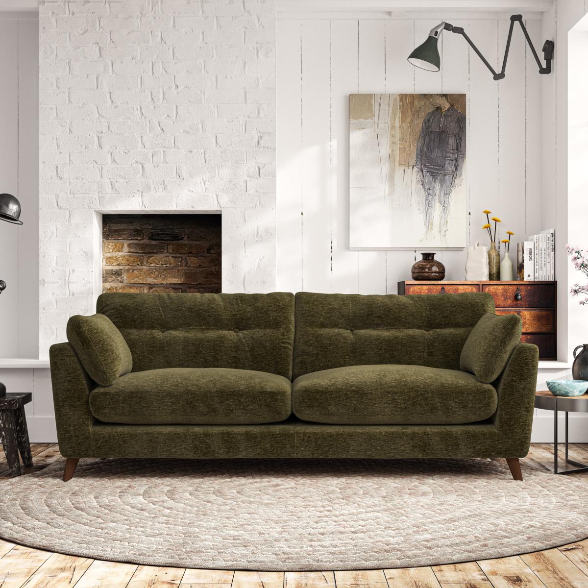 I’m a fan of the Peyton four-seater in olive chenille for its cosy yet structured feel - the soft fabric and deep green tone add depth without overpowering. Its mid-century inspired arms and tapered legs work equally well in Scandi, modern farmhouse or contemporary schemes. For styling, anchor it with a neutral jute or wool rug, then layer cushions in terracotta, mustard or dove grey to complement the green. A chunky knit throw keeps it inviting. Introduce brass or aged bronze accents via side lamps or a coffee-table tray, and choose light-wood or rattan side tables to lift the overall palette.
