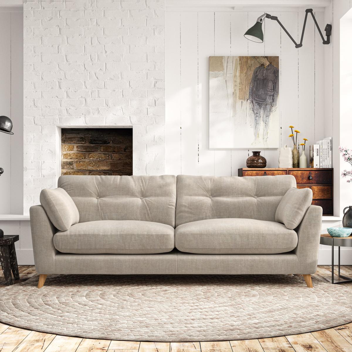I particularly like how this four-seater chenille sofa in a soft neutral tone works as a quiet centrepiece in both contemporary and Scandi-inspired rooms. The plush, tonal weave adds texture without overwhelming a palette, and its squared arms and deep seats make it a comfortable choice for family living or relaxed entertaining. For styling, float it away from the wall to create a conversation area, then layer with a pair of slimline side tables and a low-pile rug to define the zone. Introduce scatter cushions in muted greens or slate blues to pick up on the natural hue, and add a slim brass or matte black floor lamp for a subtle contrast. A simple wooden coffee table and a couple of leafy plants will complete the look without clutter.