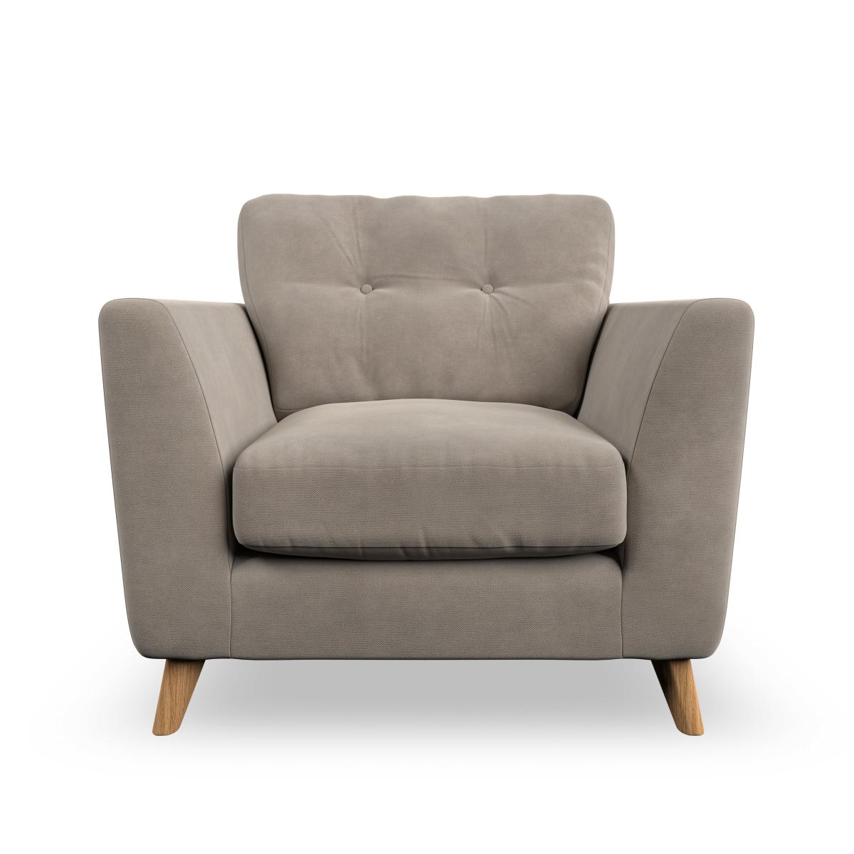 * Mid-century style* Pillow top arms* Button pull details* Choose fabric type, leg colour and cushion filling With its sleek, high-leg design and plush fibre-filled arm pads, this armchair offers both style and relaxation. The button-pull details on the supportive, fibre-filled back cushion add a refined touch, while the higher back cushion provides excellent support for your back and shoulders. Customise your Peyton armchair by selecting from a low-maintenance foam seat or a more relaxed 'Qualofill Blue' fibre seat. Featuring serpentine seat springs for durability, the chair is built to offer lasting comfort. The splayed hardwood legs, available in two finishes, are easy to fit and add a customisable element to the overall design.