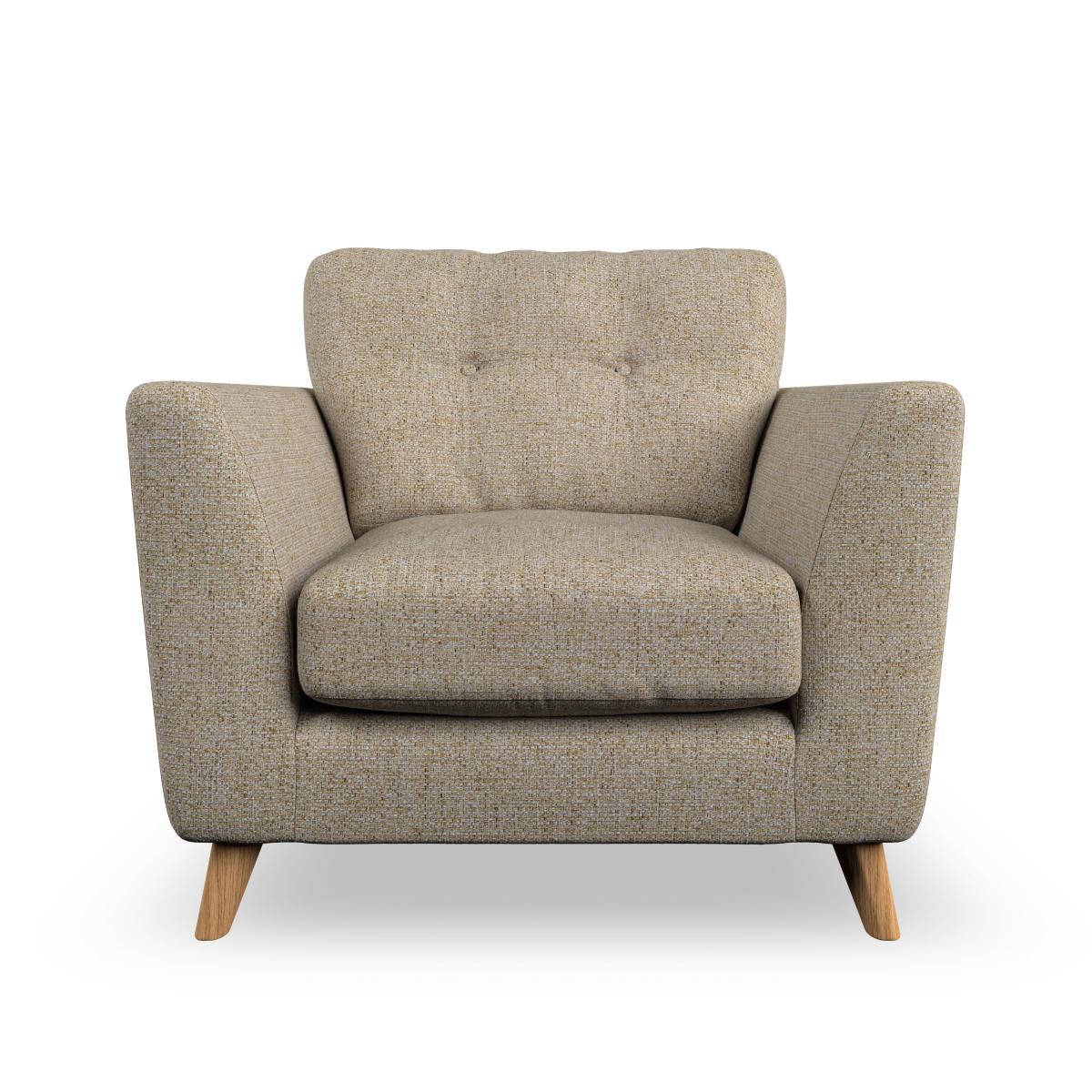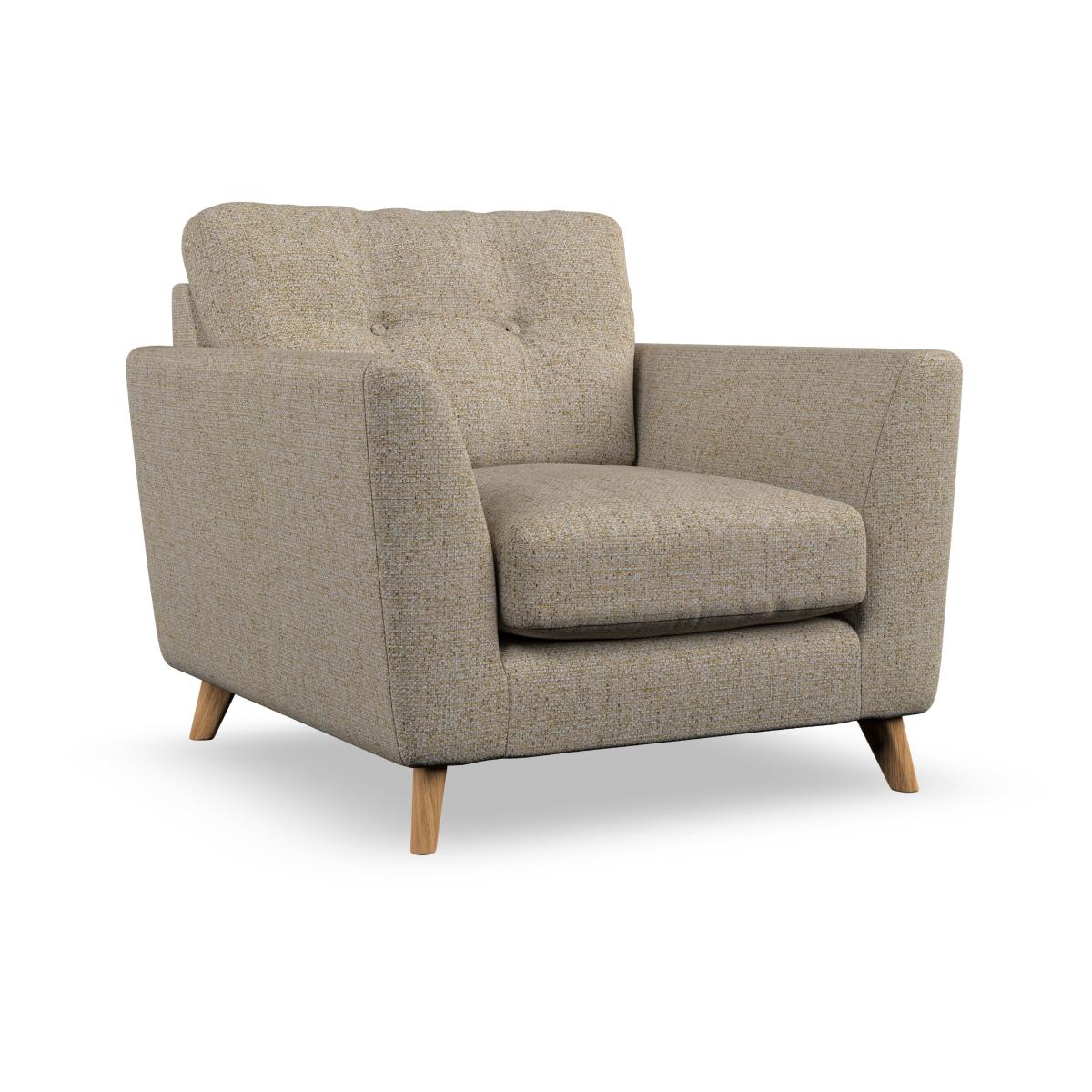 * Mid-century style* Pillow top arms* Button pull details* Choose fabric type, leg colour and cushion filling With its sleek, high-leg design and plush fibre-filled arm pads, this armchair offers both style and relaxation. The button-pull details on the supportive, fibre-filled back cushion add a refined touch, while the higher back cushion provides excellent support for your back and shoulders. Customise your Peyton armchair by selecting from a low-maintenance foam seat or a more relaxed 'Qualofill Blue' fibre seat. Featuring serpentine seat springs for durability, the chair is built to offer lasting comfort. The splayed hardwood legs, available in two finishes, are easy to fit and add a customisable element to the overall design.