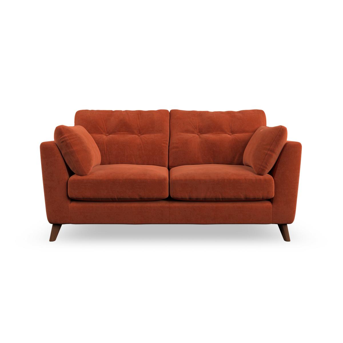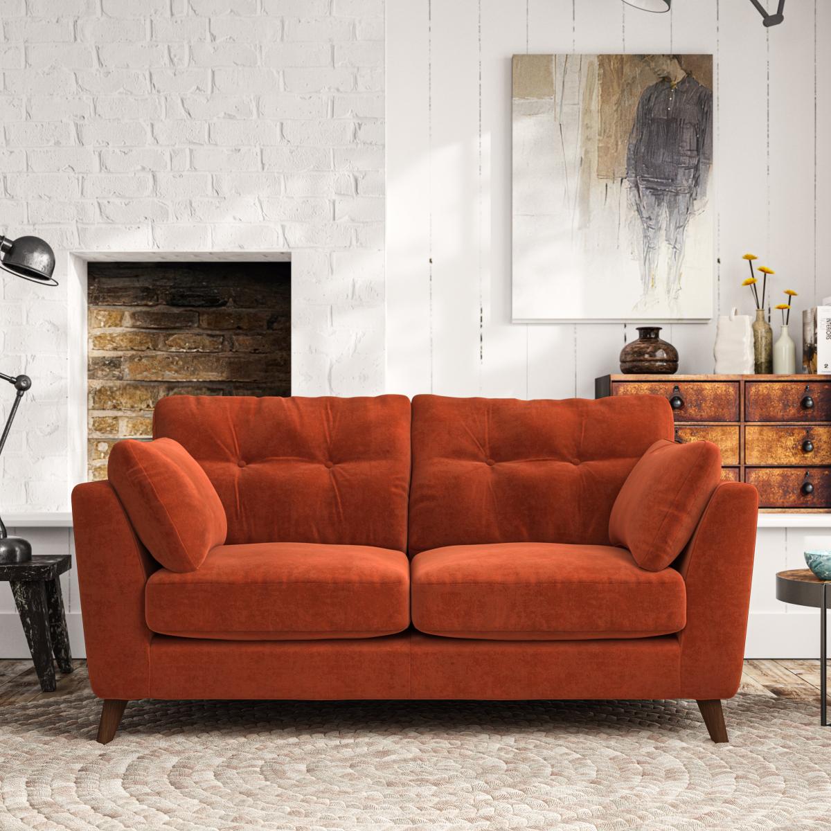 I’m a big fan of this orange-umber velvet two-seater - the rich hue and tufted back give it presence without feeling over-formal. It sits equally well in a mid-century modern scheme (pair with teak accents and slim-legged furniture) or a more eclectic, bohemian space where you can layer in patterned cushions and a woven throw. For styling, keep surrounding tones warm but muted: think aged brass lamps, a jute rug and matte black side tables. Add a couple of velvet or linen cushions in terracotta and soft olive to tie back to the sofa’s colour, and use a low coffee table in natural wood to balance out the plushness of the upholstery.