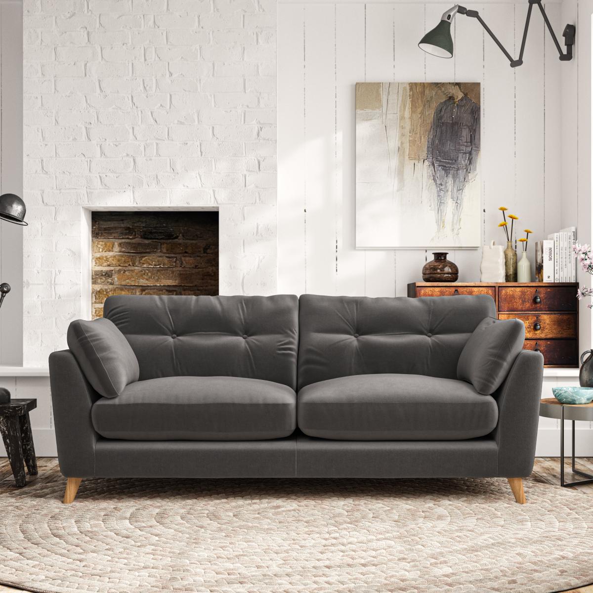 I’m a fan of the Peyton sofa in charcoal velvet for its sleek silhouette and durable, soft finish. The neutral dark grey works well in Scandi, modern-industrial or pared-back contemporary schemes, and the oak legs add a subtle warmth that stops the look feeling too heavy. For styling, layer in cushions in muted pinks or deep ochres to lift the tone and add texture with a chunky knit throw. Position it against a pale wall or next to a matte-black side table for contrast. Keep maintenance simple by giving it a quick vacuum and rotating your cushions regularly to maintain that plush, even look.