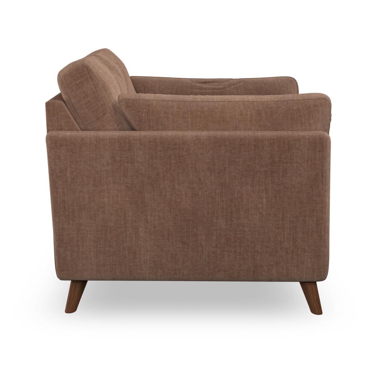 * Mid-century style* Pillow top arms* Button pull details* Choose fabric type, leg colour and cushion filling This chair showcases mid-century style with its elegant silhouette and plush pillow top arms, offering a perfect blend of comfort and sophistication. The button pull details on the supportive back cushions add a refined touch, enhancing its classic appeal. Customise your chair to suit your personal taste by choosing from a variety of fabric types, leg colours, and cushion fillings, allowing you to create a piece that perfectly fits your living space.