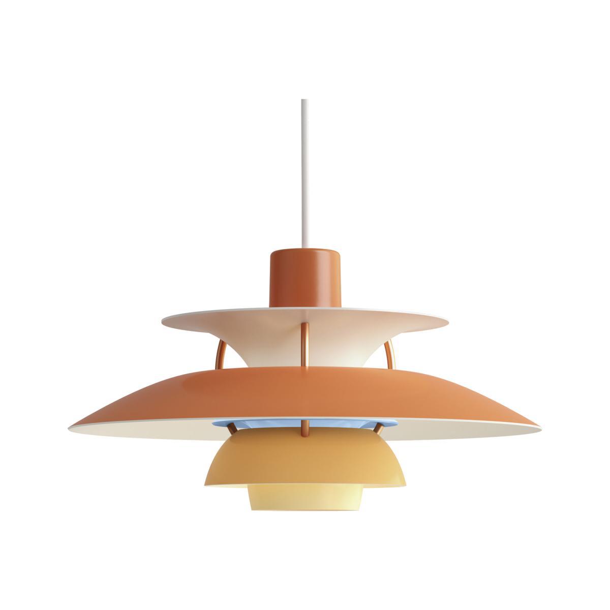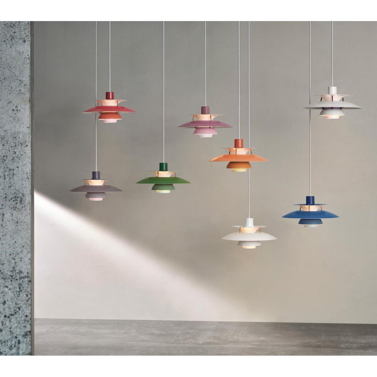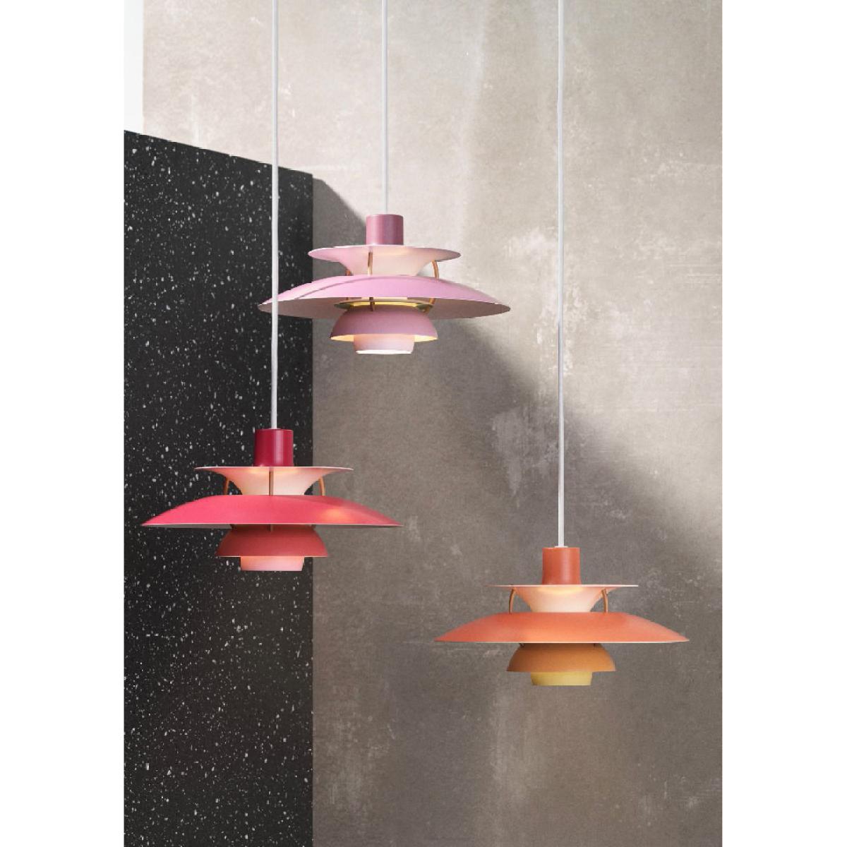 This is the smaller version of the famous PH 5 pendant, in a new range of subtle shades of colour. A true icon of Danish design, PH 5 is one of Denmark’s best-selling pendants! Designed by Poul Henningsen, the PH pendant was presented for the first time at the Museum of Art & Design in Copenhagen in 1958. Henningsen designed the PH collection of light fixtures in his quest for “perfect light”, “to achieve as natural a light as possible”. These lamps, encircled by metal lampshades serving as reflectors, cast a soft ambient light with no glare. The pendants distribute light both very comfortably and effectively, mainly downwards but also more gently at its sides. Its design makes it impossible to see the light source directly, so it will never be dazzling. It can be hung quite low, above a dining table for example, or higher up in the middle of a room. You can use a high luminosity bulb without compromising eye comfort. The pendant consists of three spherical lampshades mounted on a cone. Its mat lampshades are connected by rods. A vintage-style pendant that offers a perfectly homogeneous lighting, and which still attracts design enthusiasts the world over.
