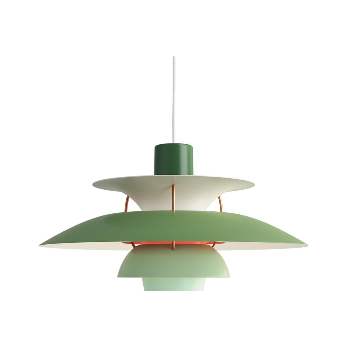 A dynamic-looking light by Copenhagen-born Poul Henningsen, the PH 5 Pendant Light in a green finish was originally designed in 1958 and has since been produced by Denmark's prestigious lighting manufacturer Louis Poulsen. A new take on Henningsen's celebrated three-shade system, the PH 5 Pendant emits downward and lateral light to create a glare-free emanation. The lamp features four shades crafted from powder-coated spun aluminium in a range of green hues and is accented with rolled aluminium struts in a bronze finish. Finished with a coordinating white ceiling rose and textile cord, the PH 5 Pendant Light is a truly refined design classic. Forming a lifelong collaboration with Louis Poulsen in 1925, Poul Henningsen is renowned across the globe for his innovative and radical approach to all his creative practices. A pioneer of Danish design, Henningsen also turned his hand to journalism and architecture throughout his career. Requires: 1 x Max 75W E27 bulb (not included).