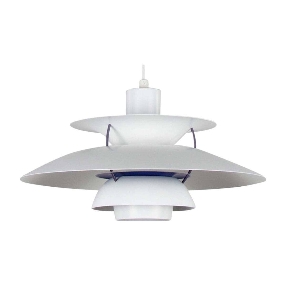 A dynamic lamp designed by Copenhagen-born Poul Henningsen in 1958, the PH 5 Pendant Light provides 100% glare-free, warm light and showcases the designer's signature intricate three-tiered shade. In hand-blown opal glass, the three shades of the PH 5 Pendant Light are reflective and direct light downwards for a bright emanation. With an interior red cone and blue reflector, the PH 5 Pendant Light creates a warmer emanation for an especially welcoming glow. Finished with a matte white fixture, the PH 5 Pendant Light is produced by Louis Poulsen, a Danish lighting manufacturer founded in 1874. Through collaborations with renowned designers such as Arne Jacobsen and Poul Henningsen, Louis Poulsen has established itself as one of the leading architectural lighting producers in the world. Requires 1 x Max 200W E27 bulb (not included).