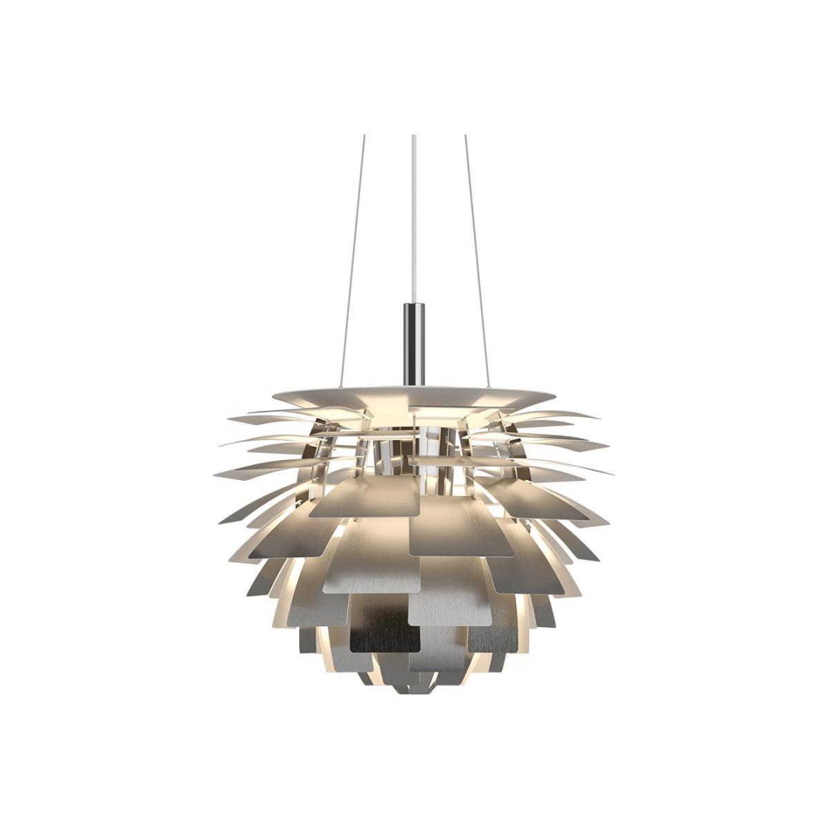 A dynamic-looking light by Copenhagen-born Poul Henningsen, the small PH Artichoke Pendant Light in a brushed stainless steel finish was originally designed in 1958 and has since been crafted by Denmark's prestigious lighting manufacturer Louis Poulsen. Originally designed for the Langelinie Pavillonen restaurant in Copenhagen, the instantly recognisable pendant features 72 brushed stainless steel leaves precisely positioned across 12 rows to offer completely glare-free glow throughout any space. Crafted largely by hand at Louis Poulsen's workshop in Denmark, the pendant is completed with a chrome-plated laser-cut steel frame, suspended from chrome-plated spun aluminium cables and is finished with a coordinating ceiling rose. Forming a lifelong collaboration with Louis Poulsen in 1925, Poul Henningsen is renowned across the globe for his innovative and radical approach to all his creative practices. A pioneer of Danish design, Henningsen also turned his hand to journalism and architecture throughout his career. Require: 1 x Max 60W E27 bulb (not included).