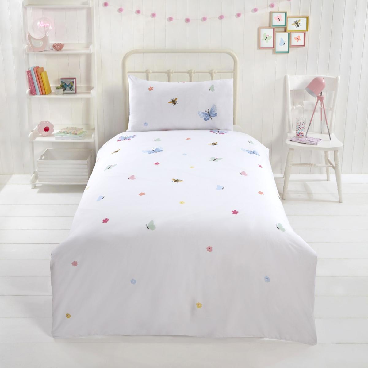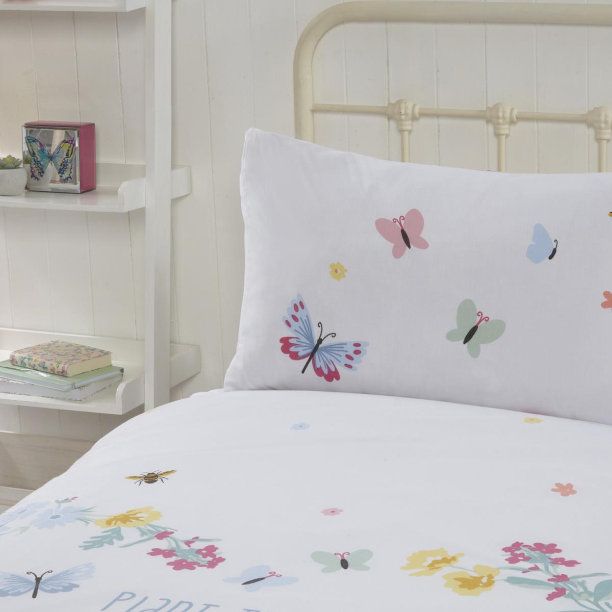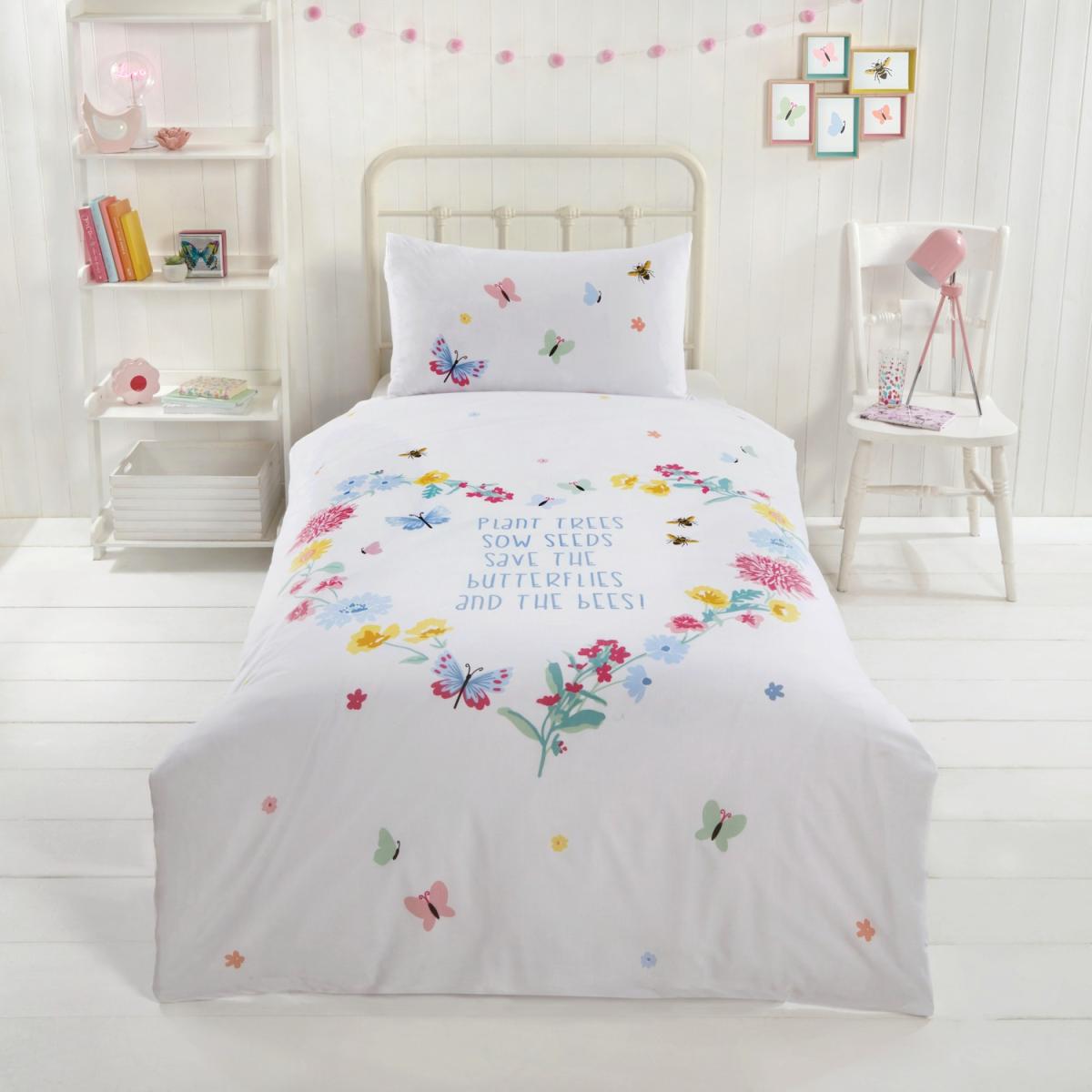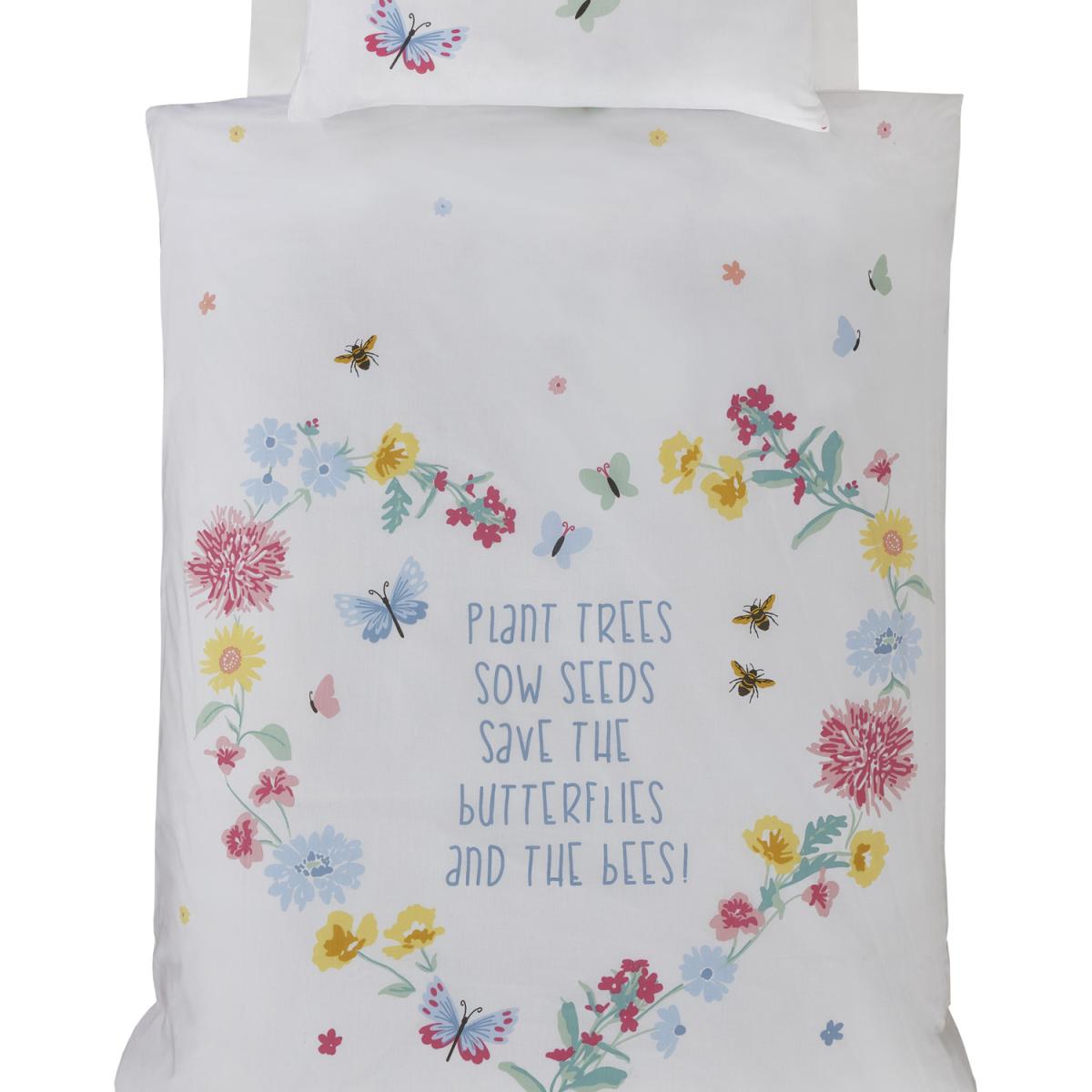 Our little rapport home range is made using sustainably sourced bci cotton recycled polyester. Designed by British designers, this pretty design has the slogan plant trees, sow seeds, save the butterflies and the bees. Delicate bees and butterflies are scattered over the front and reverse of the duvet set.