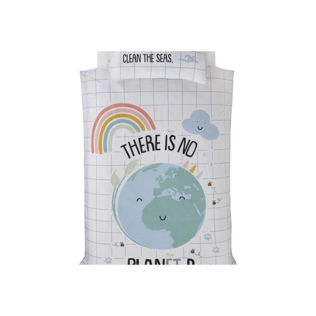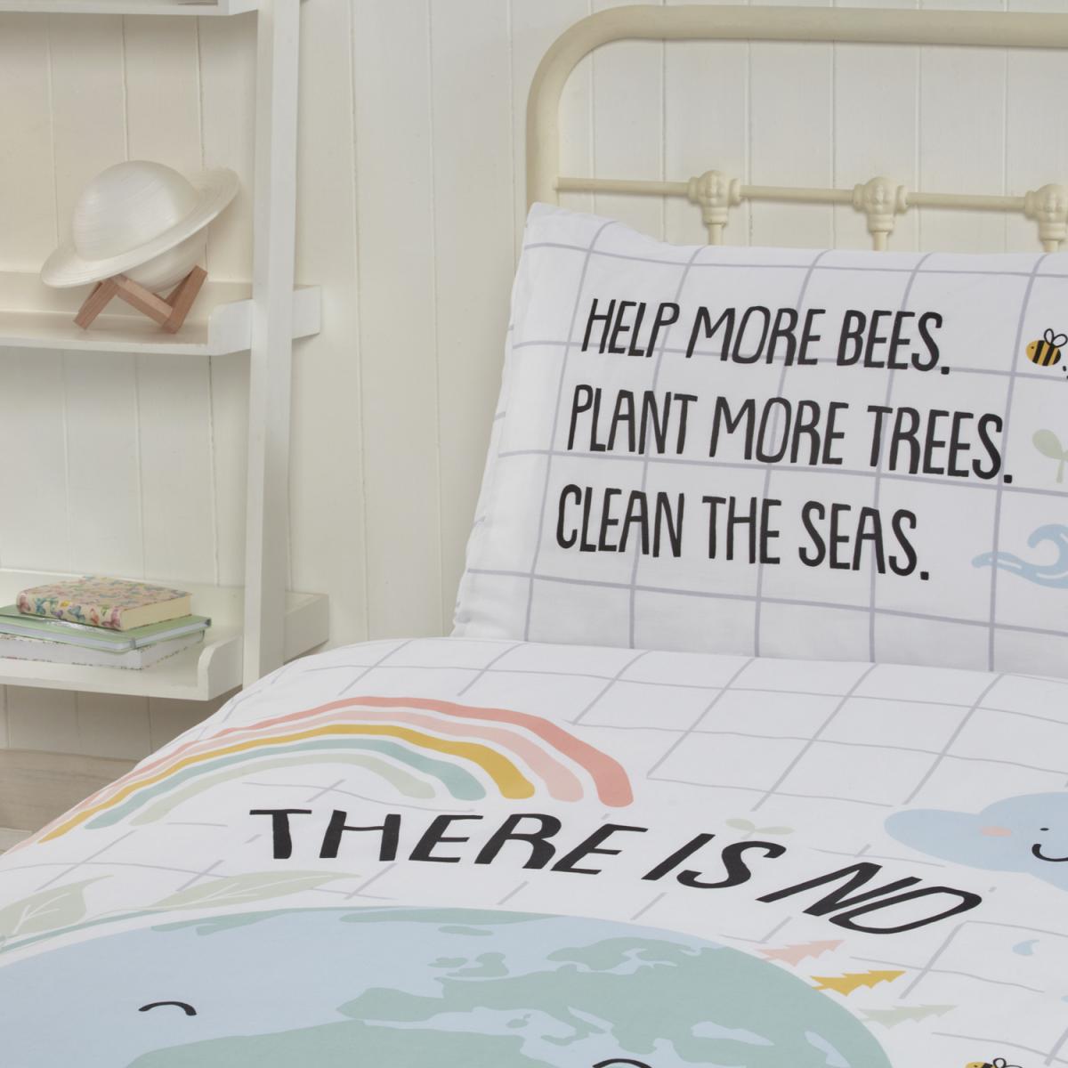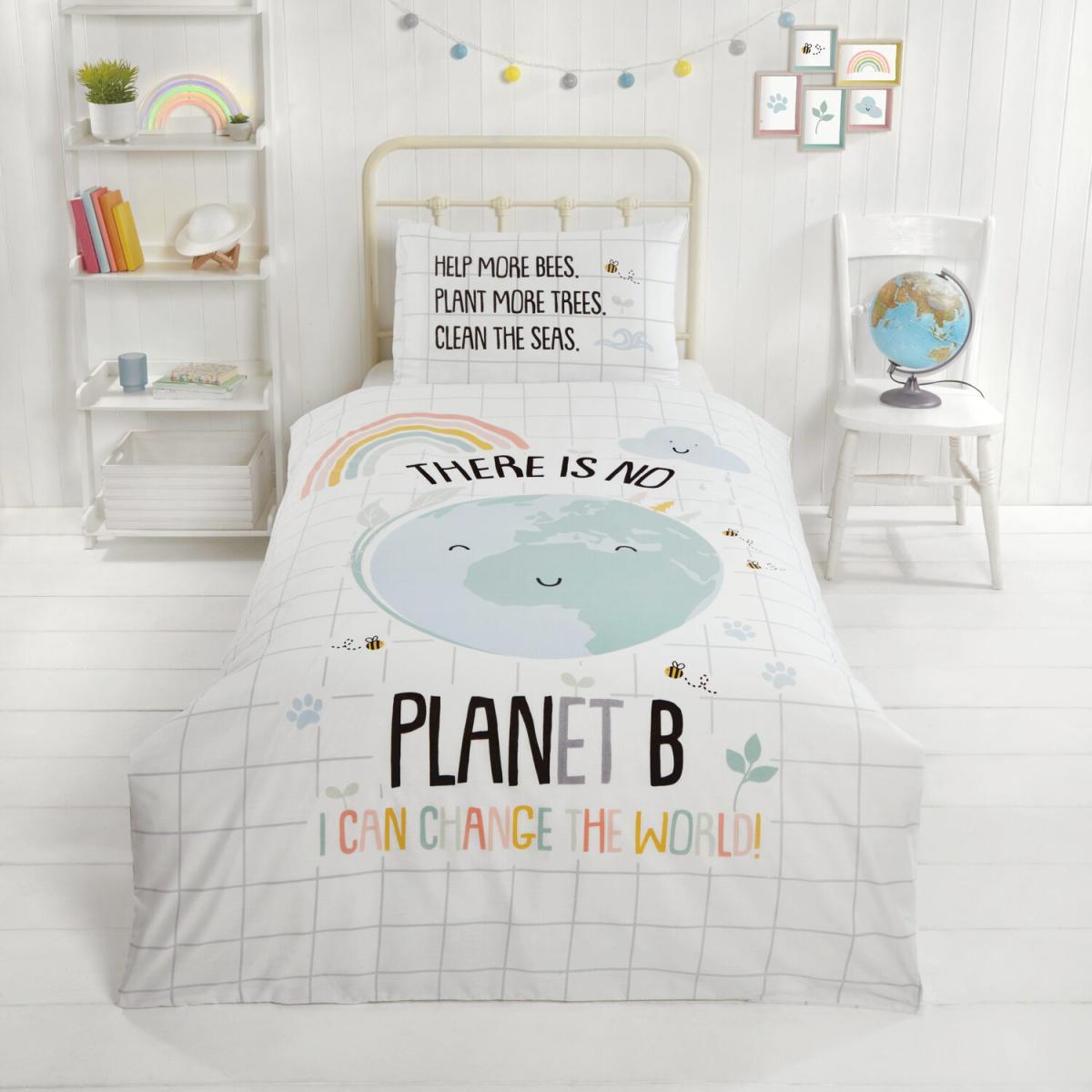 Our little rapport home range is made using sustainably sourced bci cotton recycled polyester. Designed by British designers, this shows the world with the slogan there is no planet b i can change the world. The reverse shows delicate bees and rainbows.
