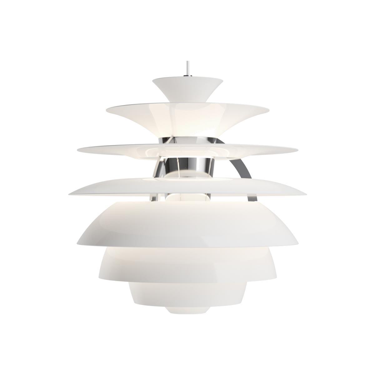 Add the finishing touch to your living spaces with the PH Snowball Pendant Light by the legendary Poul Henningsen for Louis Poulsen. Nestled inside a chrome-plated aluminium frame, the light boasts a high-lustre top finish with a matte underside. Suspended from a white fabric cord, the instantly recognisable pendant emanates a glare-free diffused light. Through collaborations with renowned designers such as Arne Jacobsen and Poul Henningsen, Scandinavian Louis Poulsen has established itself as one of the leading architectural lighting producers in the world. Requires: 1x max. 70W E27 bulb (not included).