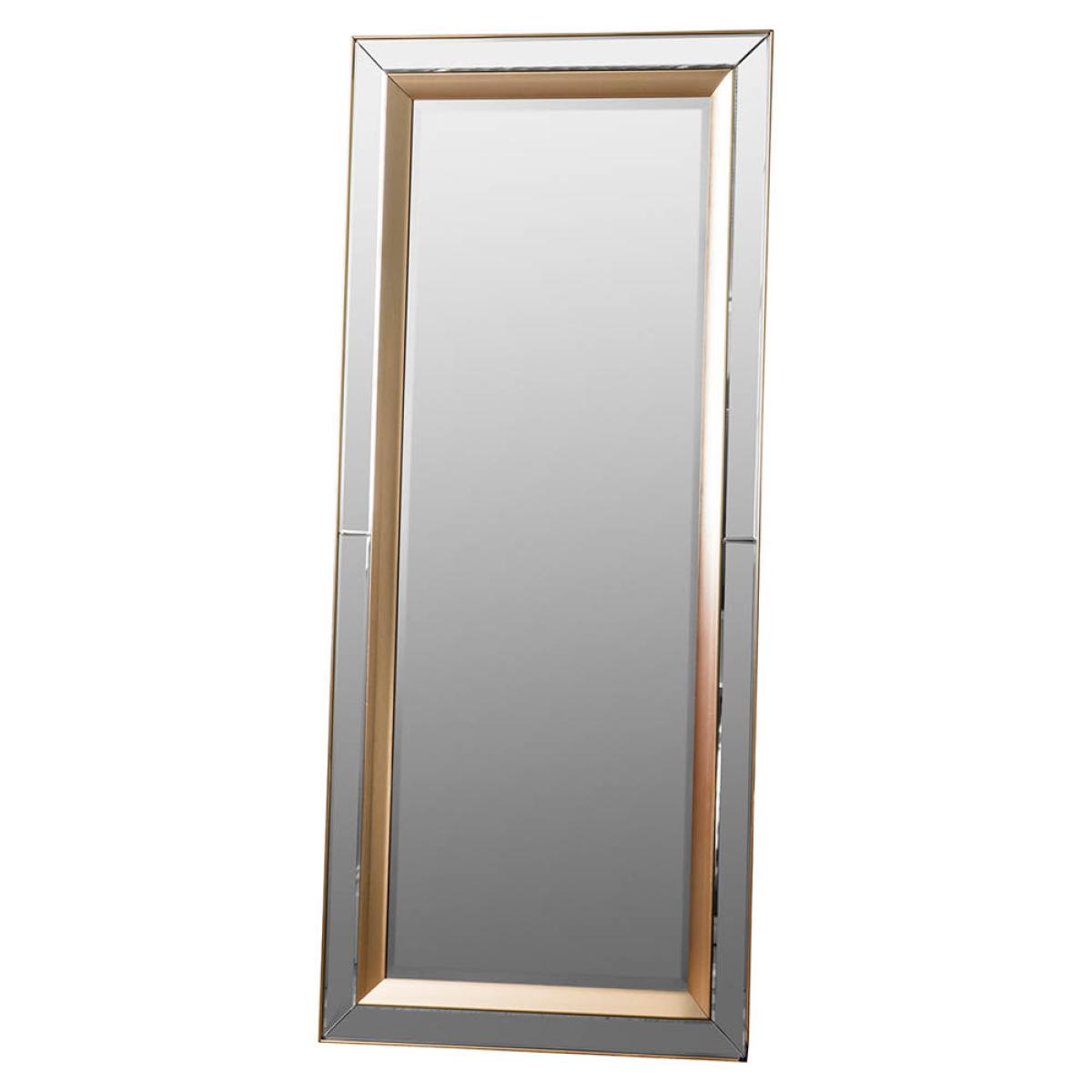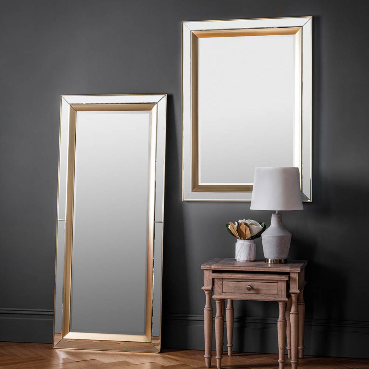 A contemporary styled full lenght mirror with bevelled mirror frame and gold inlay.