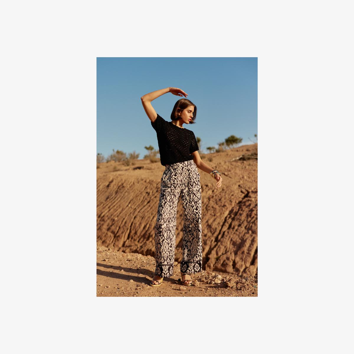 These wide-leg trousers are a bold, fashion-forward piece that works exceptionally well in contemporary or eclectic interiors. I love how the graphic print adds visual interest, making them not just a piece of clothing but a sort of wearable artwork. They’re great in casual living spaces with lots of textures and patterns, such as a boho-inspired lounge or an art studio. Practical styling tips include pairing them with a simple, fitted top to balance their volume or smart-casuaising with a tailored blazer for a chic, relaxed look. They also serve as a great statement piece when draped over neutral furnishings, adding a lively, artistic vibe to the room.