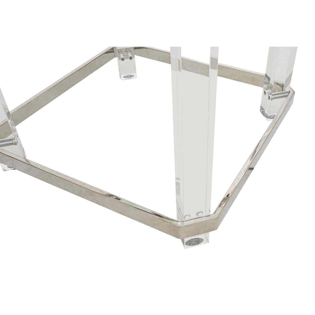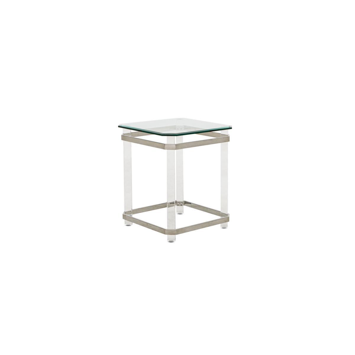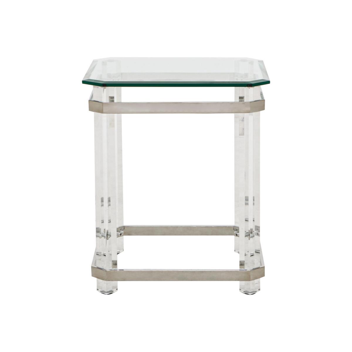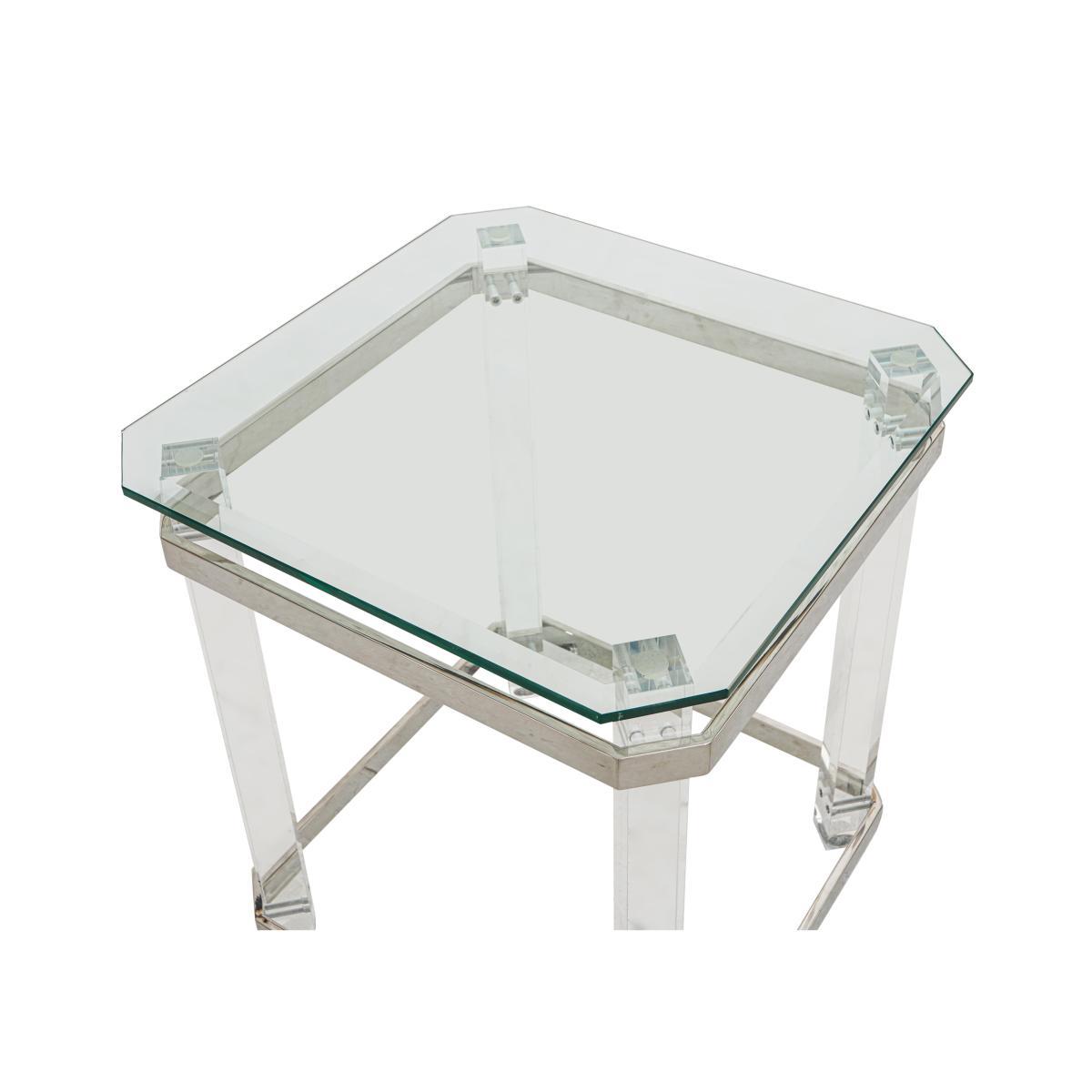 Chic designer style in glass, steel and acrylic. Clear tempered glass top with Deco style bevelled edges. Transparent acrylic legs with stainless-steel banding. With its open, transparent framework, the Phee lamp table does not seem to take up any space at all. This gorgeous glass designer piece is perfect as a side table or will brighten a corner with a lamp placed on top. The table top is made of tempered glass, with attractive bevelled edges. It has column style acrylic legs, defined by two stainless-steel bands. This ultra-stylish lamp table is ideal for a contemporary interior, or will add a hint of Deco style to a classic home. Glass surfaces under direct light can reveal the polishing process in the form of small scratches. Tempered glass should be moved carefully. Coasters are recommended.