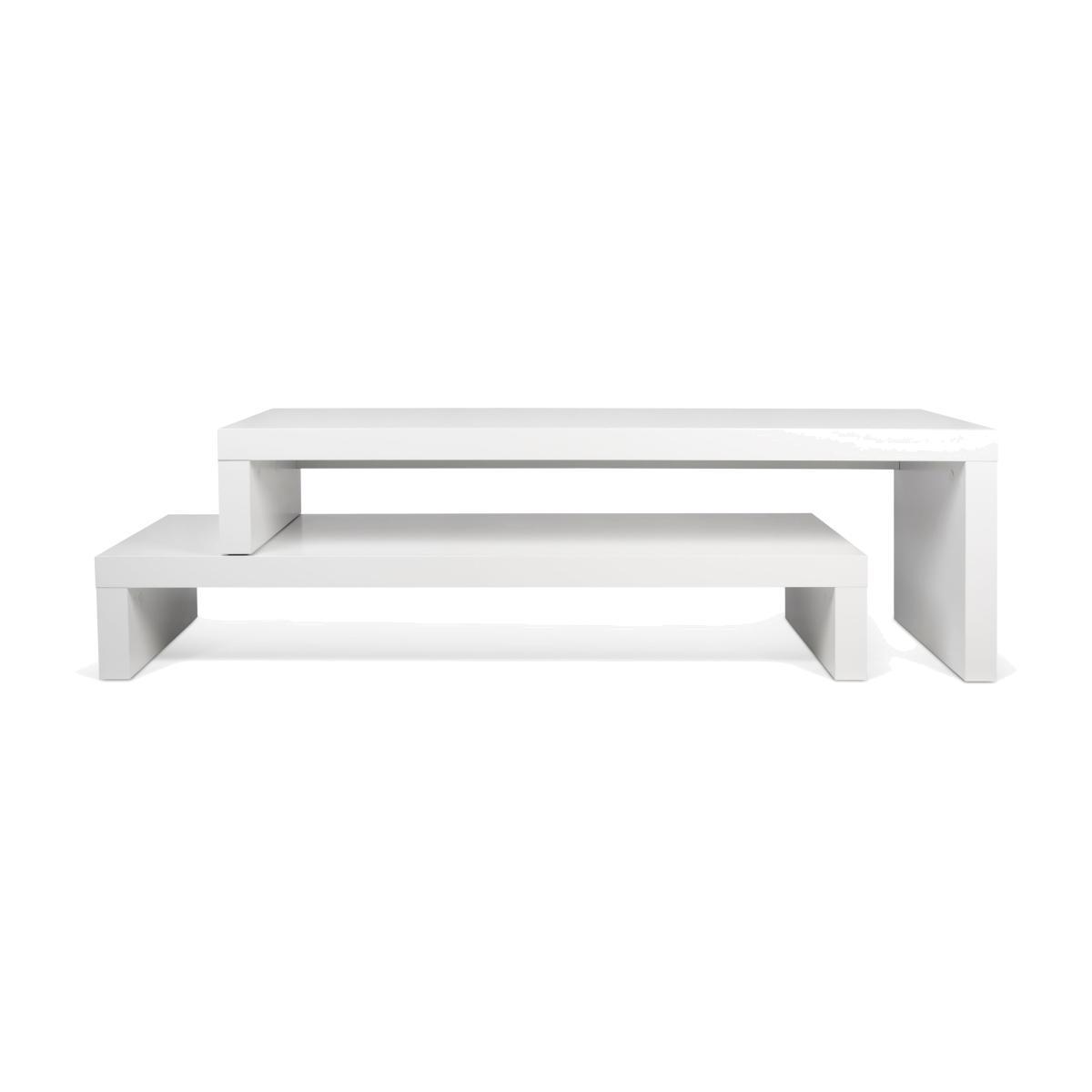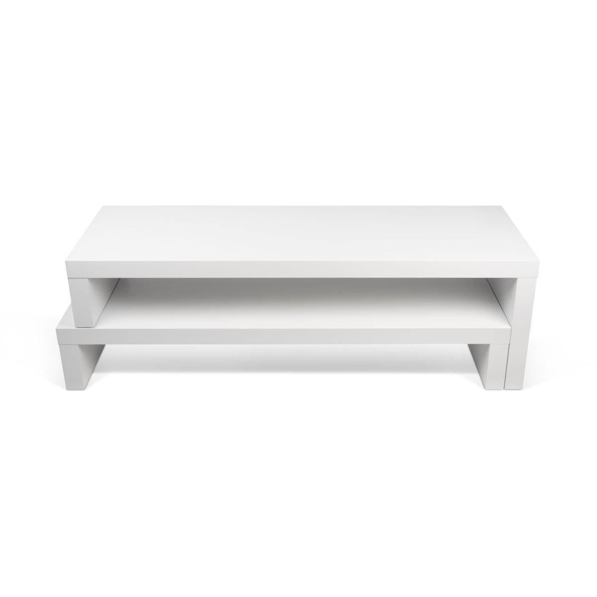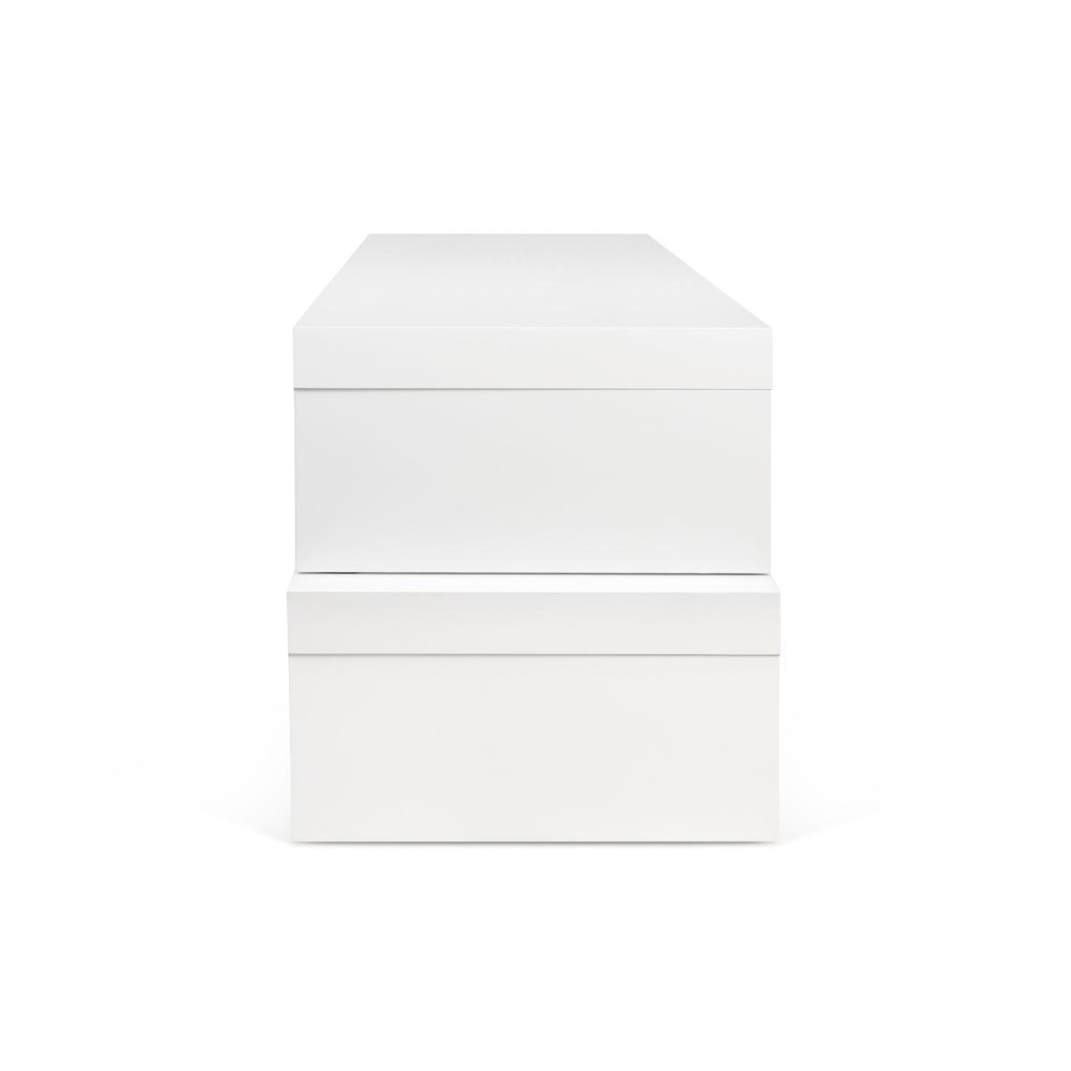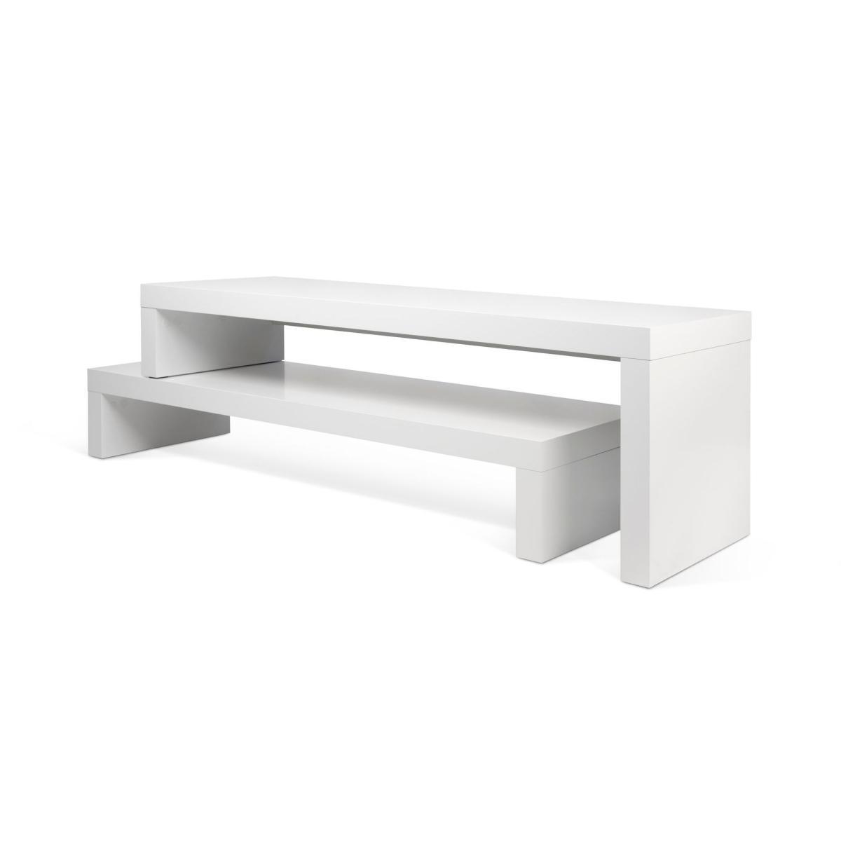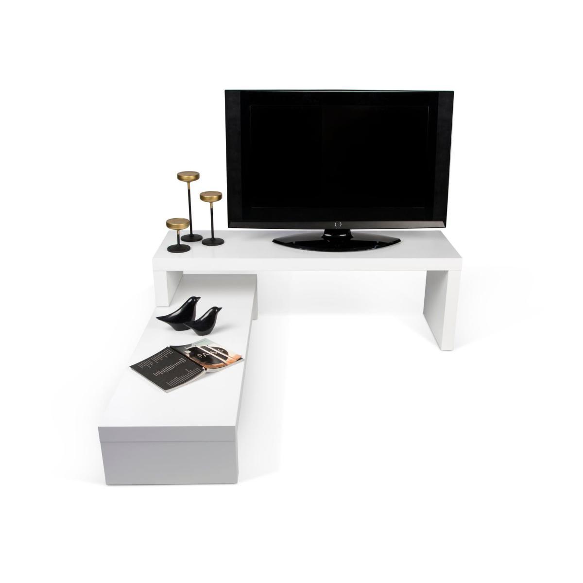This ingenious TV unit is extendible and rotating. With its dynamic design, you can place your multimedia equipment on two levels. It is made up of two sections with complementary shapes which overlap and slot into each other, like jigsaw pieces. The symmetry of the shapes is ultra-graphic. The upper section slides and can be extended in the blink of any eye (L 110 to 235 cm) and can even pivot to form an ultra-functional corner unit. The two sections can be completely fitted one into another, or can be separated by sliding one over the other to increase the length of the unit and to reduce storage space.