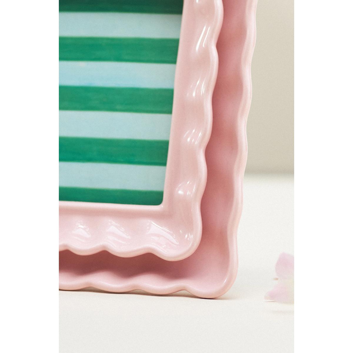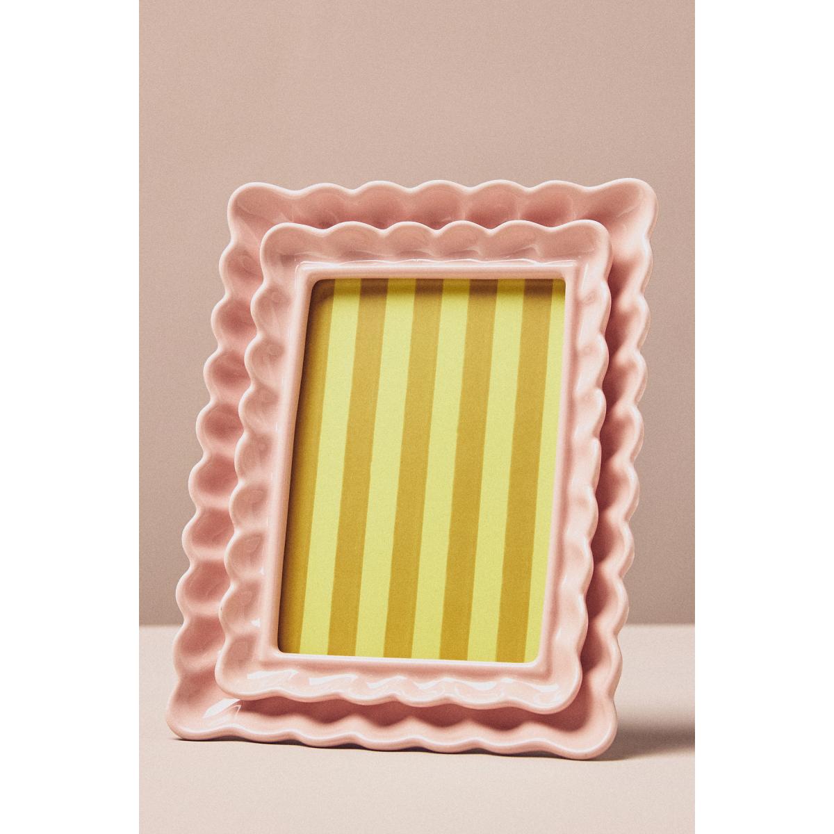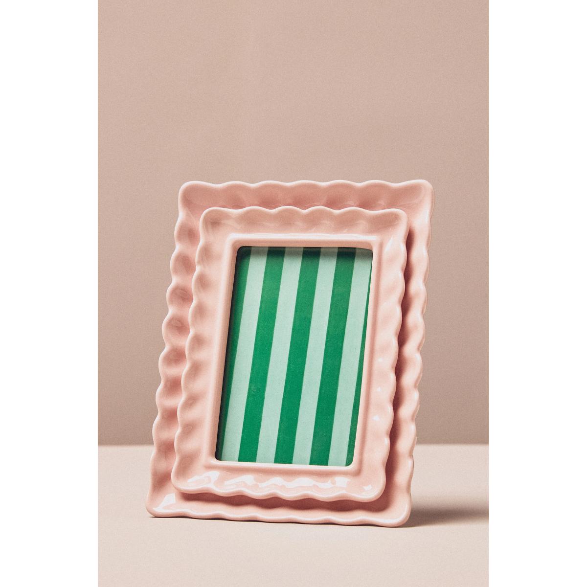 I love this scalloped ceramic frame for its charming, vintage-inspired look that adds a touch of whimsy to any space. It works particularly well in cosy, eclectic interiors or as a playful accent in a pastel palette. The soft pink hue and textured finish make it a great choice for display shelves or side tables in bedrooms, living rooms, or even a girl's nursery. For styling, try grouping it with other ceramic pieces or metallic accessories to create a curated vignette, or let it stand alone to highlight special photographs or artwork. Its timeless yet fun design makes it versatile enough to complement both modern and traditional décors.