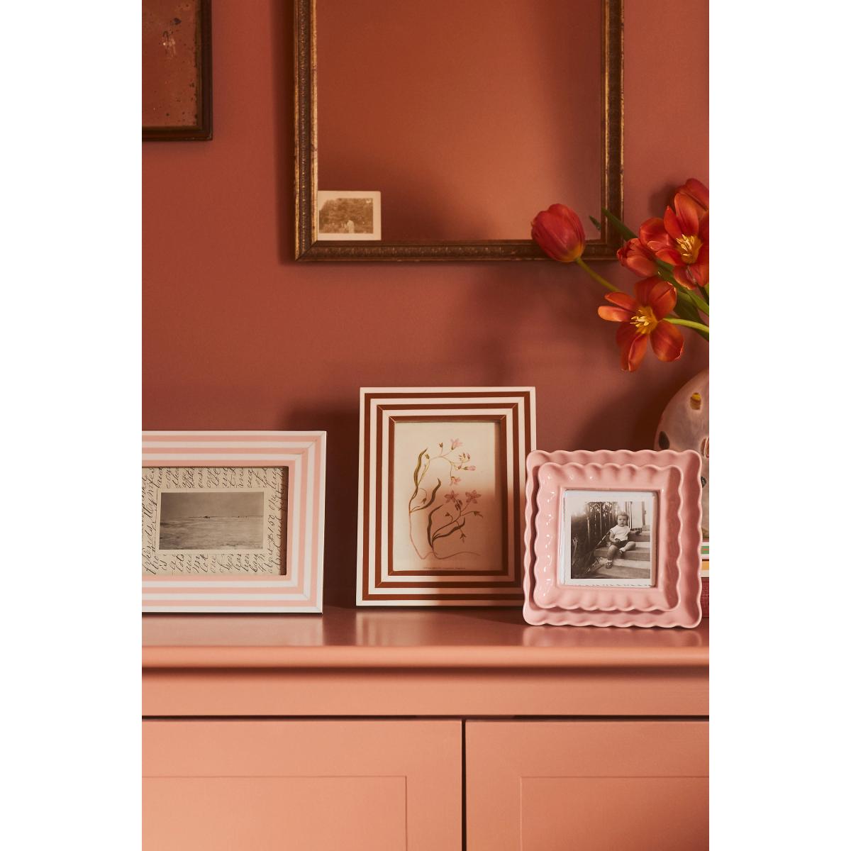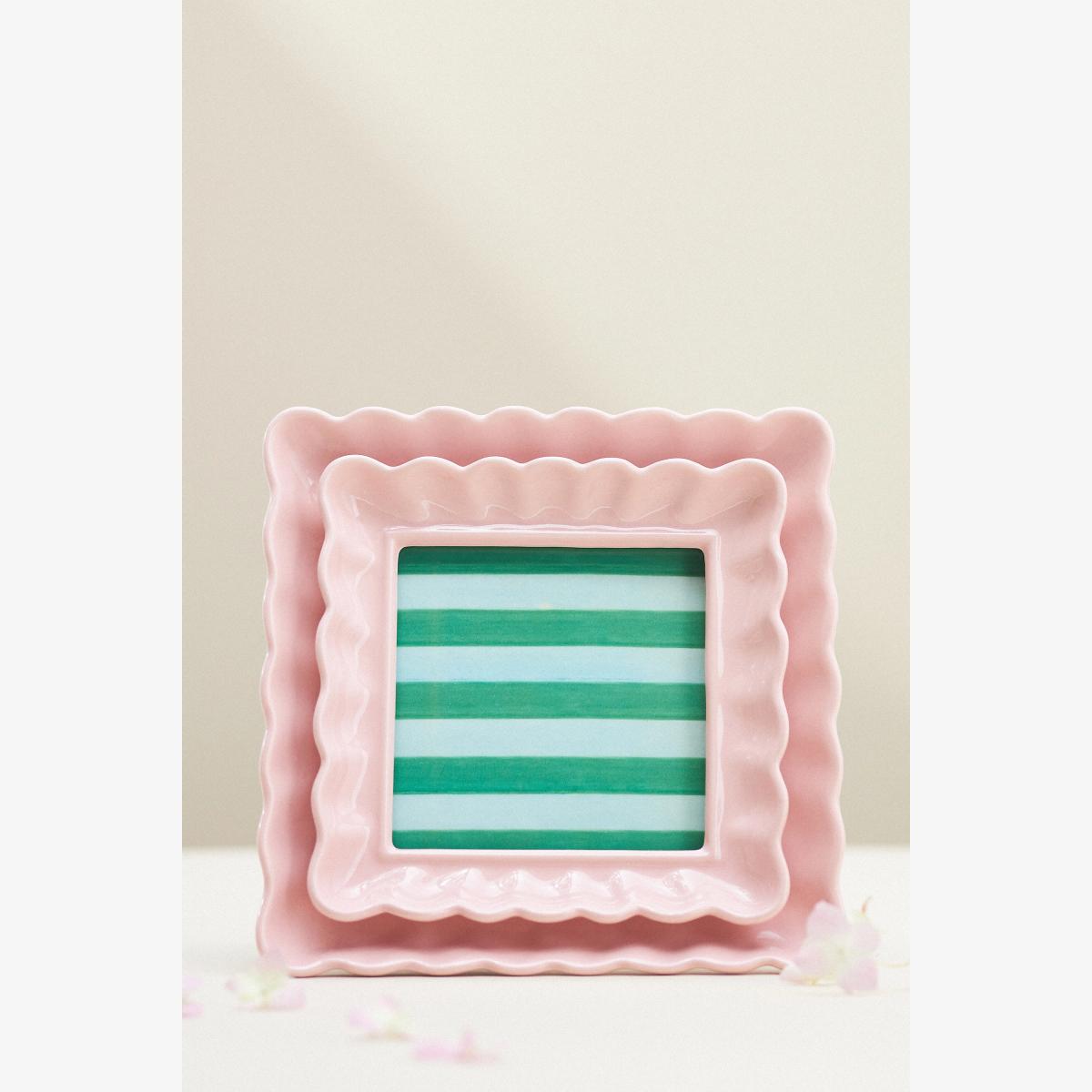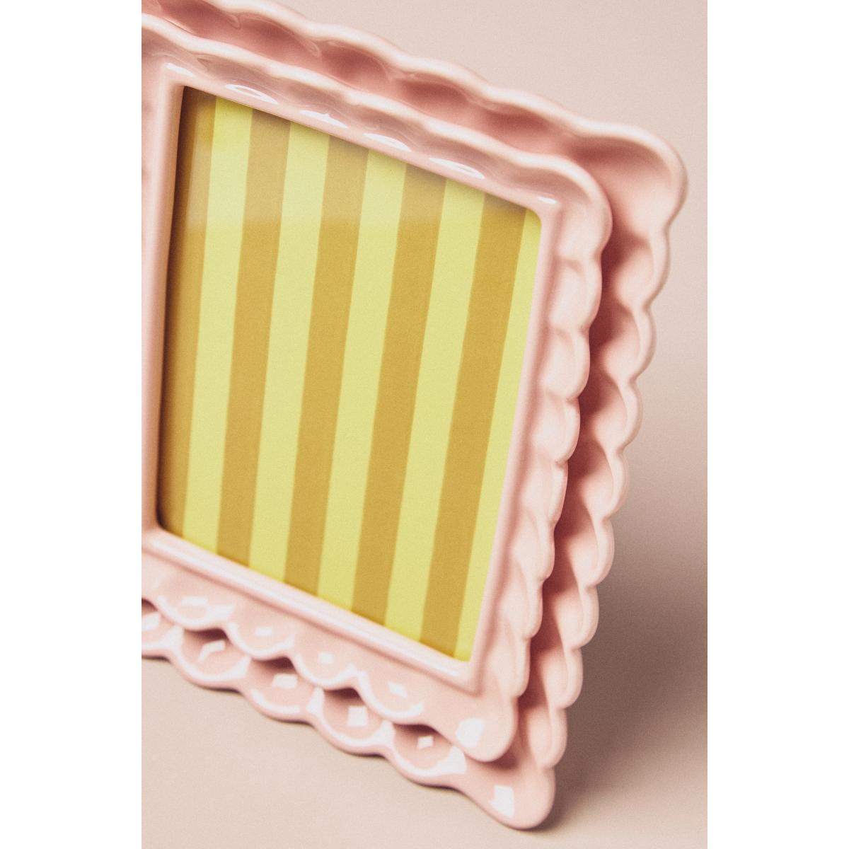 I love this scalloped ceramic frame for its charming, vintage-inspired look that adds a touch of whimsy to any space. It works particularly well in cosy, eclectic interiors or as a playful accent in a pastel palette. The soft pink hue and textured finish make it a great choice for display shelves or side tables in bedrooms, living rooms, or even a girl's nursery. For styling, try grouping it with other ceramic pieces or metallic accessories to create a curated vignette, or let it stand alone to highlight special photographs or artwork. Its timeless yet fun design makes it versatile enough to complement both modern and traditional décors.