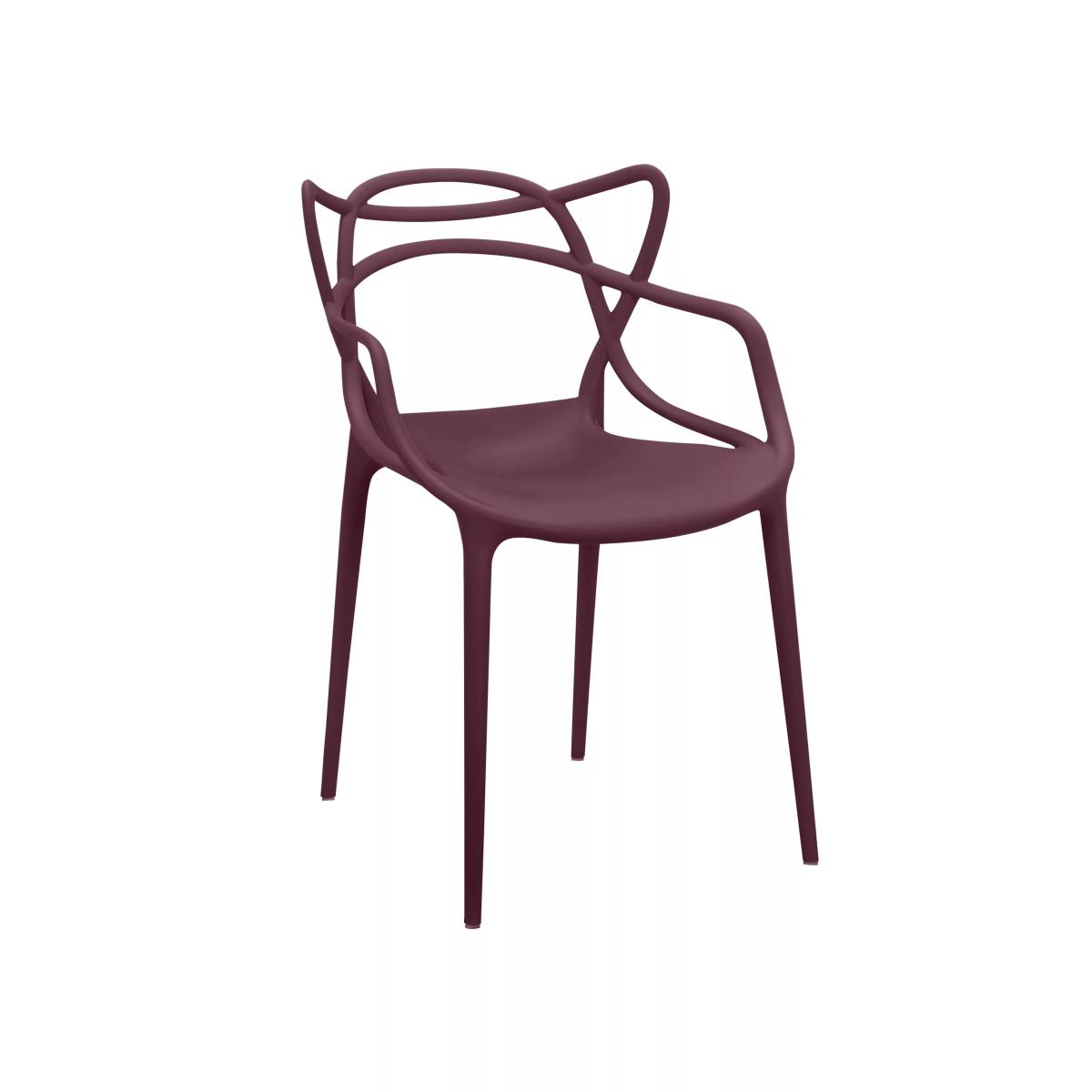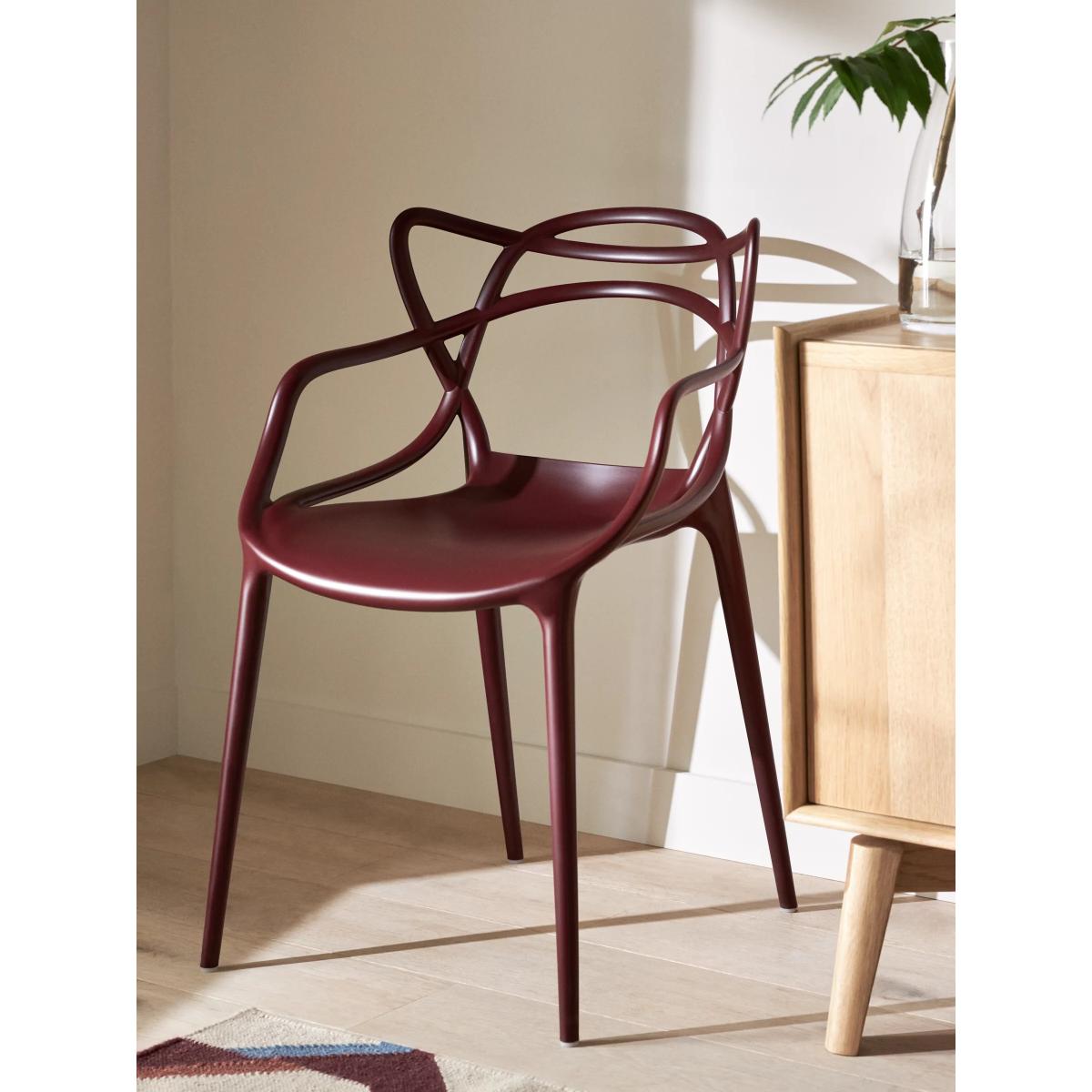 Designed by Philippe Starck in collaboration with Eugeni Quitllet, the Masters chair is a hybrid of three iconic Kartell designs: 'Serie 7' by Arne Jacobsen, the 'Tulip Armchair' by Eero Saarinen and the 'Eiffel Chair' by Charles Eames. The unmistakable silhouettes of these three chairs entwine to create a fusion of original styles. Made from sturdy polypropylene, it's lightweight, practical and stackable and can also be used outdoors. Contains 100% recycled materials.