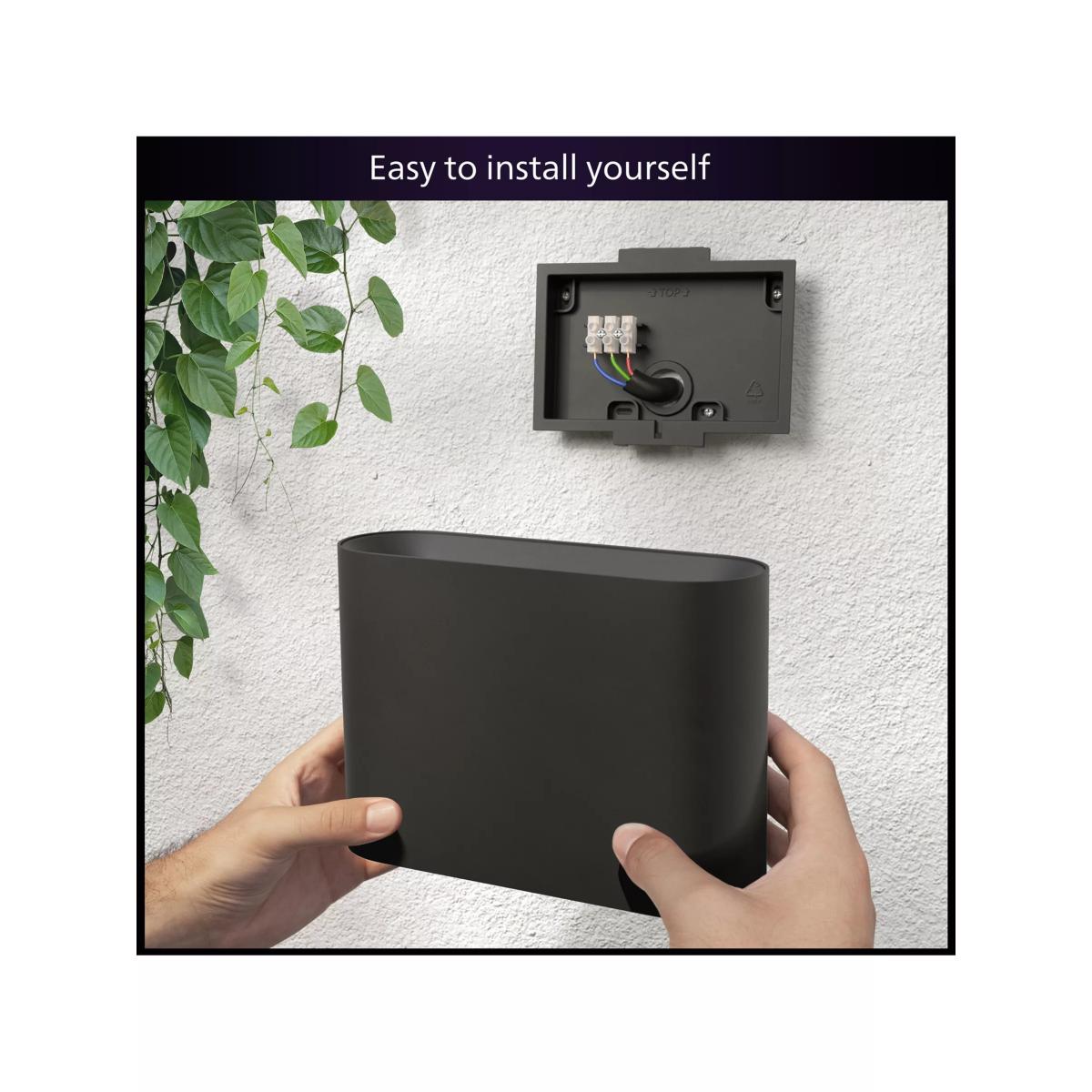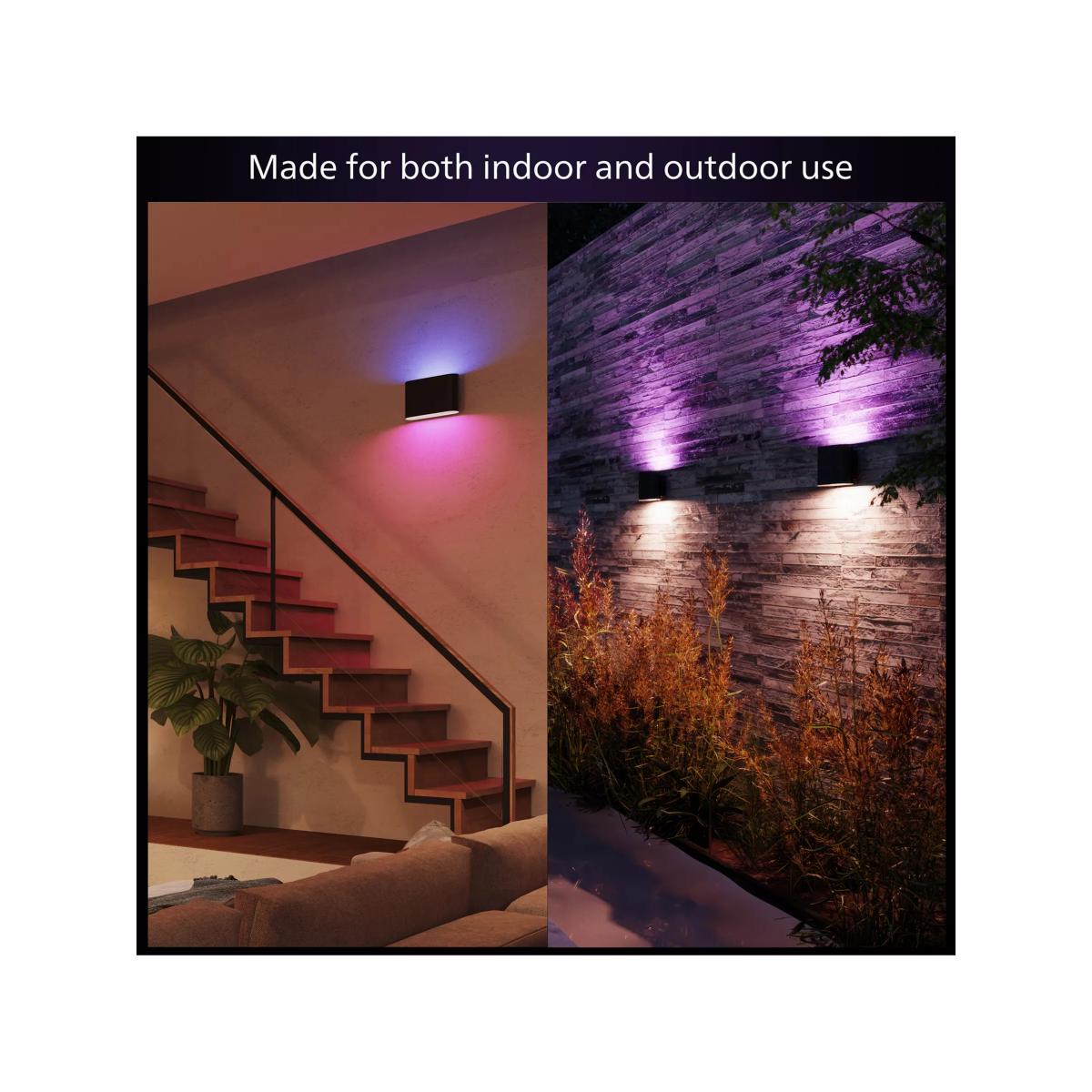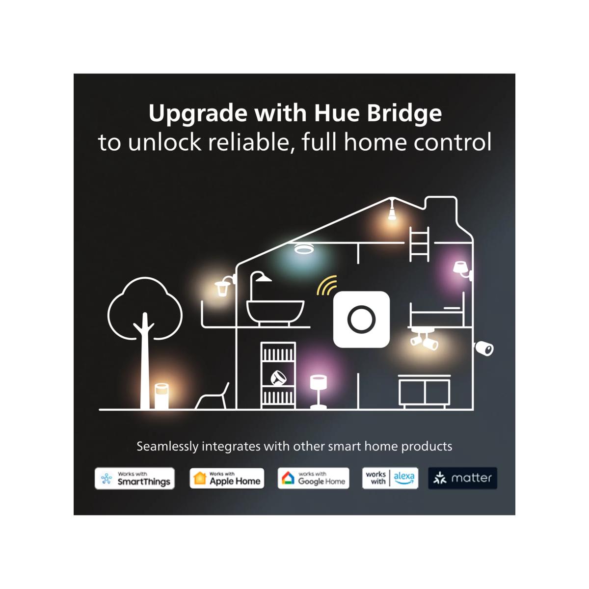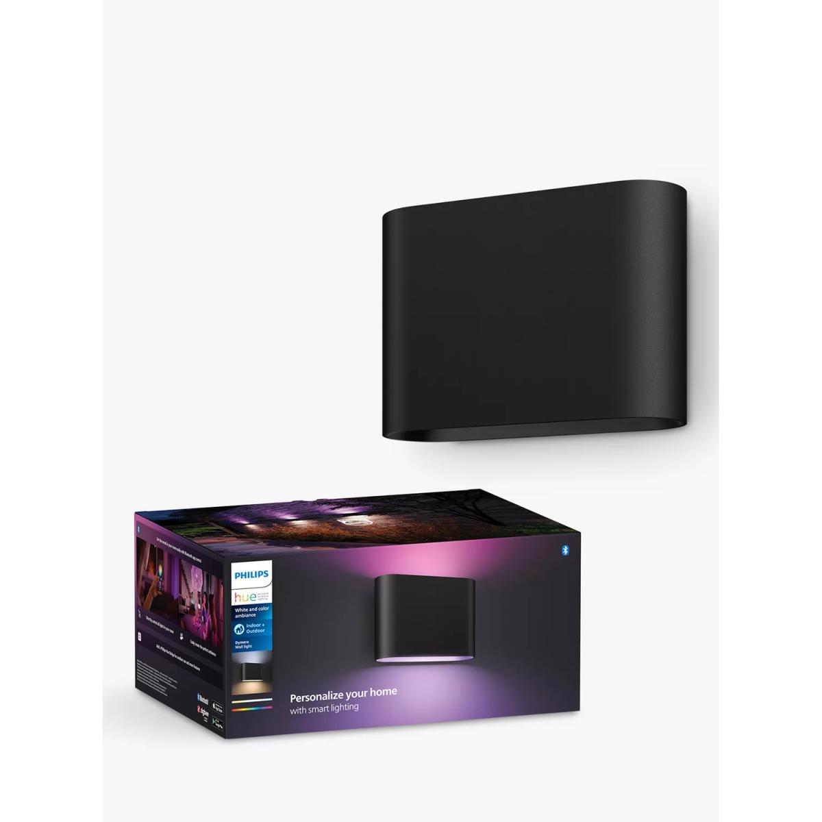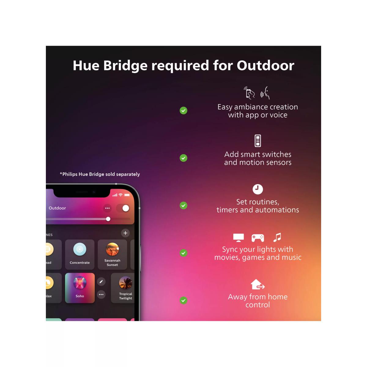 Get a pop of colour on your porch or patio. Featuring both upward and downward light, this indoor or outdoor light adds a touch of sophistication. Individually control the lights to shine in white or any colour. Requires Philips Hue Bridge To use Philips Hue outdoors, you'll need a Hue Bridge, sold separately, which unlocks the full suite of smart lighting features. Control your lights from anywhere, control lights with your voice, automate your lights, get automatic updates — and expand your smart lighting collection outdoors. Colour-changing lights Use your Philips Hue lights to transform your home into a festive experience: bright reds and greens for Christmas, subtle pastels for spring or even an eerie purple glow to create the most haunted house on the street at Halloween. Designed for outdoor environments This Philips Hue outdoor fixture is specially designed for use in outdoor environments and has undergone rigorous tests to ensure its performance. The IP level is described by two figures: the first one refers to the protection level against dust, the second against water. This lamp is designed with IP44: it is protected against water splashed from any direction. This product is ideal for general outdoor use. Smart lighting Connect your Philips Hue lights with the Bridge and start discovering the endless possibilities. Control your lights from your smartphone or tablet via the Philips Hue app, or add the indoor switches to your system to change your lights. Set timers, notifications, alarms and more for the full Philips Hue experience. Philips Hue even works with Amazon Alexa, Apple Homekit and the Google Assistant to allow you to control your lights with your voice.