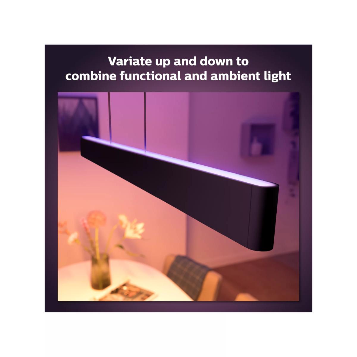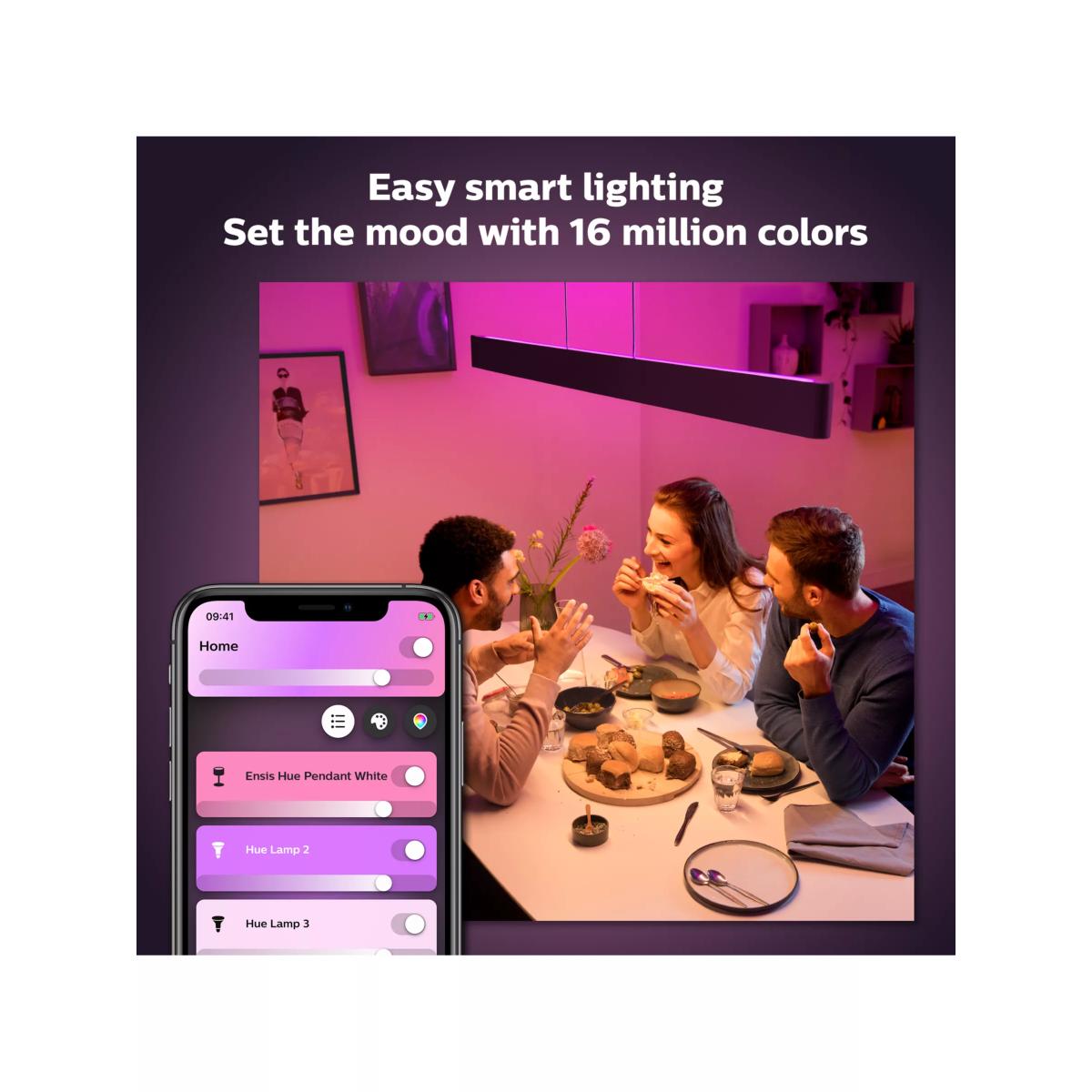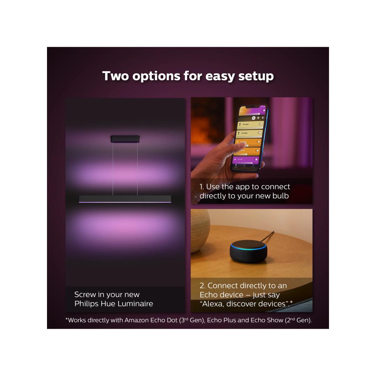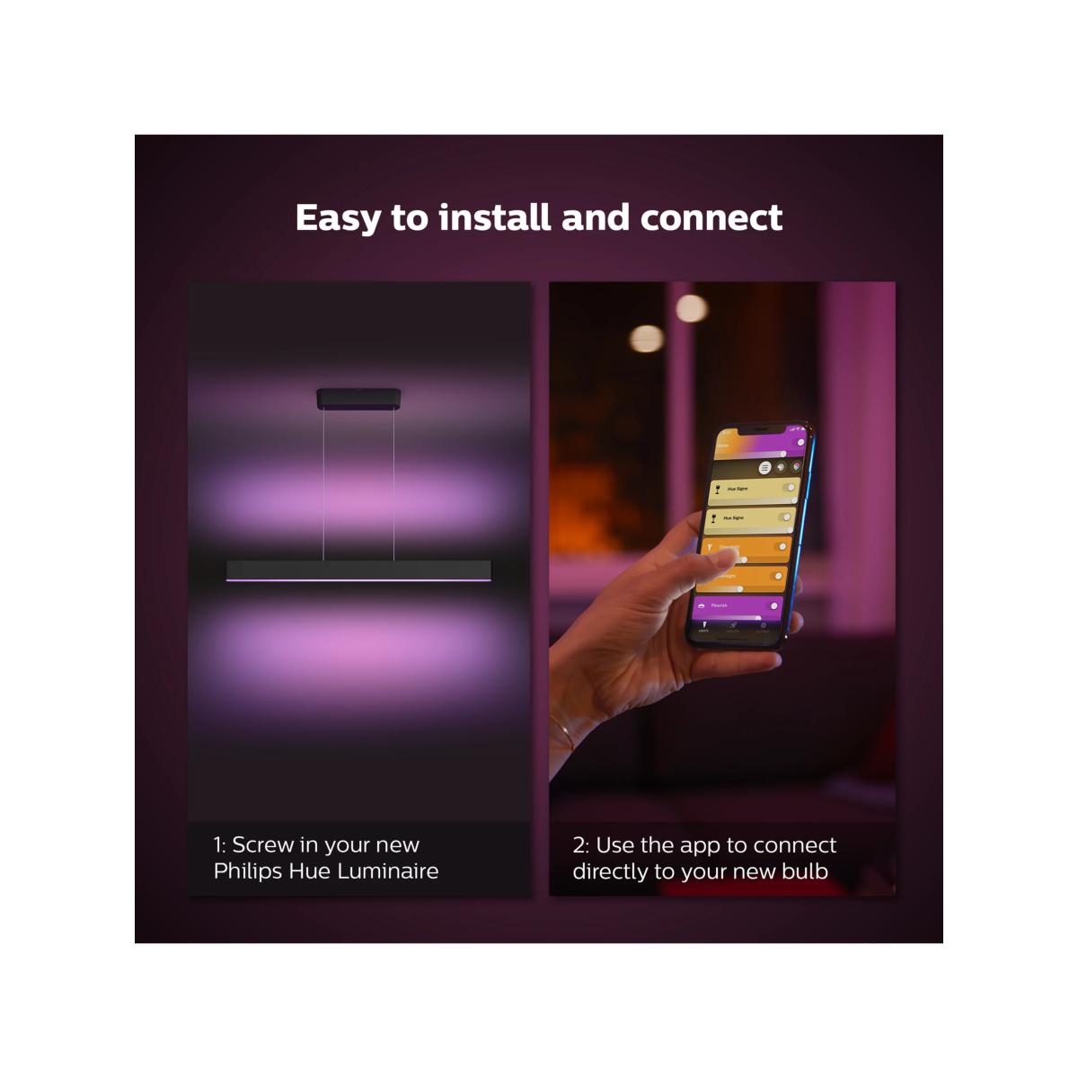 This LED pendant ceiling light will transform your room with coloured light. Smart control straight out of the box This light works with the free Philips Hue Bluetooth app. Simply install it and connect straight away to the Bluetooth app for instant, smart lighting control from anywhere in your home. You can add up to 10 smart lights on to one mobile device. Shades of light Choose from shades of warm-to-cool white light or use millions of colours of light to transform your space. This allows you to create the perfect ambience and choose the best light levels throughout the day, and around your activities. Built-in light recipes Cool-toned, bright-white daylight is best at the start of the day as it helps to energise your body and mind. A soft glow of warm white light is better in the evening and will help you to unwind and relax. Voice-assisted, hands-free control Control this light with simple voice commands. Philips Hue works with Alexa and the Google Assistant when paired with a compatible device. Unlock additional features with the Hue Bridge To experience the full potential of this smart light, connect to a Philips Hue Bridge (optional extra, available to purchase separately). Additional Philips Hue features include: setting timers and routines with light, controlling your lights remotely and automating your entire smart home lighting set up. There's also the option to add other accessories, including motion sensors and smart switches.