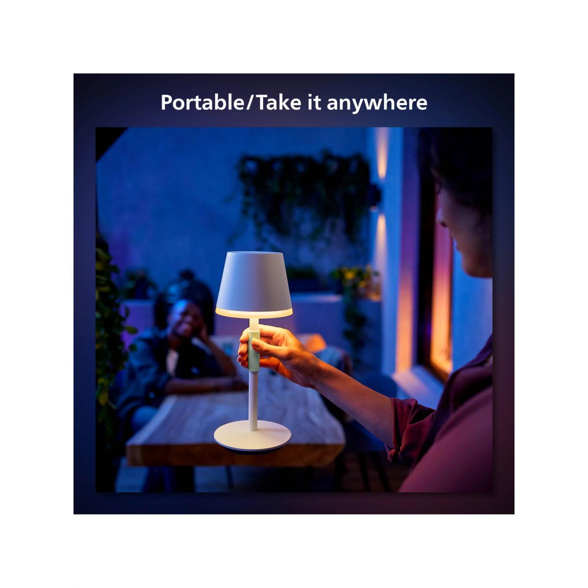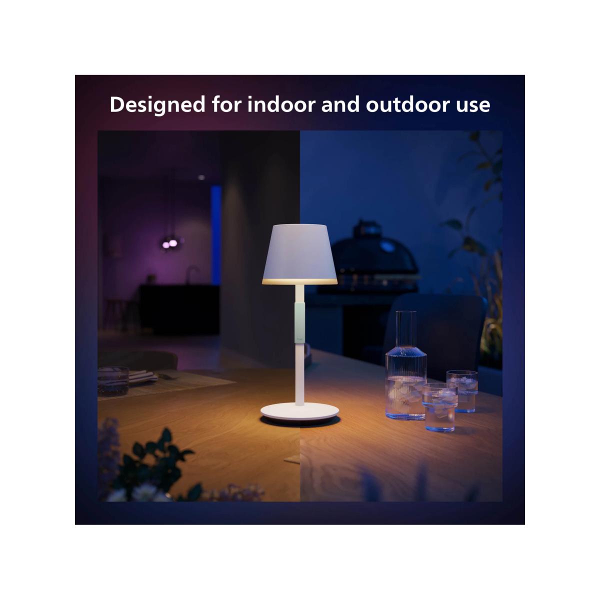 Take this portable smart light anywhere you want. Rated for outdoor use and featuring a silicone grip, it's easy to carry where you need light most. Philips Hue Bridge Philips Hue Bridge compatible, for smart lighting control and available to purchase separately. Once connected, you'll experience the full potential of this smart light and can use the Philips Hue app to control it from your smart phone or tablet. Choose from white or coloured light Use light to create the perfect ambience throughout the day. Extend your evenings with warm white light or transform your outdoor space with colour, ideal for parties.