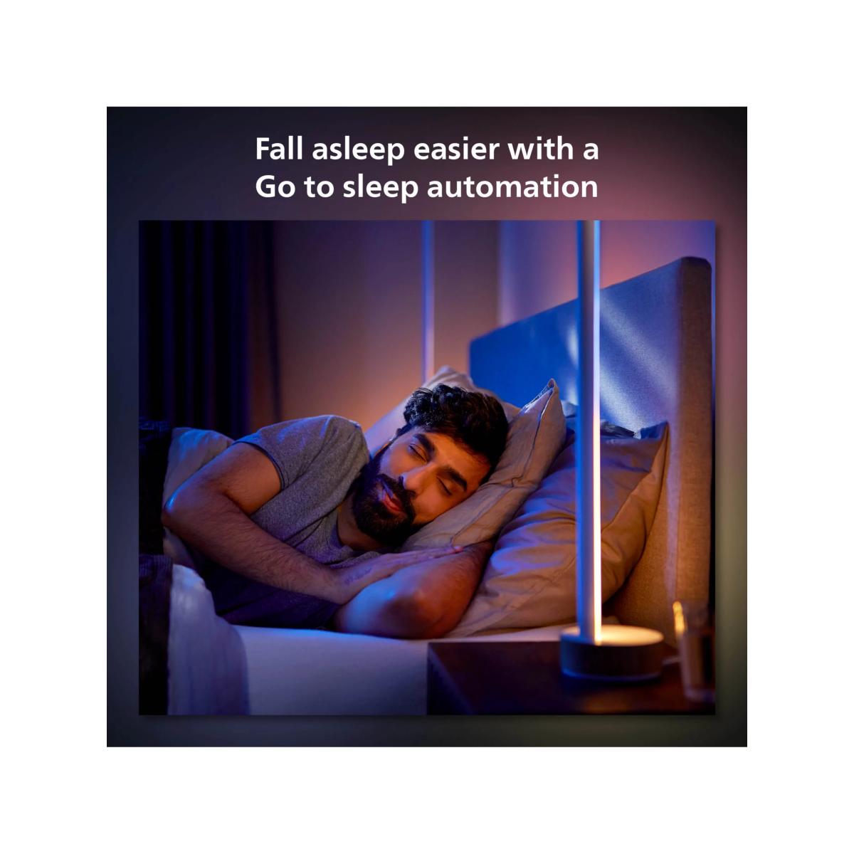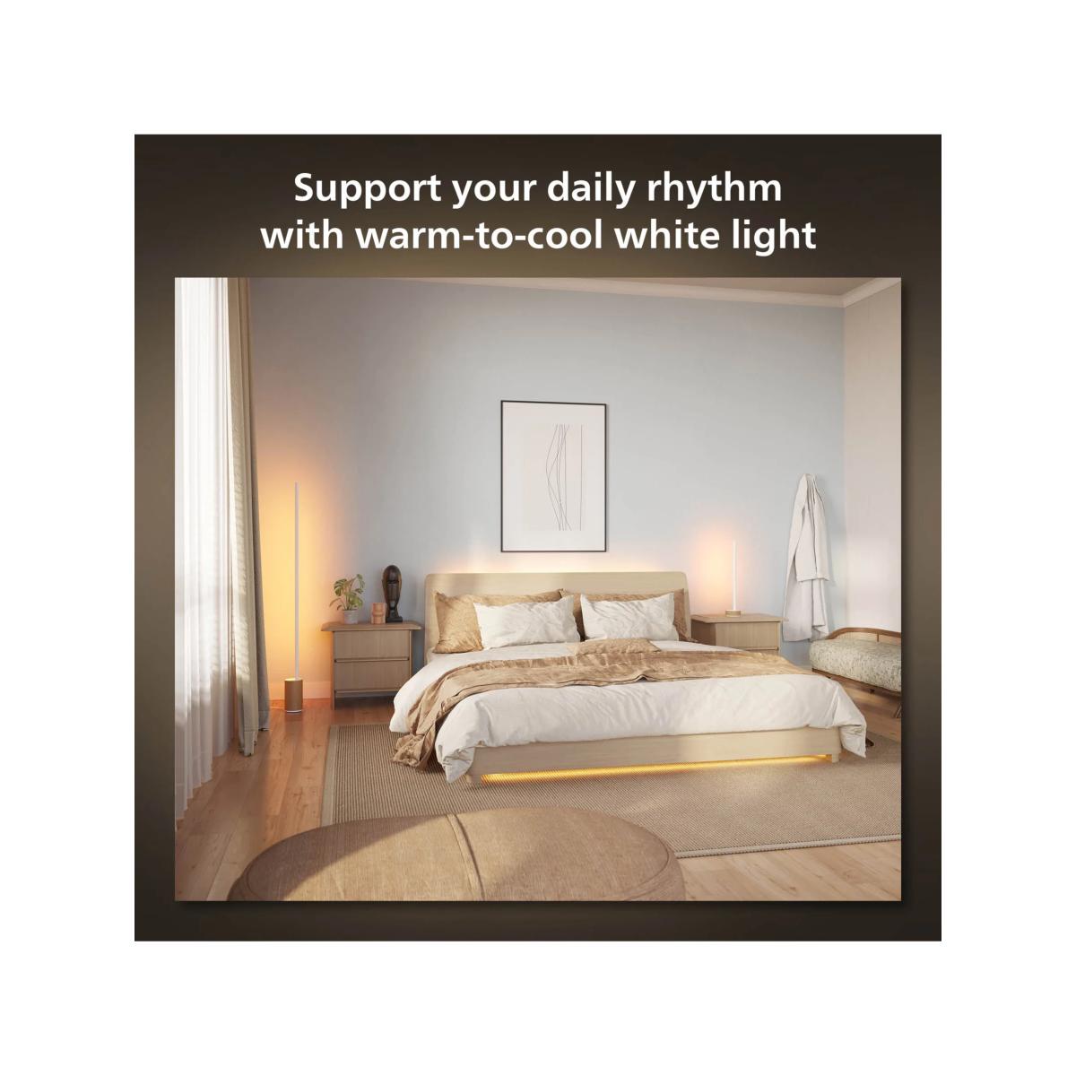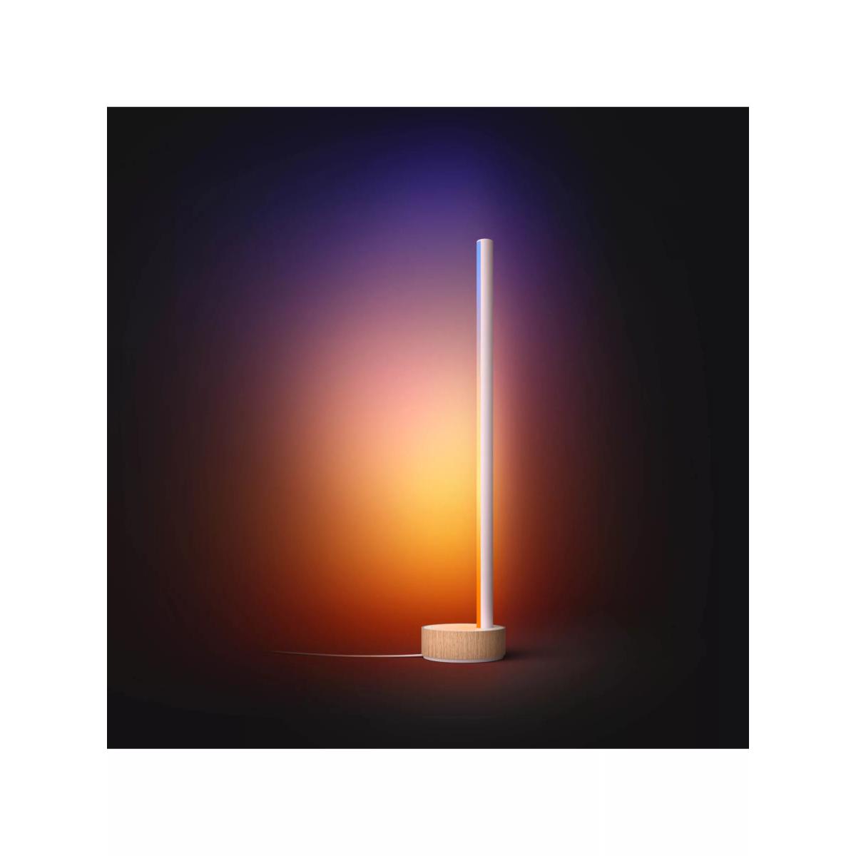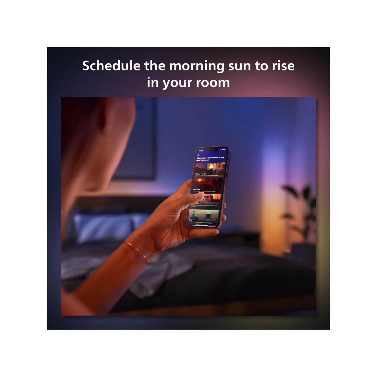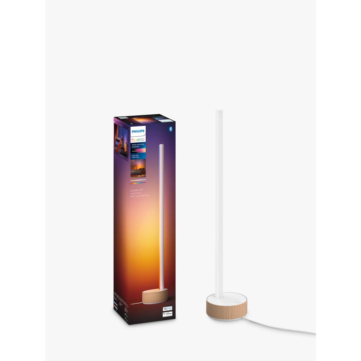 Wake up to the morning sun, scheduled to rise at your convenience. Featuring a wood-toned base, slender design and brilliant blend of colourful light, this table lamp is both a statement piece and a subtle accent for your sleep or living space. Get a gradient of colourful light with the Signe Gradient table lamp from Philips Hue. Create dynamic light scenes that blend any of millions of colours. You can control it directly from your smart device with Bluetooth, add the Hue Bridge for full connected smart light features, and even sync it to your TV for lighting that matches your home entertainment with the Hue Sync box. The Hue Bridge and Sync box are both sold separately. Play with colour Choose from 16 million colours including warm to cool white light to create an ambiance that suits any mood. Perfect for film nights, parties, bedtime stories, or just relaxing. Control lights with your voice Works with Alexa and Google Assistant devices for hands-free voice control. Voice control requires set up with the Hue Bridge (sold separately). Bluetooth With the Hue Bluetooth app (available on iO. S and Android), you can control this light directly from your smart phone, without the need for the Hue bridge. The app can control up to ten lights. Unlock all smart features with the Hue Bridge Add a Hue Bridge (sold separately) to your smart lights to experience the full suite of Philips Hue features. With a Hue Bridge, you can add up to 50 smart lights to control throughout the home, create routines, and control lights while away from home. Sync your lights with entertainment with the Hue Sync box And if you add the Hue sync box too (also sold separately) you can augment your home entertainment with synchronised lighting. Enjoy your smart lighting matching the colours or rhythms of your films, music or games.