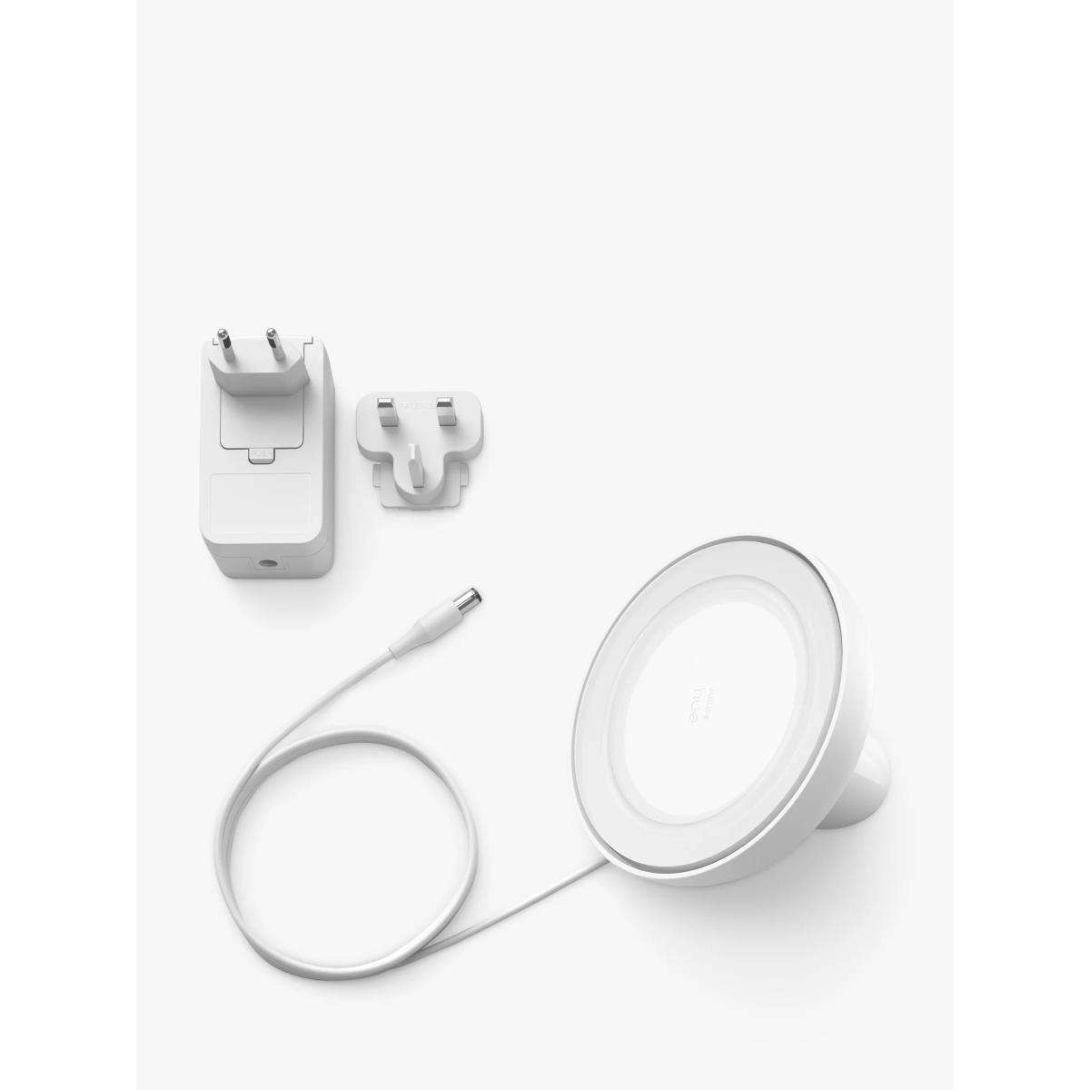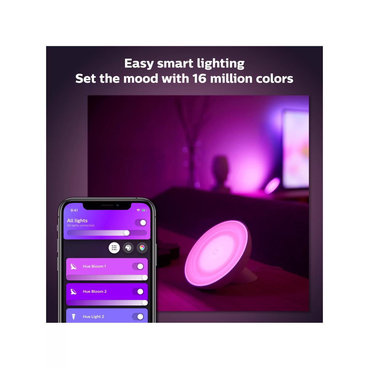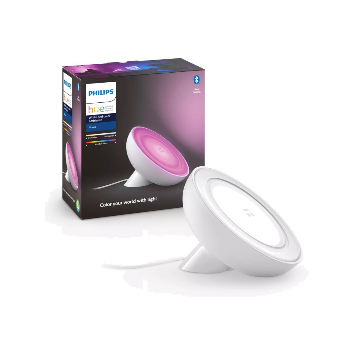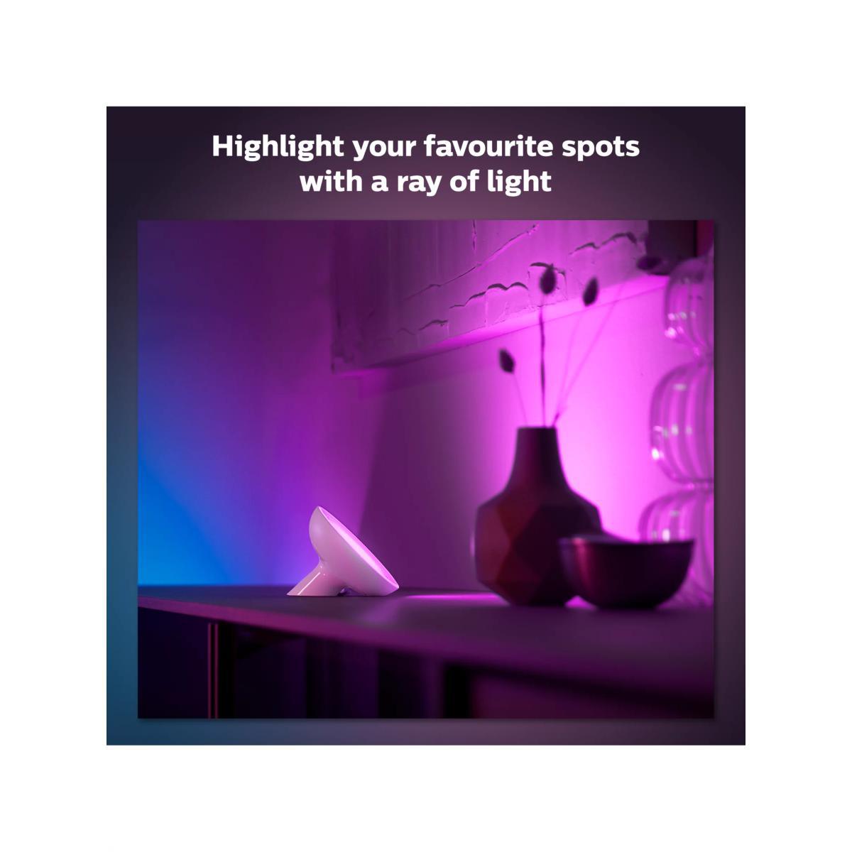 Designed with an integrated LED, this petite and portable table lamp provides a powerful, colour-changing light that creates wherever it's placed. It's equipped with smart Philips Hue technology and it can be used wherever a power socket is available, making it ideal on shelves, desks or even your bedside table. What's more, it's easier than ever to control as you can use it with Bluetooth or other compatible voice-controlled devices. Colourful, smart light Transform your space with accents of coloured light. You can dim down the intensity and blend soft colour tones for smooth light effects, making this lamp perfect for parties as well as quiet evenings at home. Smart control straight out of the box This light works with the free Philips Hue Bluetooth app. Simply install your new Hue light and connect to the Bluetooth app for instant, smart lighting control. Voice-assisted, hands-free control Control these lights with simple voice commands. It's compatible with Alexa, Apple Home Kit and Google Assistant devices. Apps to help you unlock more With the Philips Hue iO. S and Android apps, you can control this light directly from your smart phone. The app can control up to ten smart lights. Unlock additional features with the Hue Bridge To experience the full potential of this smart light, connect to a Philips Hue Bridge (optional extra, available to purchase separately). Additional Philips Hue features include: setting timers and routines with light, controlling your lights remotely and automating your entire smart home lighting set up. There's also the option to add other accessories, including motion sensors and smart switches.