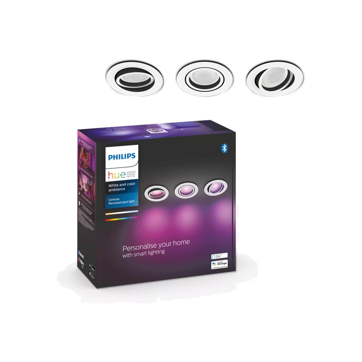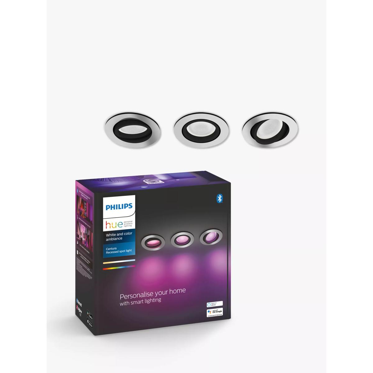 These smart spotlights from Philips provide a direct glow of light exactly where you need it. Supplied as handy three-pack, their recessed design is discreet and unobtrusive, allowing you to create the perfect ambience in your space with shades of white or coloured light. The powerful LED technology will transform the look and feel in your room and what's more, they're easier than ever to operate thanks to a compatible Bluetooth app. Or, try simple voice commands and extend with the Hue Bridge for additional features. Smart control straight out of the box These lights work with the free Philips Hue Bluetooth app. Simply install your new Hue lights and connect to the Bluetooth app for instant, smart lighting control from anywhere in your home. Shades of light Choose from over 50,000 shades of warm-to-cool white light or use millions of colours of light to transform your space. This allows you to create the perfect ambience and choose the best light levels throughout the day, and around your activities. Built-in light recipes Cool-toned, bright-white daylight is best at the start of the day as it helps to energise your body and mind. A soft glow of warm white light is better in the evening and will help you to unwind and relax. Voice-assisted, hands-free control Control this light with simple voice commands. Philips Hue works with Alexa and the Google Assistant when paired with a compatible device. To use voice control with Apple Home. Kit, add a Hue Bridge to your system. Unlock additional features with the Hue Bridge To experience the full potential of these smart lights, connect to a Philips Hue Bridge. This is an optional extra and it's available to purchase separately. Additional Philips Hue features include: setting timers and routines with light, controlling your lights remotely and automating your entire smart home lighting set up. There's also the option to add other accessories, including motion sensors and smart switches.