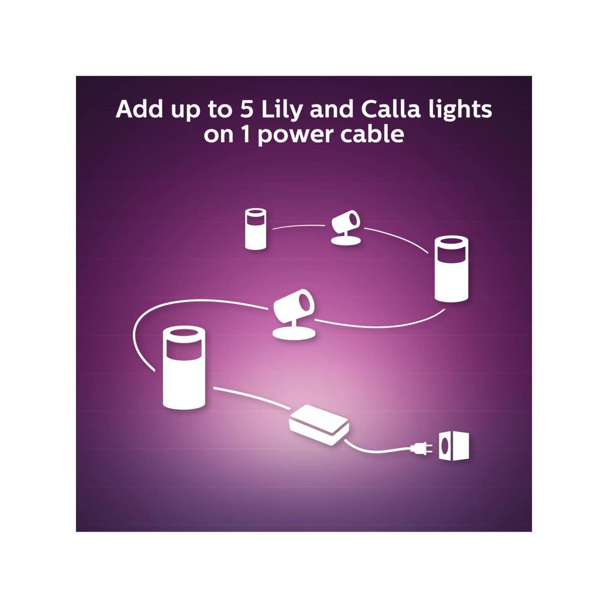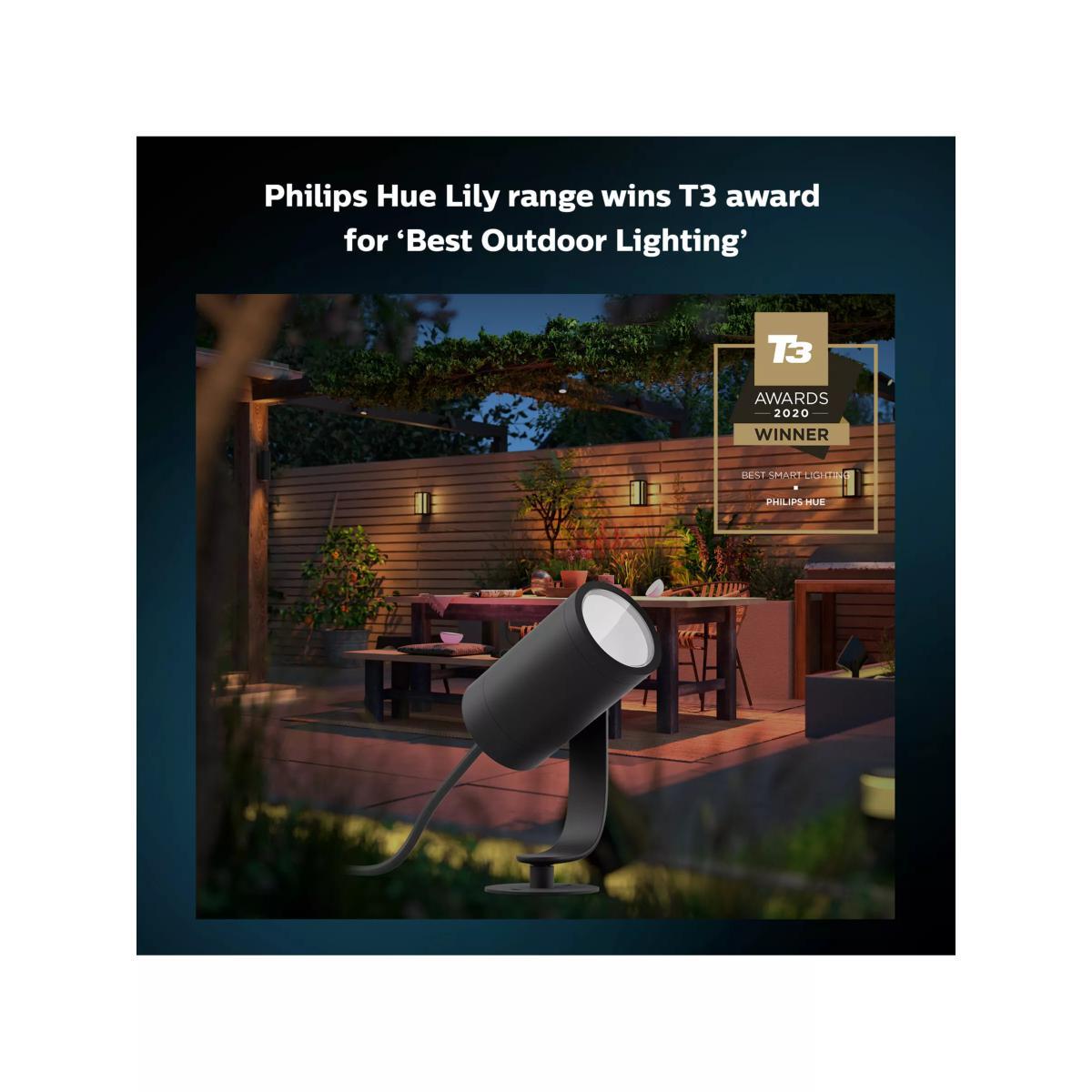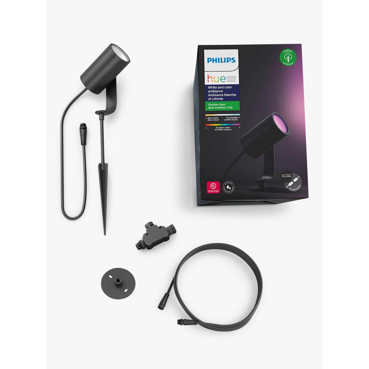 Plug in the Philips Hue Lily Spotlight extension and enjoy 16 million colours of shades of white light to highlight the beauty of your outdoor spaces. This extension includes one light point and requires the Lily base unit, or a 40/100W power supply unit to operate. The included detachable shield helps to reduce glare. It also requires a Philips Hue Bridge. You'll need a Philips Hue Bridge to experience smart control of this light. It's available to purchase separately and allows you to set timers and routines and control it directly from your smartphone or tablet Specifically designed for use in outdoor environments, this fixture is IP65 rated and has undergone rigorous tests to ensure its performance, especially against low-pressure jets of water Use the Philips Hue app to save your favourite light settings and recall them with the tap of a finger, or cycle through shades of cool, white light to vibrant colours