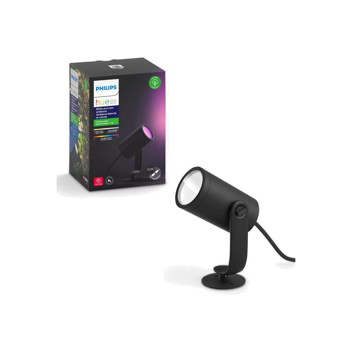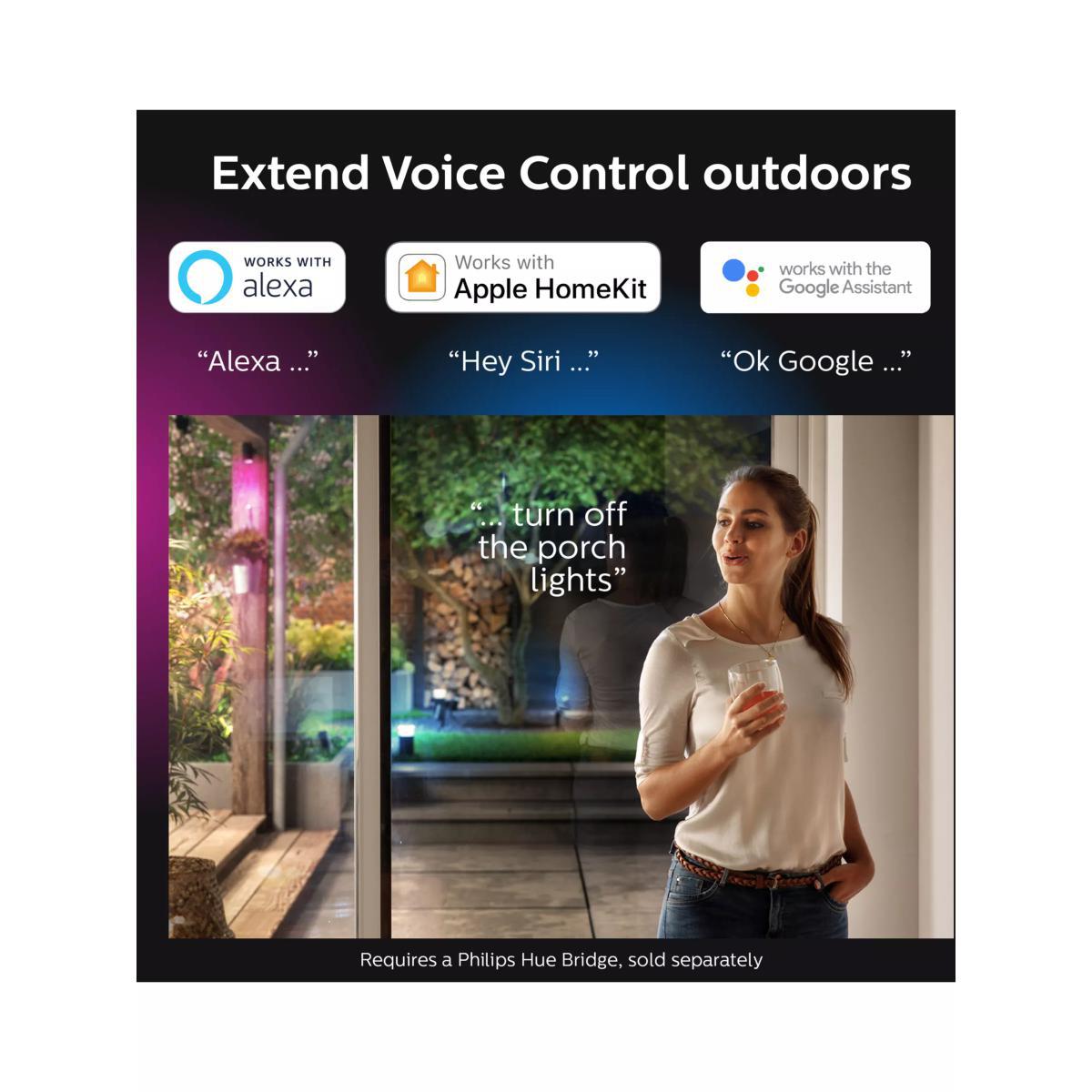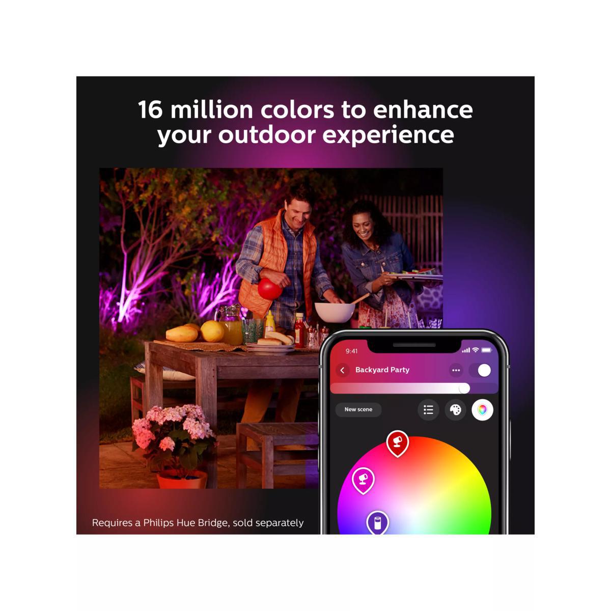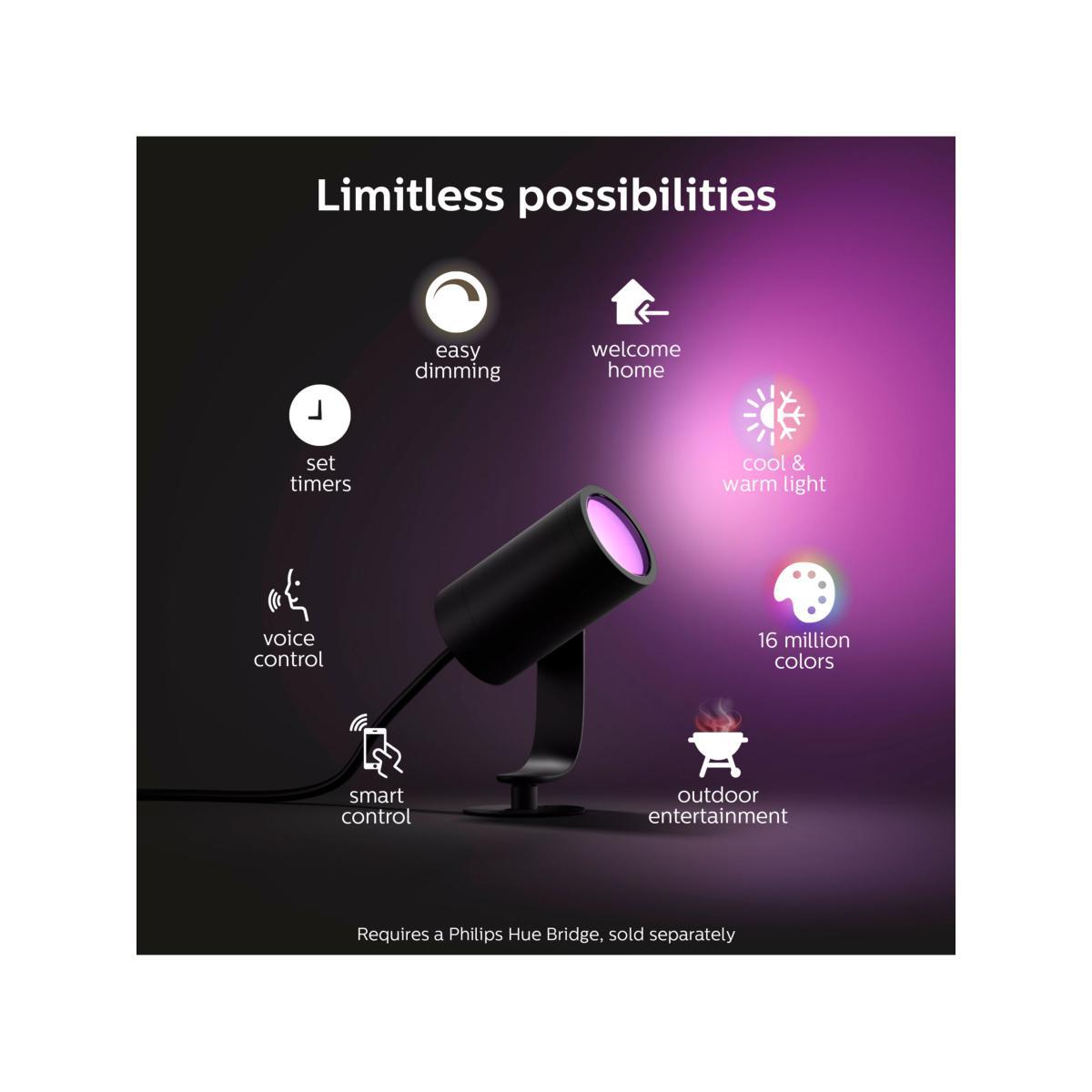 Plug in the Philips Hue Lily Spotlight extension and enjoy 16 million colours of shades of white light to highlight the beauty of your outdoor spaces. This extension includes one light point and requires the Lily base unit, or a 40/100W power supply unit to operate. The included detachable shield helps to reduce glare. It also requires a Philips Hue Bridge. You'll need a Philips Hue Bridge to experience smart control of this light. It's available to purchase separately and allows you to set timers and routines and control it directly from your smartphone or tablet Specifically designed for use in outdoor environments, this fixture is IP65 rated and has undergone rigorous tests to ensure its performance, especially against low-pressure jets of water Use the Philips Hue app to save your favourite light settings and recall them with the tap of a finger, or cycle through shades of cool, white light to vibrant colours
