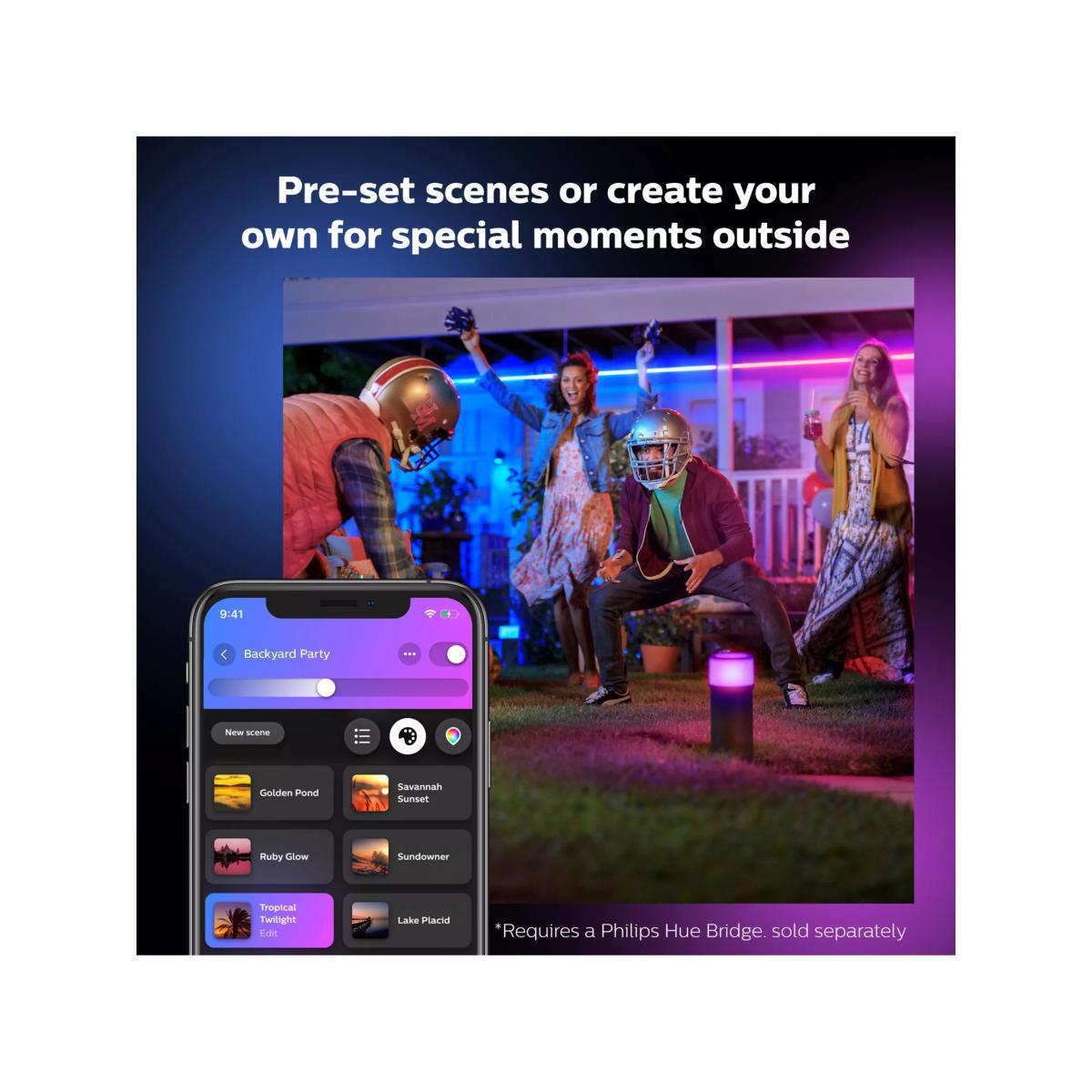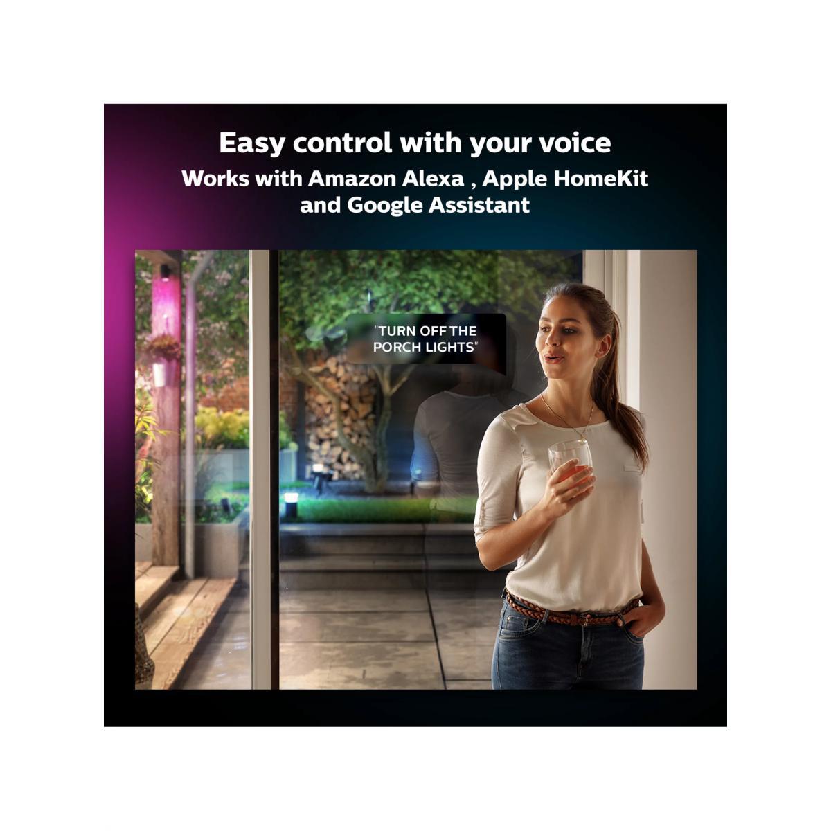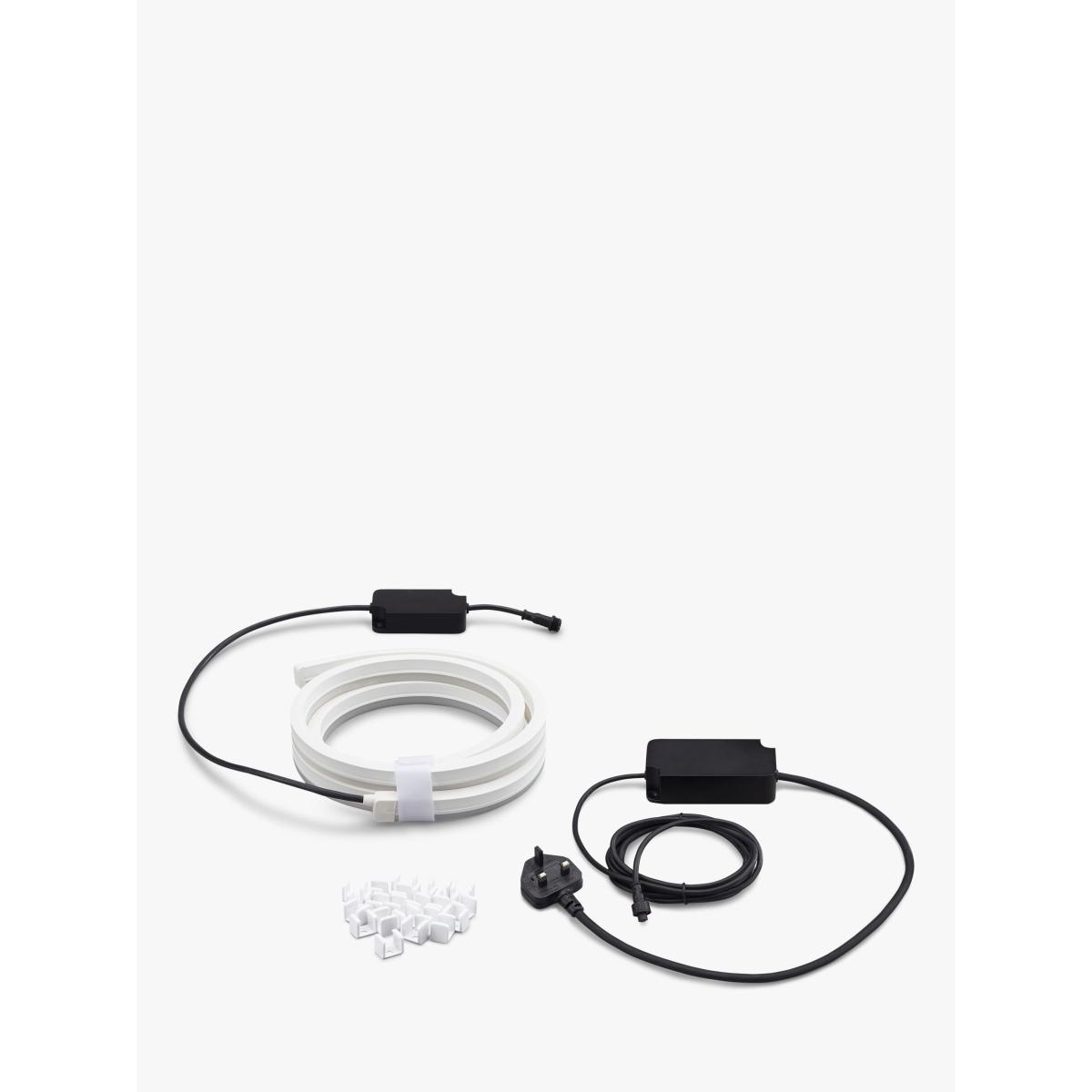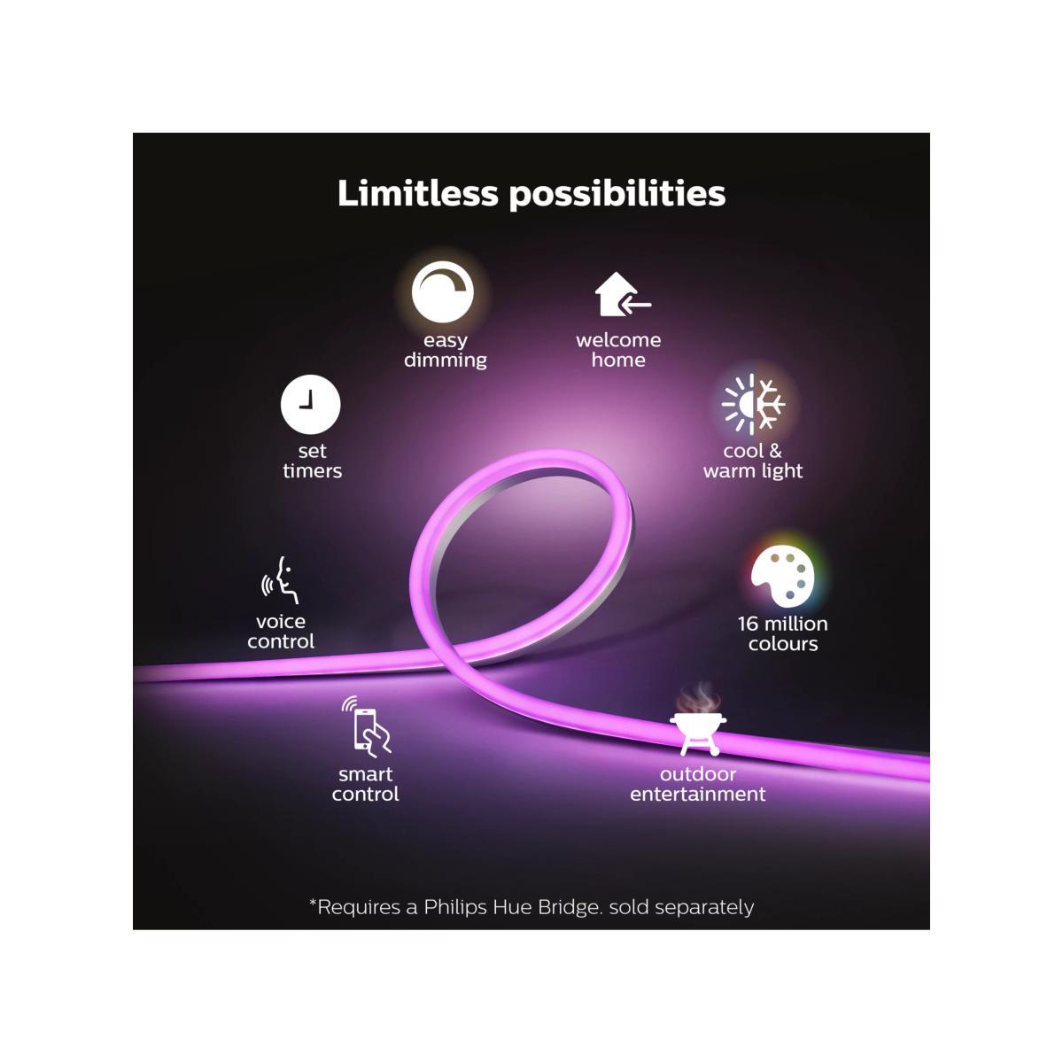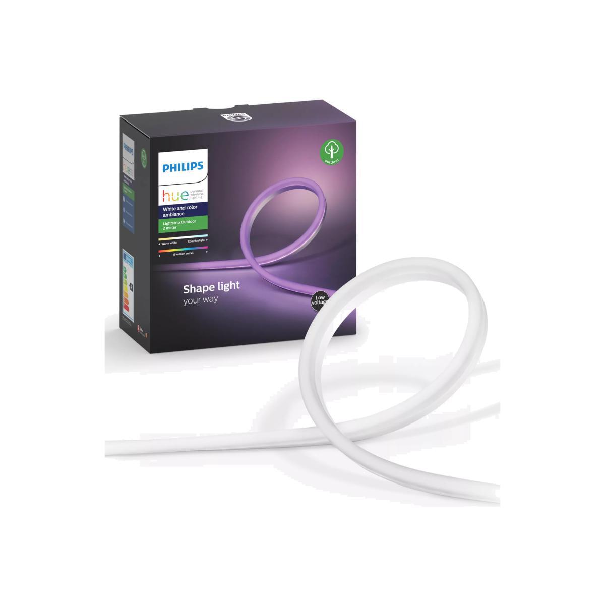 Illuminate your outdoor space with this low voltage LED Lightstrip. It's two metres in length and equipped with Philips Hue technology, so you can decorate your space with colour or illuminate pathways with warm shades of light. A Philips Hue Bridge is required for smart control of this lightstrip, and it's available to purchase separately. This lightstrip is IP65 rated and can withstand all weather conditions Install your Hue Bridge, then install the light using the manual provided and then discover its range of features using the compatible Philips Hue App, available on iO. S and Android With 16 million colours and shades of warm and cool light, this lightstrip is ideal for outdoor entertainment Control this light with simple voice commands for hands-free control. It's compatible with Alexa, Google Assistant and Apple Home Kit devices