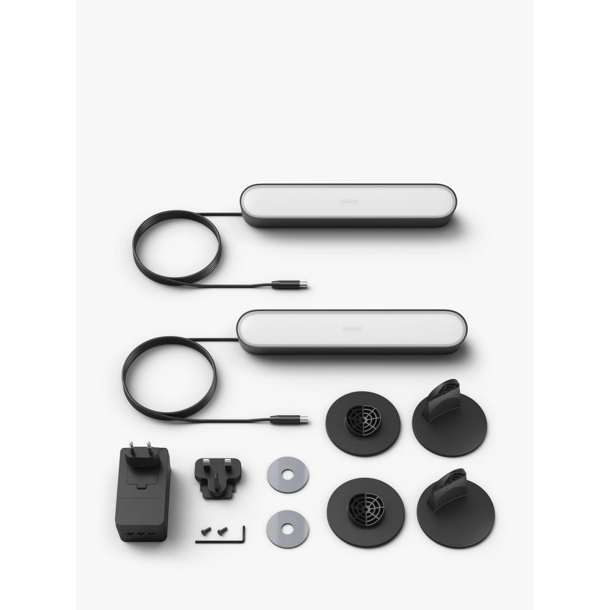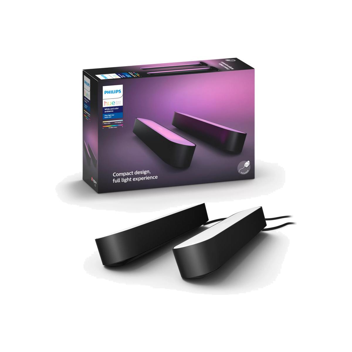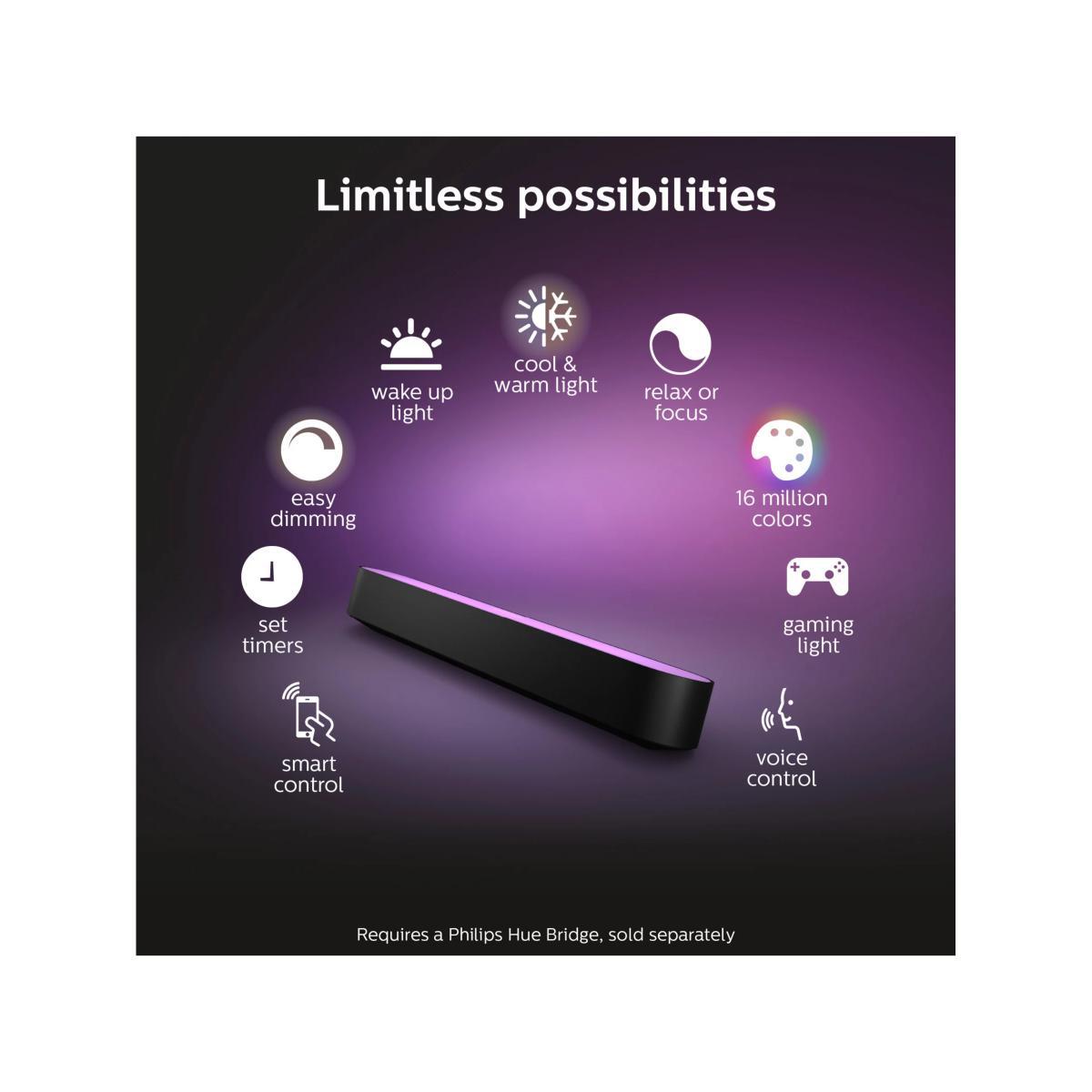 T3 Awards Winner 2018 - Best Connected Lighting - Philips Hue The Hue Play Light Bar creates a vibrant ambiance, with 16 million colour variations for different lighting effects. Lay it on the floor, stand it on furniture, or mount it on the back of your TV for beautifully variable illumination at home. Use the Hue app on your iO. S or Android smart device to control remotely, choose preset 'scenes', set timers, and more. Create your ambiance With 16 million colour variations to choose from, you can set Hue to the mood that suits you. Colours can be saved as 'Scenes', so you can revisit your favourites, or you can choose from available presets. Programmable Hue can be tailored to your life with alarms, timers and alerts, so you can set Hue to wake you up with a soft sunrise glow, or to turn all of your Hue lights off at bedtime. You can set your lights to come on when you're away, to deter thieves, or control them remotely via the app, from anywhere with Wi-Fi. Hue is compatible with Amazon Alexa, Apple Home Kit and Google Home devices for voice control of your lights. Limitless possibilities With the 'Hue' app (available on iO. S and Android), you can control your lights from anywhere with Wi-Fi via your smart device. Perfect TV backlight Synchronise lighting to music with the Hue Sync app Connect up to 3 Hue Plays to one mains plug socket Hue Plays require the separate Hue Bridge to connect to your home network. Hue Bridge is available separately, or as part of a Hue Starter Kit.