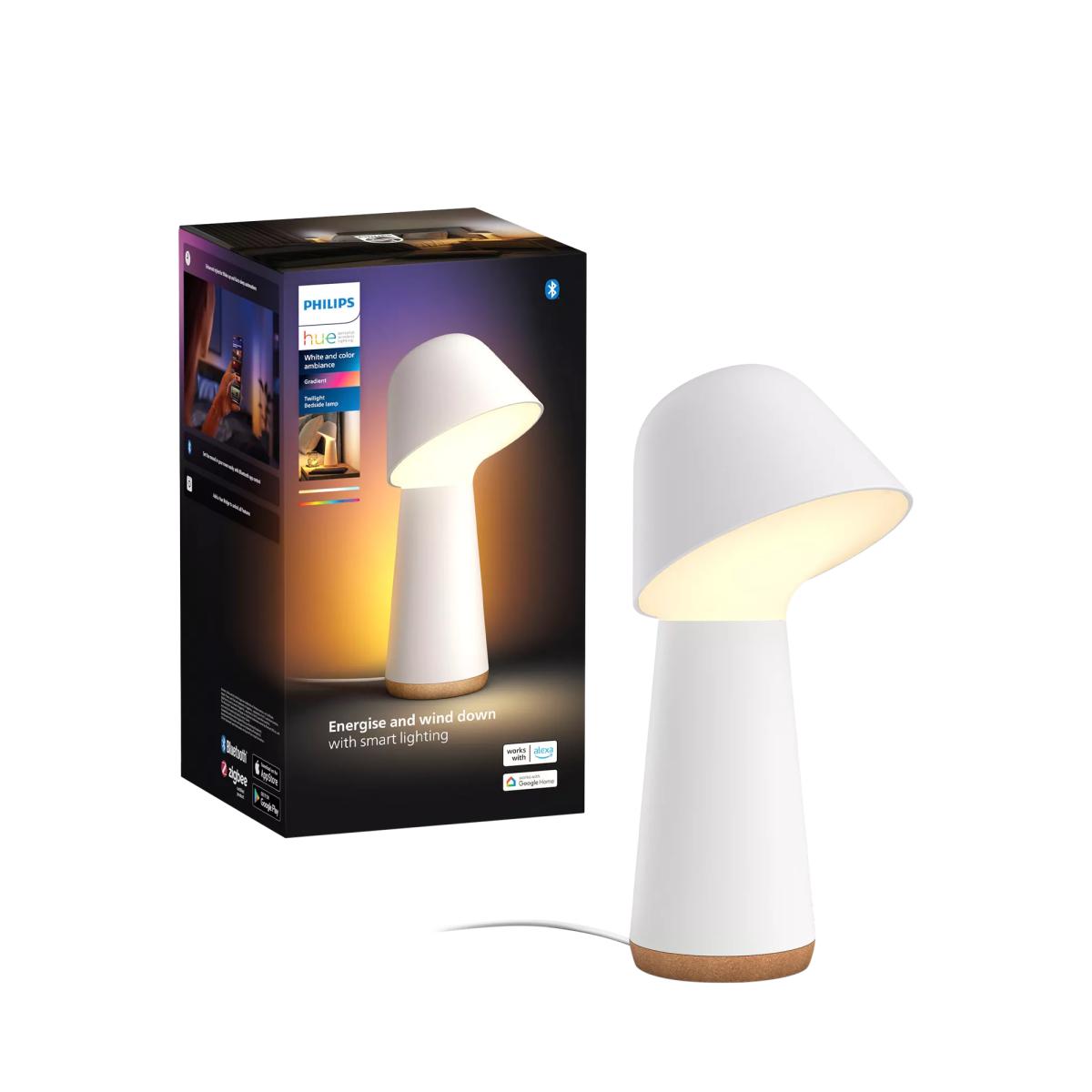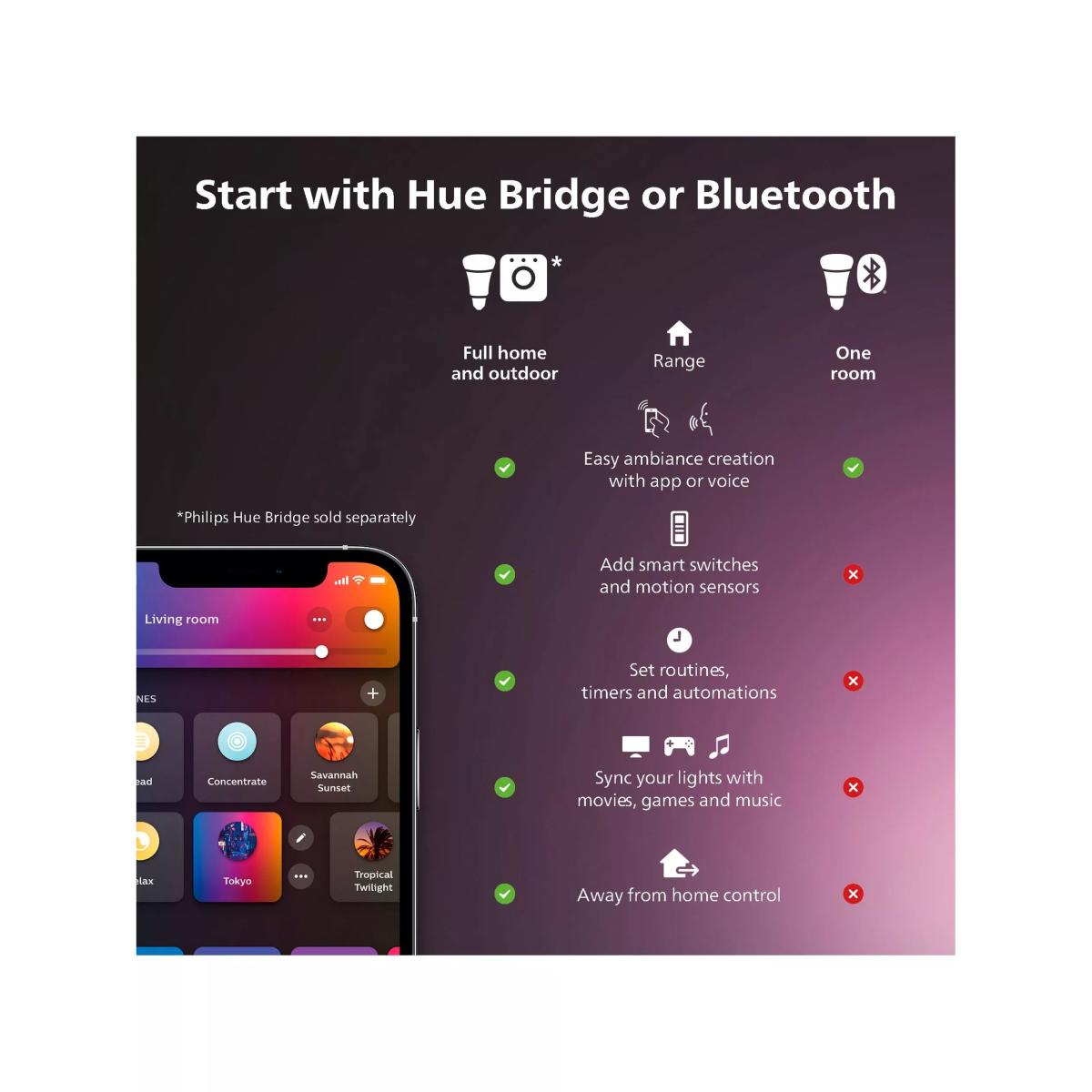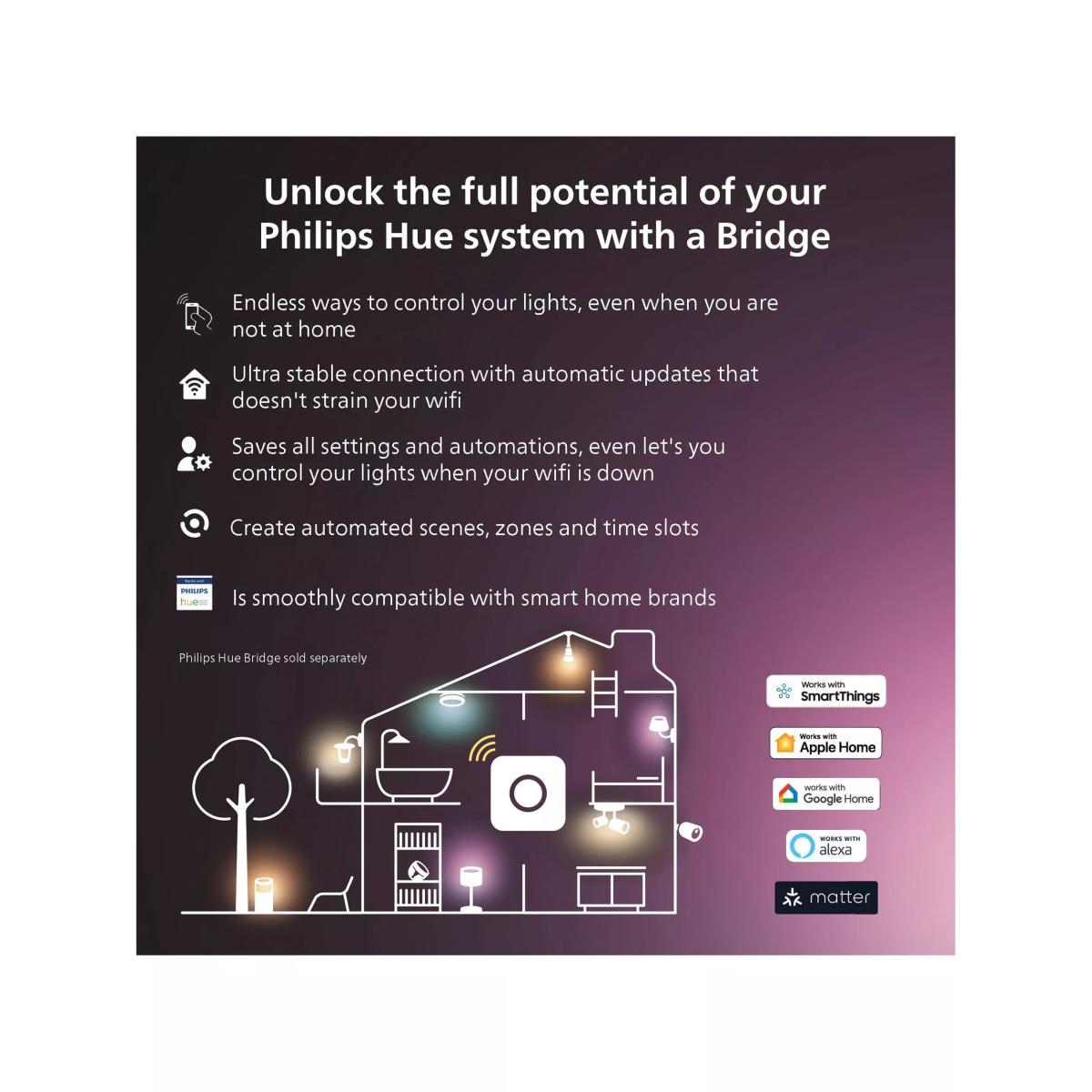 Designed to help you feel more recharged throughout the day, this bedside lamp uses science-backed scenes for mood-boosting lighting. Colour Cast gradient projection technology brings beauty to your bedroom. Smart control straight out of the box This light works with the free Philips Hue Bluetooth app. Simply install your new Hue light and connect to the Bluetooth app for instant, smart lighting control. Colourful, smart light Transform your space with accents of coloured light. You can dim down the intensity and blend soft colour tones for smooth light effects. Voice-assisted, hands-free control Control the light with simple voice commands. Apps to help you unlock more With the Philips Hue iO. S and Android apps, you can control this light directly from your smartphone. Unlock additional features with the Hue Bridge To experience the full potential of this smart light, connect to a Philips Hue Bridge (optional extra, available to purchase separately). Additional Philips Hue features include setting timers and routines with light, controlling your lights remotely and automating your entire smart home lighting set-up. There's also the option to add other accessories, including motion sensors and smart switches.
