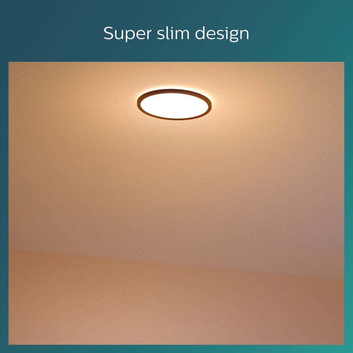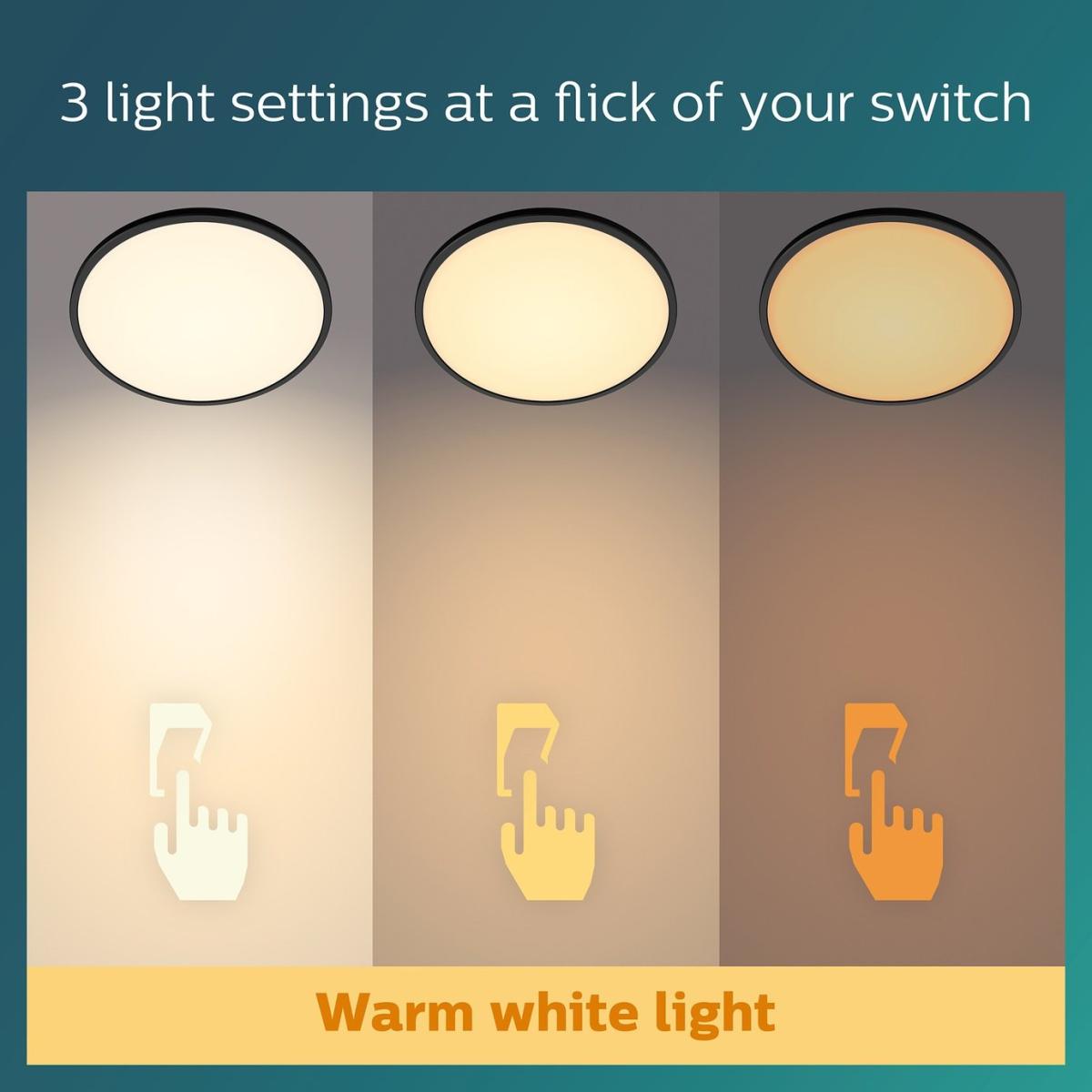Create the right mood by changing brightness. Philips' Scene Switch LED ceiling light lets you enjoy three brightness settings that are perfect for every moment. No dimmer or additional installation is required – all you need is your existing switch. One fixture. Your switch. Three light settings with Super slim design. Dimensions: Size H2.3, W25, D25cm. Diameter 25cm. None adjustable drop. 2.3cm drop. Bulb Information: Energy consumption/1000h (kwh): 0.9. Bulbs required 1 x integrated LED (included). Recommended maximum wattage: 15 watts. Can not be used with a dimmer switch. Dimmable LED bulb. LED bulb only. Colour rendering index 80. Colour temperature 2700. K. Rated luminous flux 1300 lumens. General Information: Metal & Plastic. 1 pull switch. - not suitable for bathroom use. Weight: 0.43kg. Minimal assembly. Product is mains powered plug in. This lighting product is a class 2 fitting. Manufacturer's 5 year guarantee.