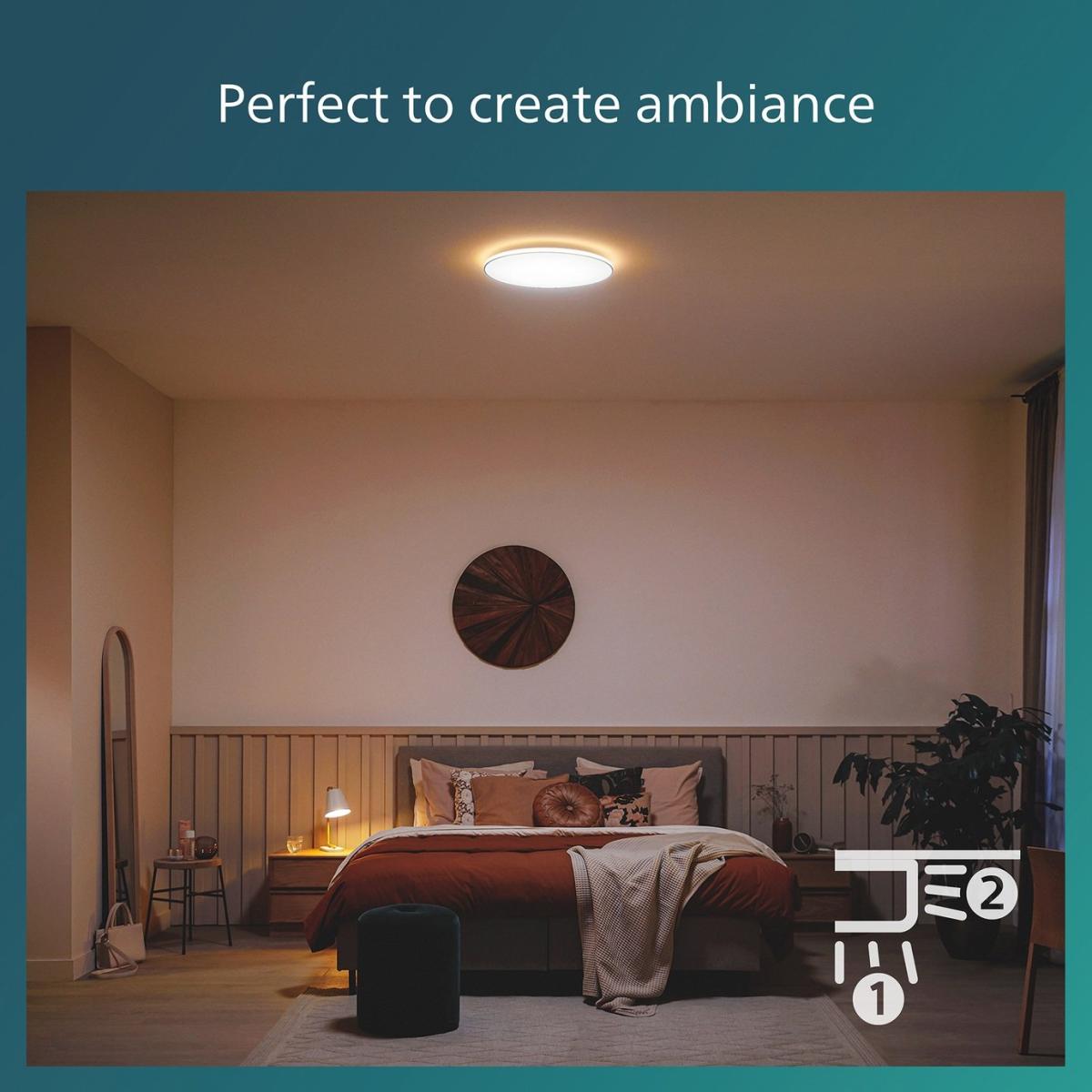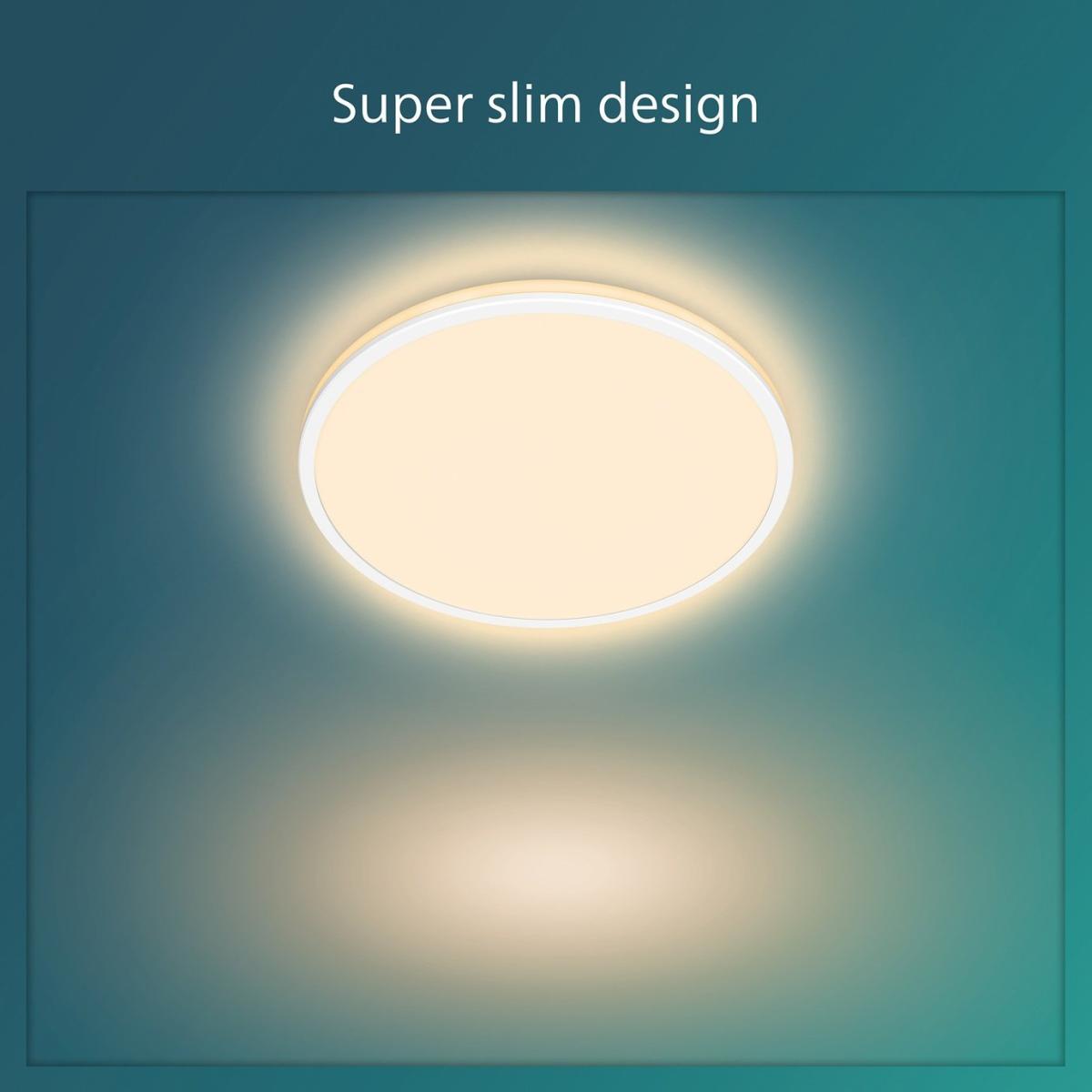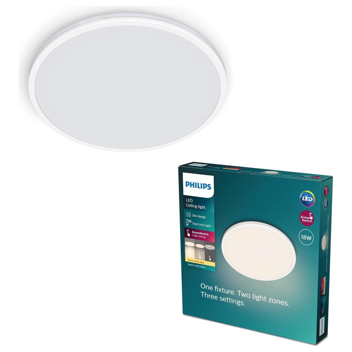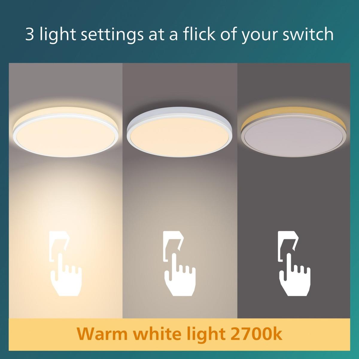 This sleek, slim, white ceiling light is designed to compliment any ceiling. The clean round lines of the main light are accented with a clever linear edge light. Both lights work together to create three unique 2,700 k cool white light settings for a beautiful even light effect. The lamp is available in three sizes, and therefore fits perfectly in any room of your house. It is completed with a handy memory feature that recalls your last setting. The Ozziet ceiling light looks as good off as it does on. Easy installation. Perfect to relax and socialize. Dimensions: Size H4.5, W30, D30cm. Diameter 30cm. None adjustable drop. 4.5cm drop. Bulb Information: Energy consumption/1000h (kwh): 0.9. Bulbs required 1 x integrated LED (included). Recommended maximum wattage: 18 watts. Can not be used with a dimmer switch. Dimmable LED bulb. LED bulb only. Colour rendering index 80. Colour temperature 2700. K. Rated luminous flux 1800 lumens. General Information: Plastic. 1 pull switch. - not suitable for bathroom use. Weight: 0.61kg. Minimal assembly. Product is hard-wired into electrics. This lighting product is a class 2 fitting. Manufacturer's 5 year guarantee.
