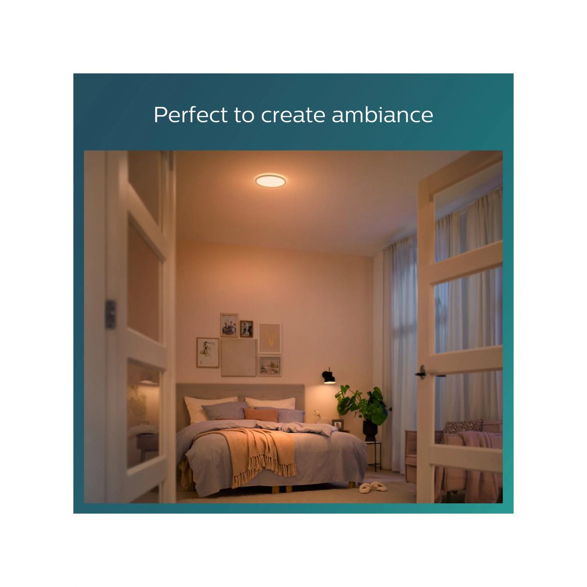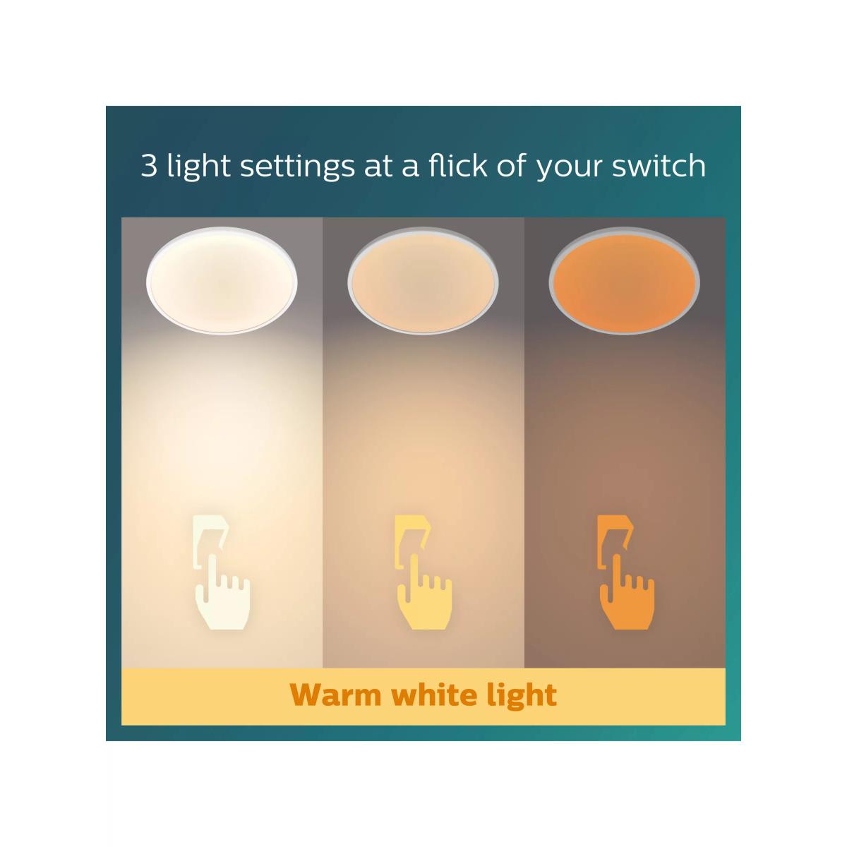 This functional flush fitting from Philips features an integrated LED with Scene Switch technology, meaning you can enjoy three brightness settings without the need of a dimmer or additional installation. Slim and practical so it's a great option in low-ceiling rooms, it offers a uniform distribution of high-quality light that meets strict Eye Comfort requirements.