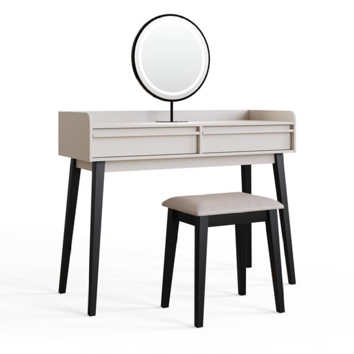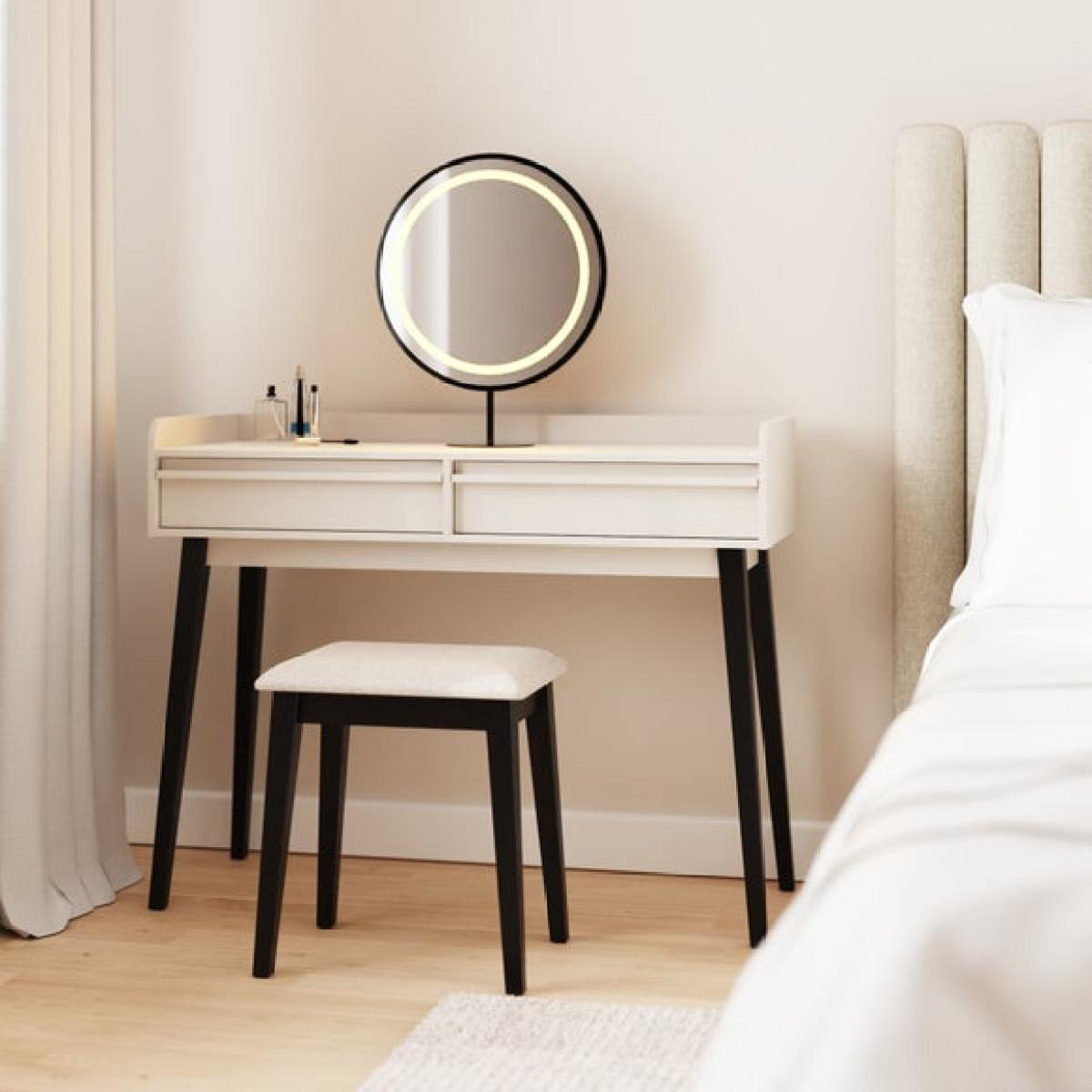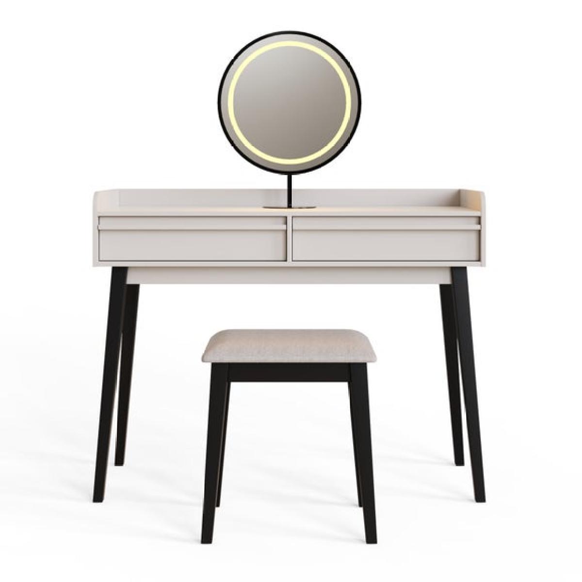 * Round LED mirror with three lighting modes * Compact frame ideal for smaller spaces * Two drawers for beauty essentials * Soft natural tone for a relaxed look The Phoebe Dressing Table with Round LED Mirror and Stool is designed to make your beauty routine feel more considered. Its compact frame fits neatly into smaller spaces, while the soft finish and black legs give it a modern edge. The circular mirror features built-in LED lighting with three modes, so you can adjust the glow to suit your morning or evening setup. Two drawers offer space for makeup, skincare and accessories, helping you keep everything in order. The matching stool completes the set, giving you a comfortable spot to get ready. A neat solution for everyday use.