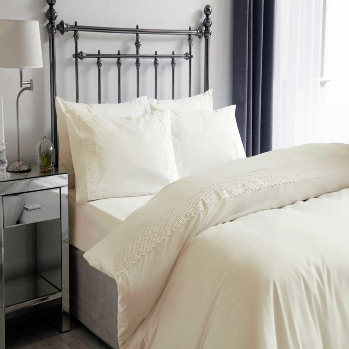 50 Combed Cotton50 Polyester. Duvet cover set made from high quality Polycotton. Single size includes one pillowcase, other sizes include two. Easy care finish. Scalloped edge. Fine dot detail. Closes with buttons. Lace trim. Machine washable, can dry and need minimal iron.