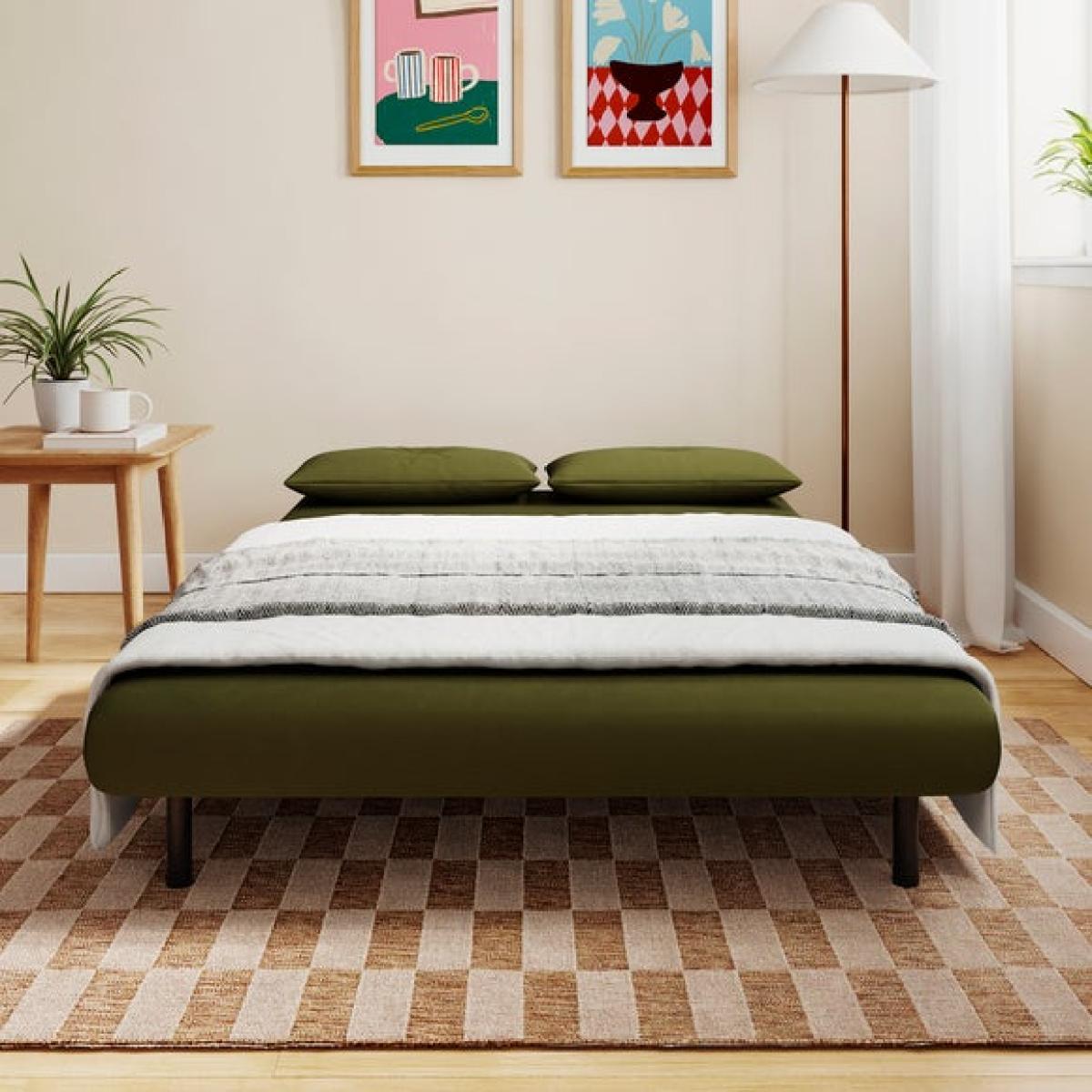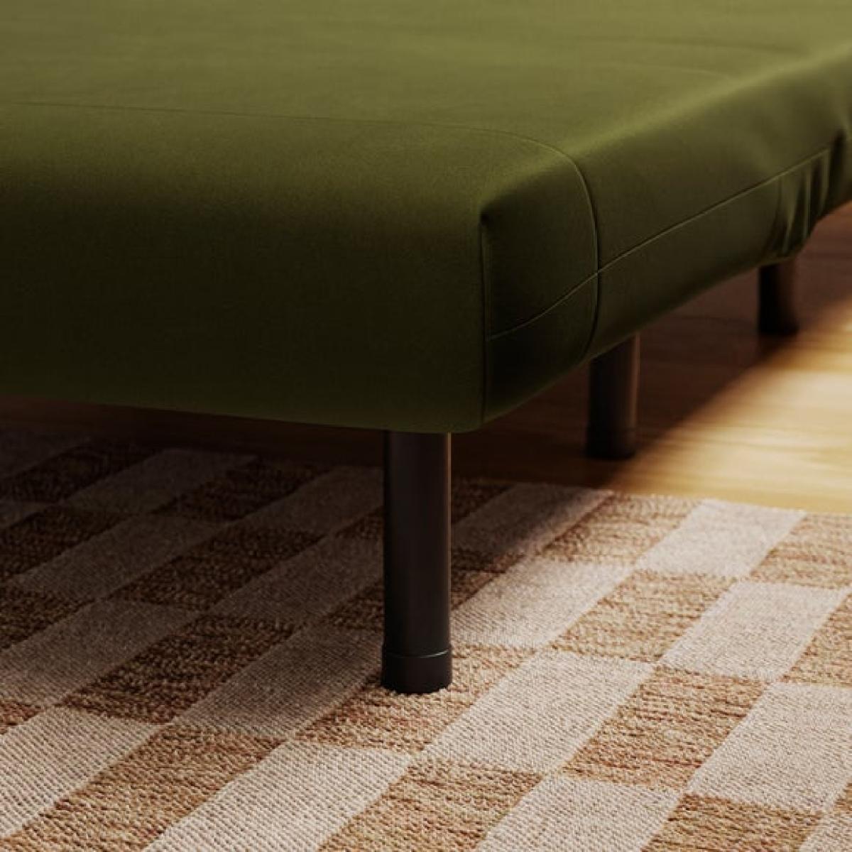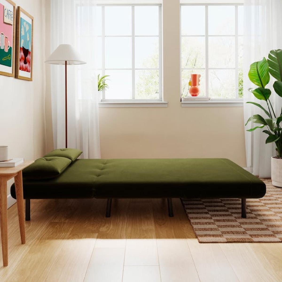 * Small double sofa bed * Folds out easily * Range of colours * Ideal for compact spaces This small double sofa bed is a great option for compact spaces, providing extra seating and a bed for guests. Luxurious velvet fabric in a choice of sumptuous colours and black metal legs makes this sofa bed look as good as it feels, also featuring a modern armless design and foam cushion fillings. Unfolding into a bed is easy - perfect for a comfortable sleeping space by night, and a cosy sofa seating solution by day.