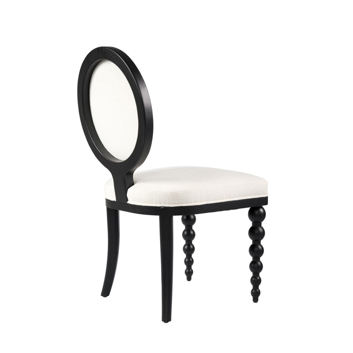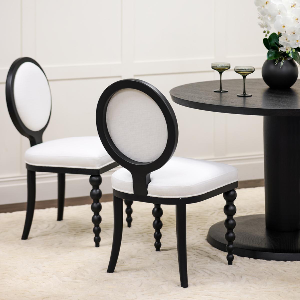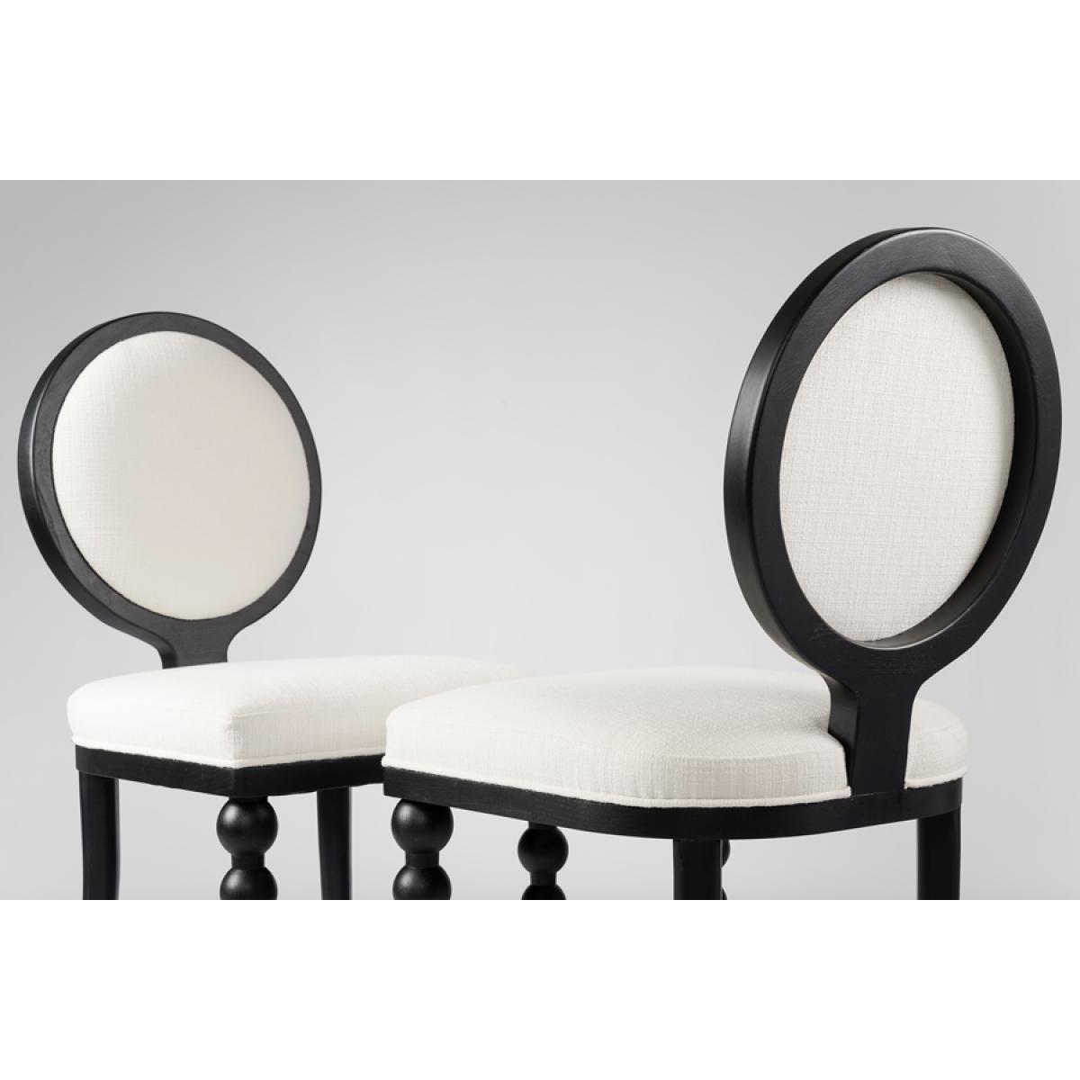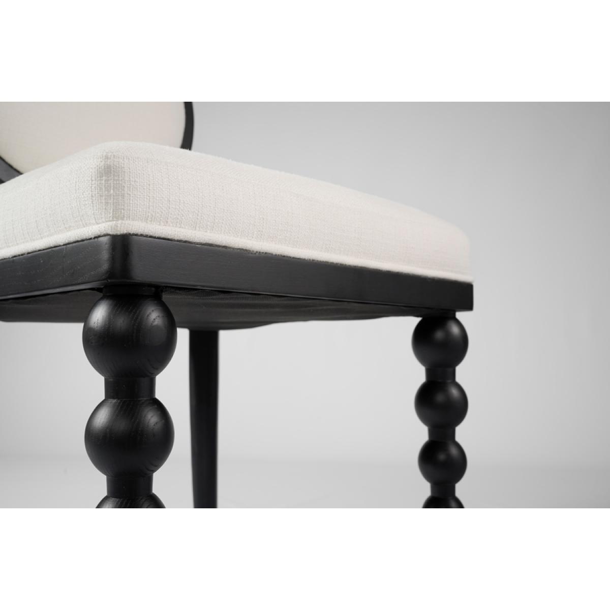 A contemporary and stylish take on an iconic French bistro chair. Expertly handcrafted from solid ash wood and finished with an elegant black satin stain. Featuring a distinctive and charming bobbin front leg design. Designed for comfort with a sprung seat and backrest, generously filled with deep padding. Upholstered in practical and durable linen effect fabric with a soft, tactile feel. Supplied fully assembled.