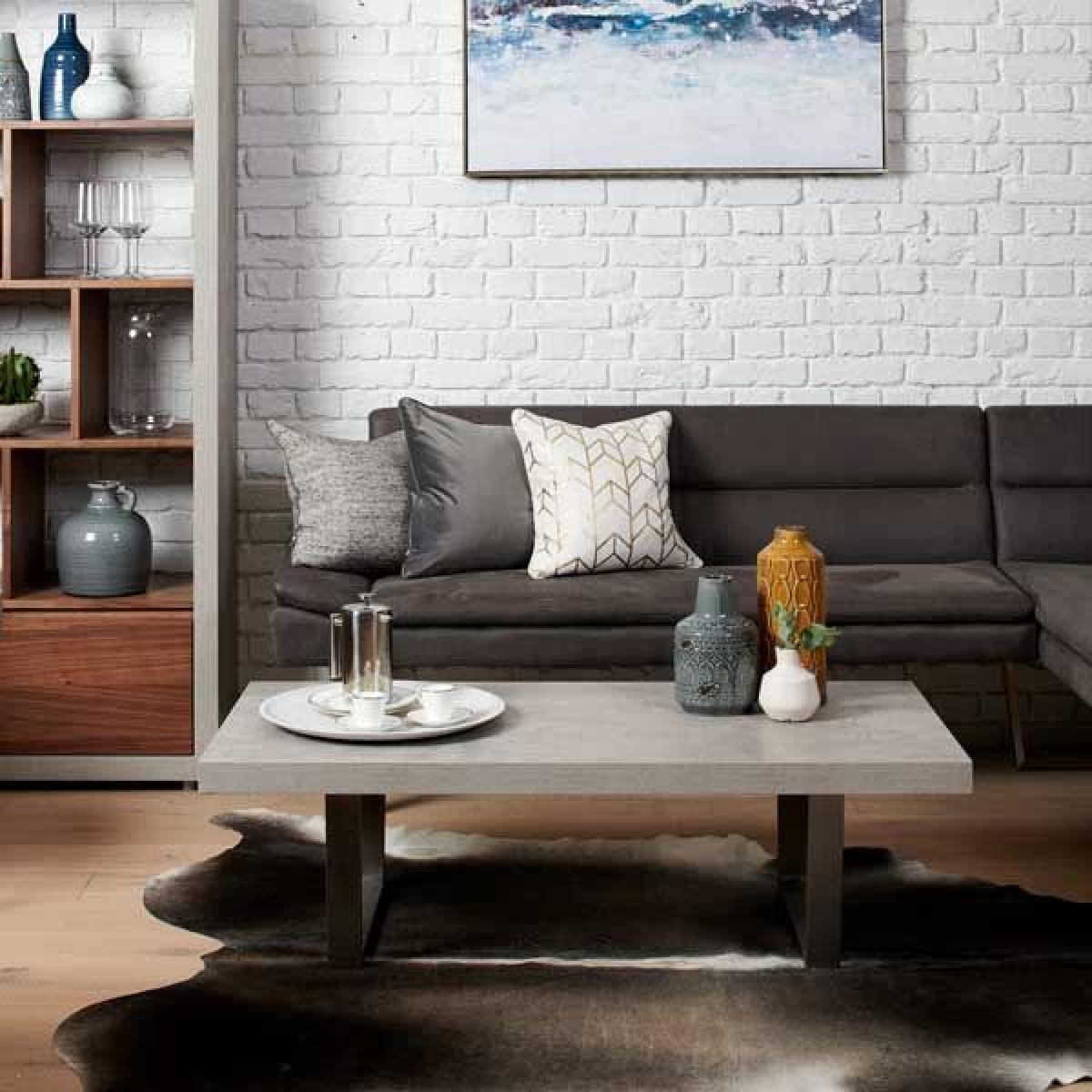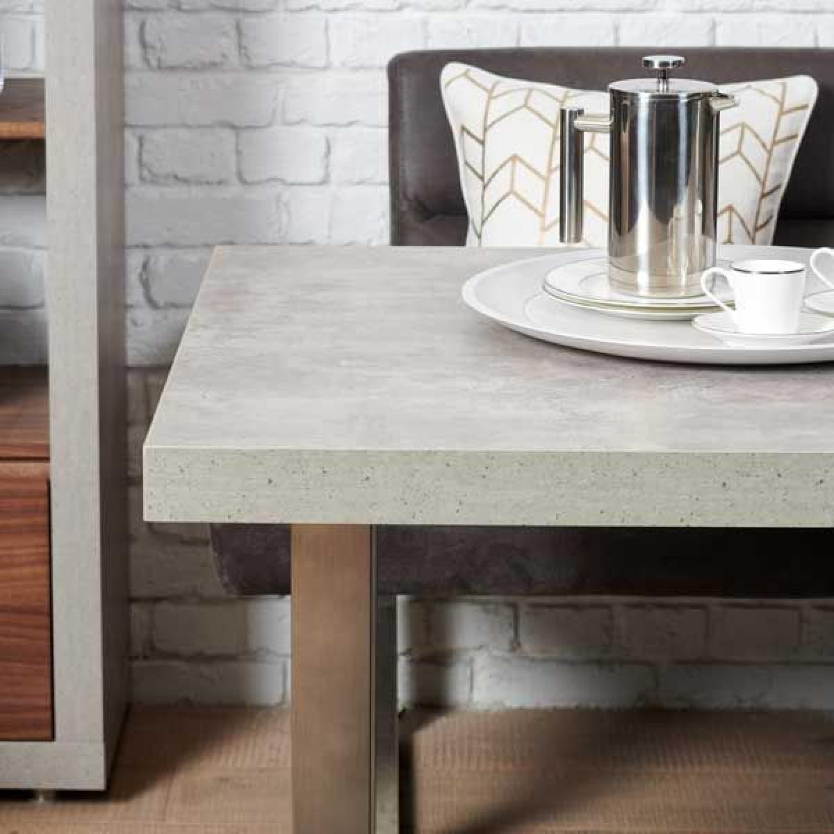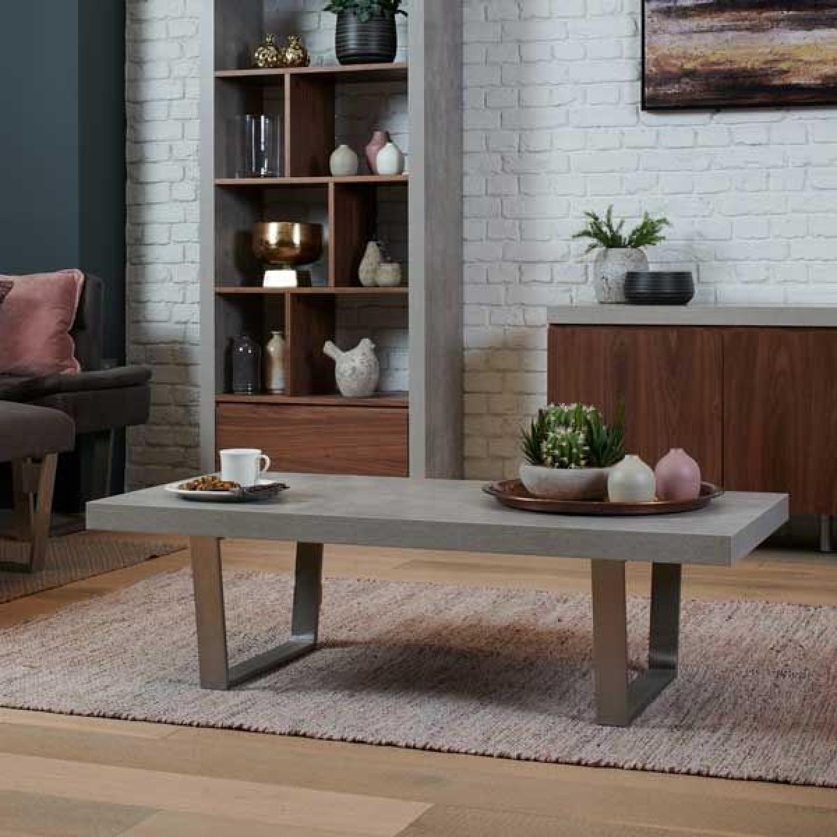 The walnut table top has been painted to look like concrete and combined with steel legs giving the Phoenix Coffee Table a simplistic and practical industrial looking style. Team with the rest of the Phoenix collection to complete the look. Stainless Steel base and legs Dimensions: H38.2cm W130cm L65cm Simple self assembly