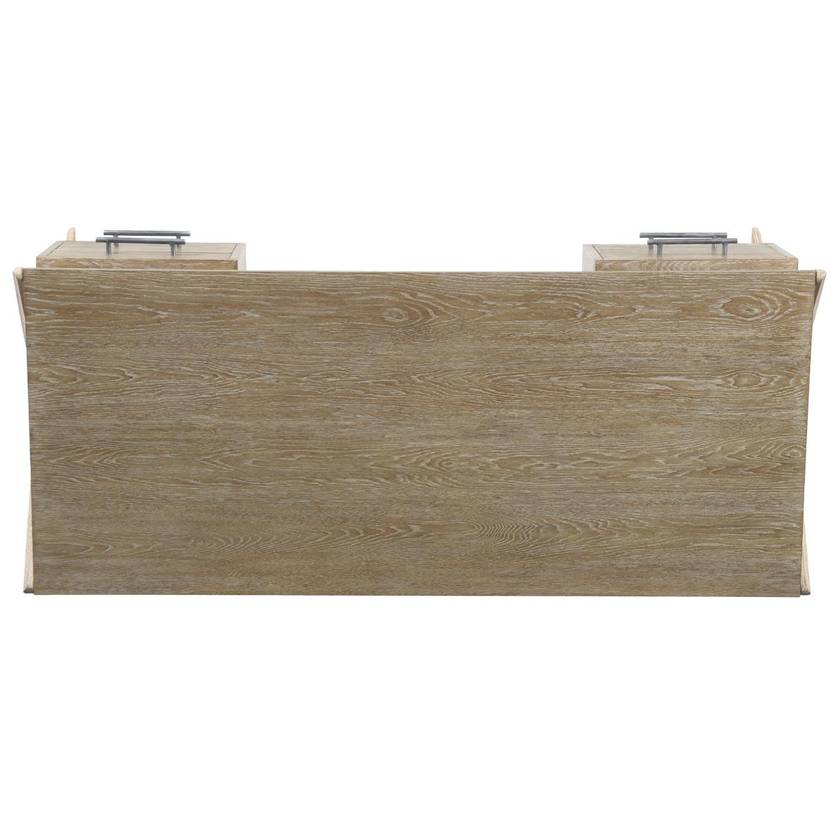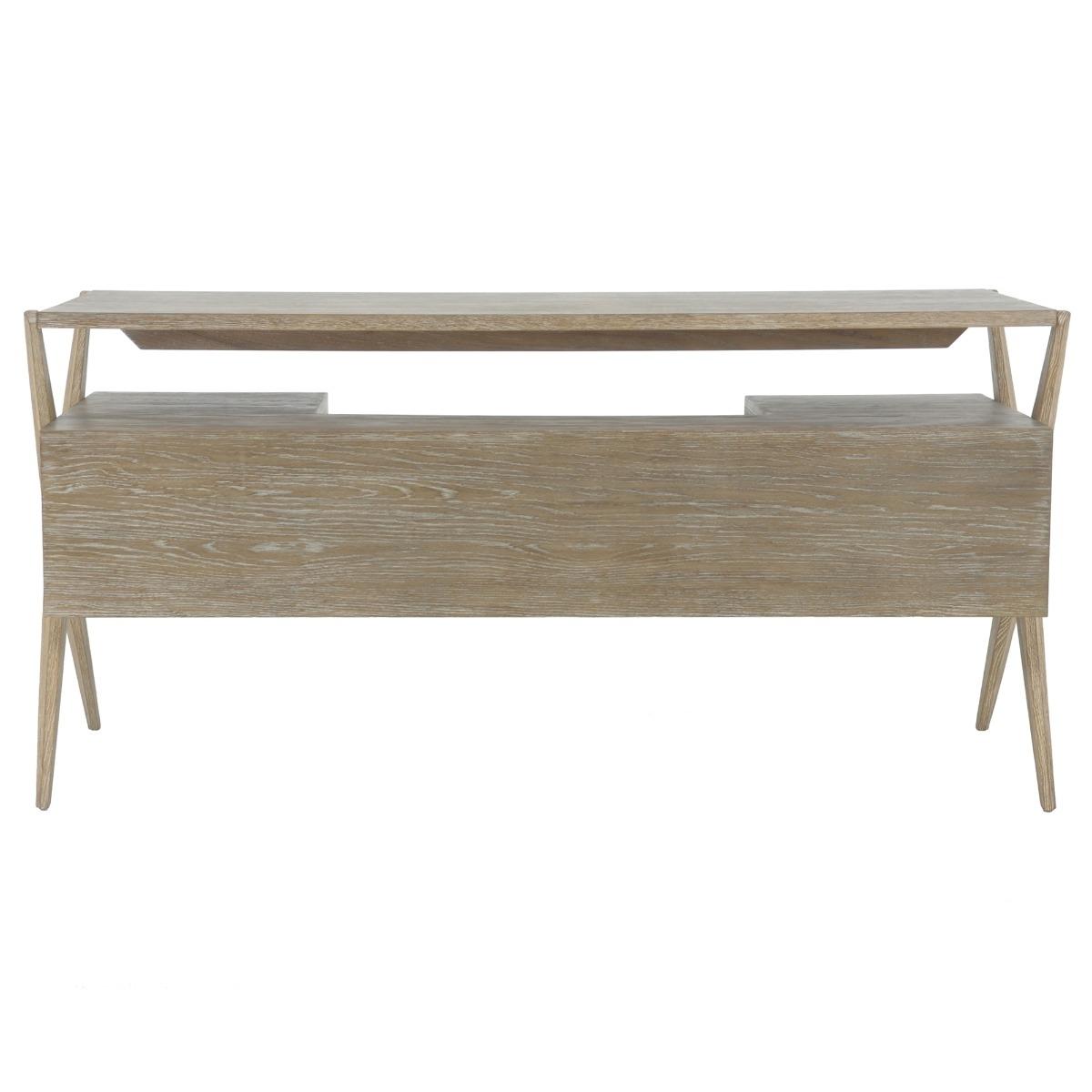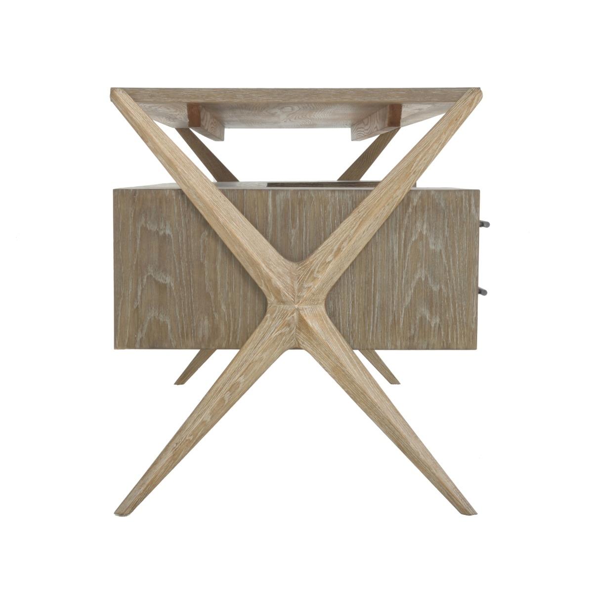 I like this grey-washed desk for its blend of mid-century angles and practical storage - the drawer units feel built-in yet don’t weigh the design down. Its neutral finish works equally well in Scandi, industrial or urban-loft interiors and sits neatly against a plain wall or in front of a window. For styling, choose a simple upholstered desk chair in a muted tone and add a slim black metal task lamp for contrast. Keep the surface clear with a small tray for stationery and a low-profile pot plant for texture. A neat woven basket tucked underneath will handle cables or files without spoiling the clean lines.