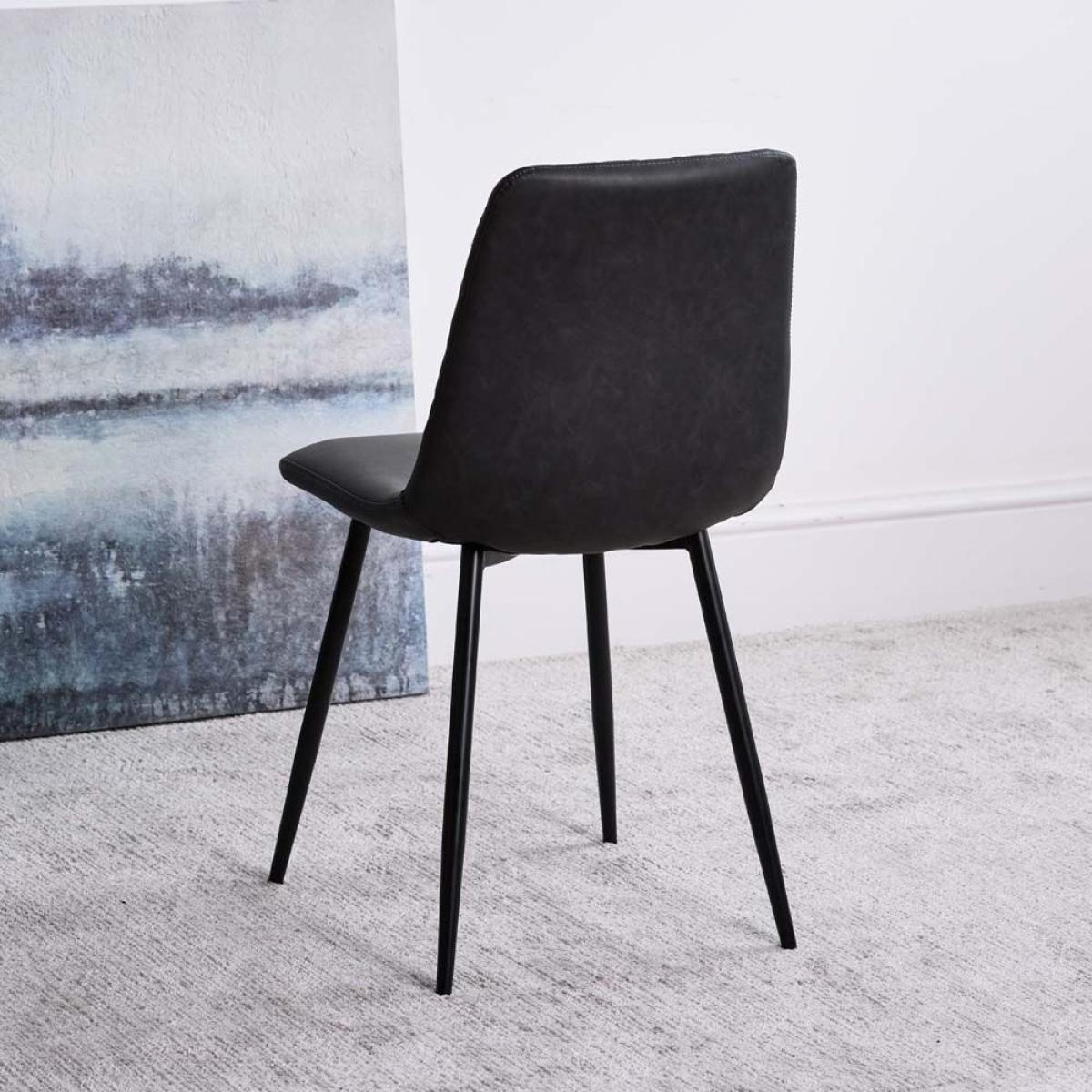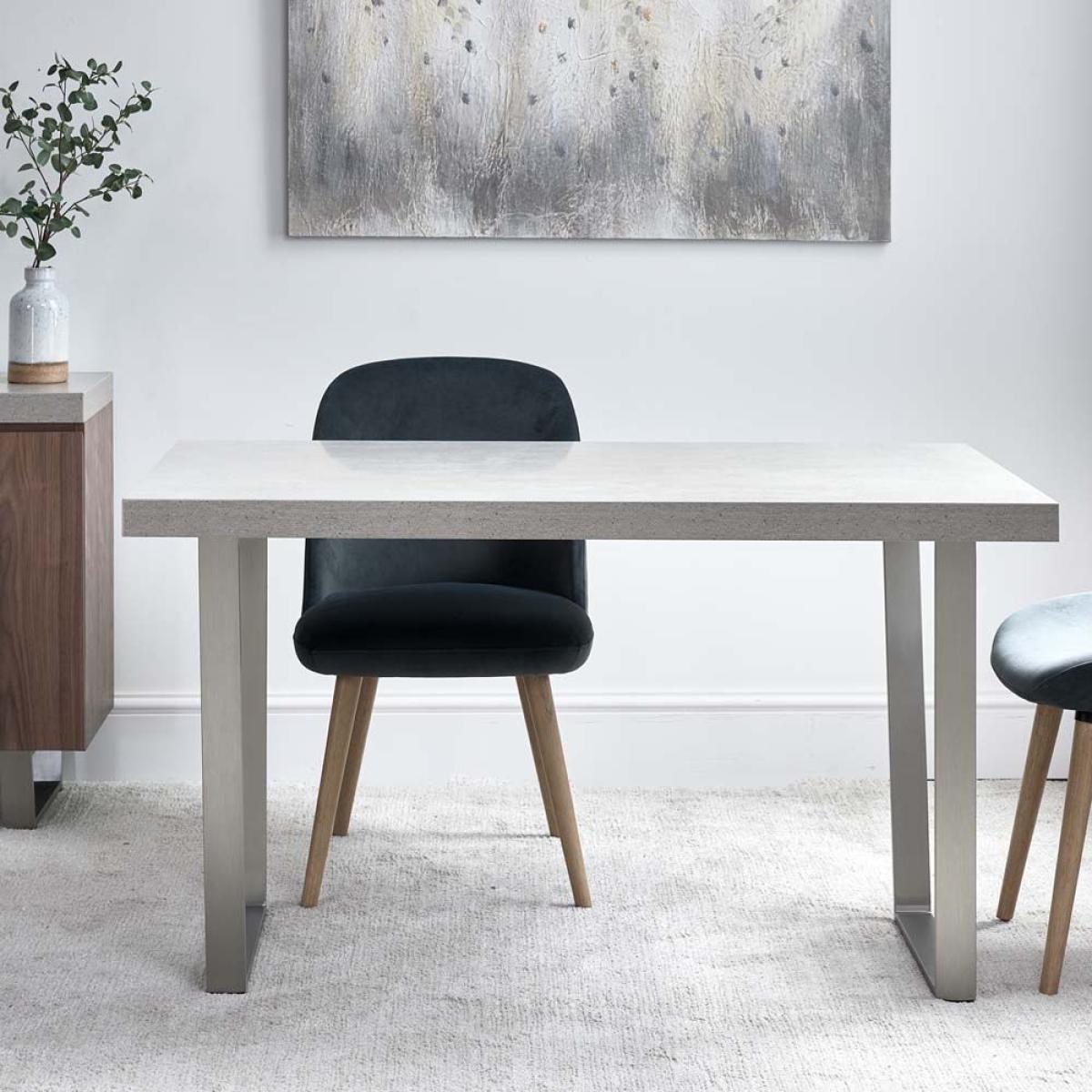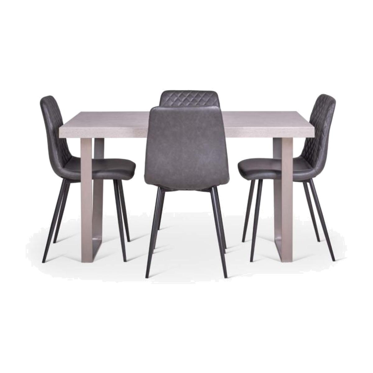 This dining bundle of our Phoenix Dining Table and four Ripley Dining Chairs in Grey has a perfect simplistic style ready to transform any modern home. The table is finished with a stunning concrete effect surface supported by angled steel legs for the ultimate industrial look. The Ripley chairs are upholstered in a faux leather fabric with diamond quilted back detail and sit on top of trendy black metal legs.