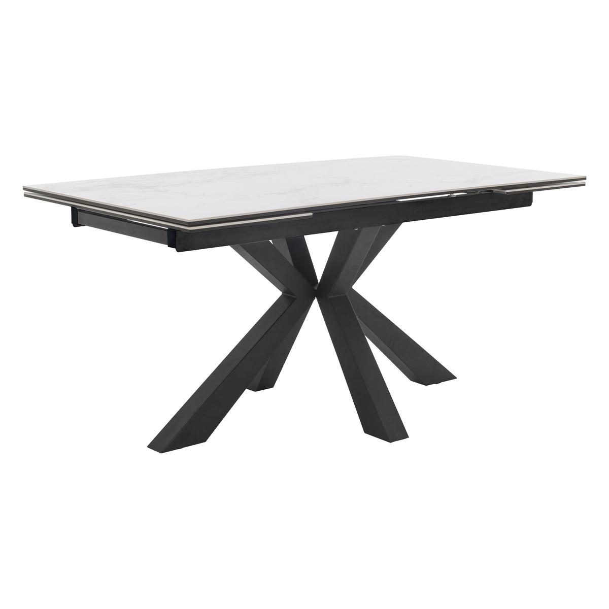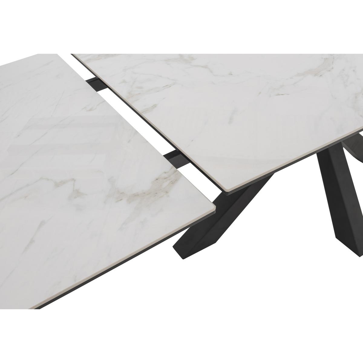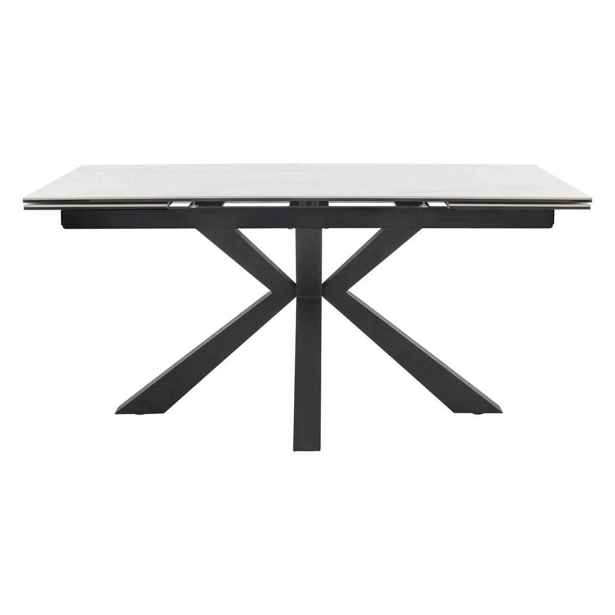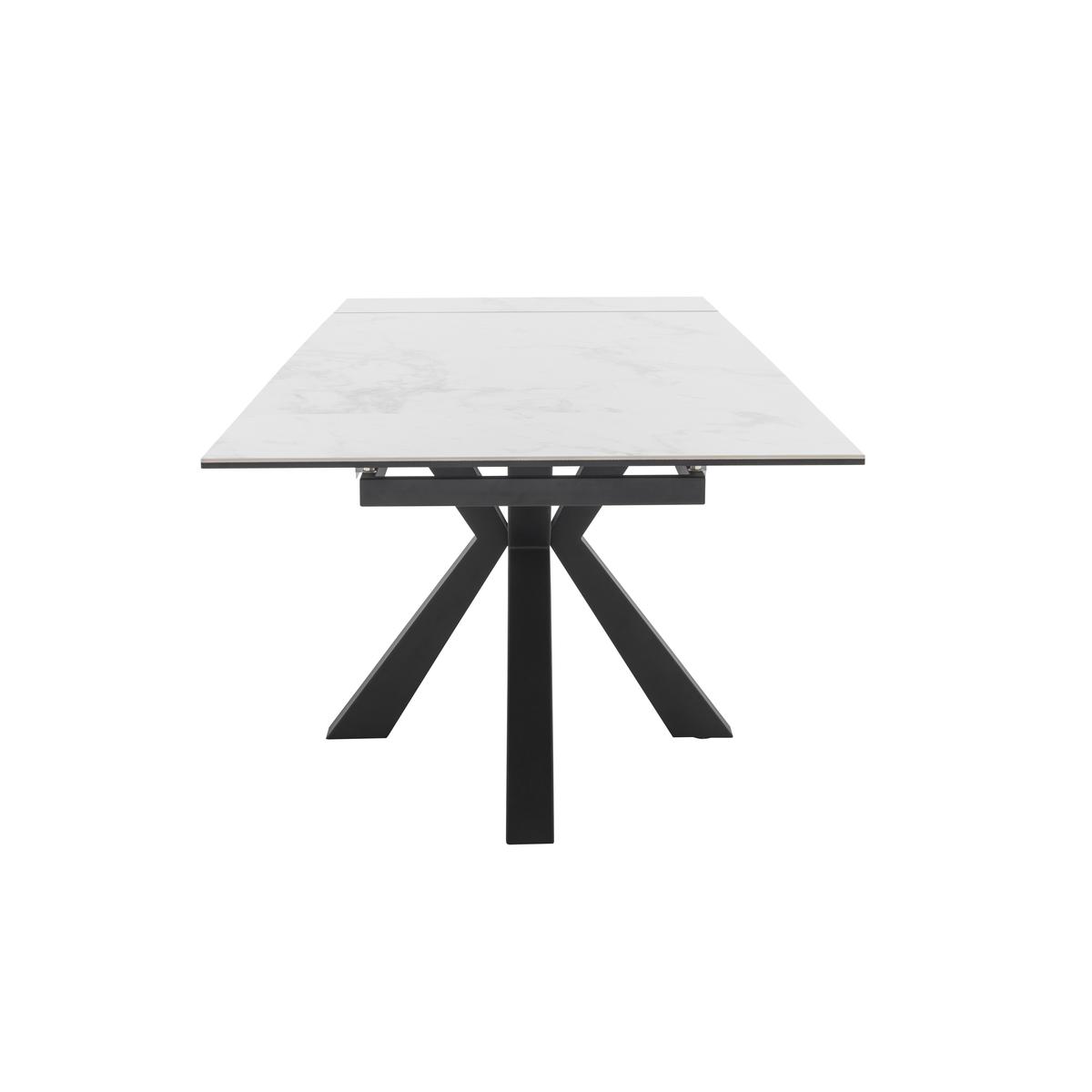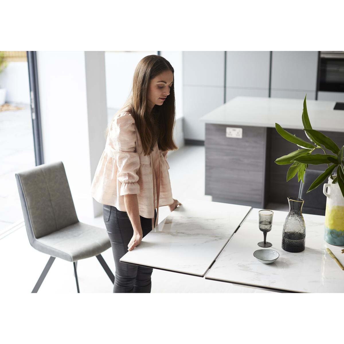 Everything about the Phoenix range makes a statement. The sunburst base of the extending dining table and occasional tables. The contrast between the smooth ceramic and the powder-coated metal. The juxtaposition of strong matt black and marble-effect white. It’s dramatic, stunning and very distinctive. Yet this contemporary range is also very much designed for everyday living and dining, thanks to the hardwearing ceramic-topped glass surfaces of the tables and sideboard. Comfortable, fully-upholstered faux leather dining chairs in two colourways complete this stylish contemporary range. Ceramic is water resistant, heat resistant and scratch resistant. It doesn’t dent or stain and is easy to clean. A Furniture Village exclusive. Distinctive and stylish, the Phoenix dining table is a study in monochromatic colour and contrasting materials. A large dining table, it extends to seat eight with easy to use leaves located at either end. And there’s no doubt you’ll want to gather as many as possible around this stunning piece. With its statement starburst base of black, powder-coated metal and its white ceramic-topped glass surface with Carrara marble effect, this table offers a striking juxtaposition of both colour and material – a strong contemporary look that turns any meal into an occasion. Ceramic is a hardwearing material, so while ultra-stylish this table is also easy to keep clean making it suitable for everyday dining. The Phoenix dining table is part of the Phoenix range of bold and beautiful dining and occasional furniture which also includes the perfect Phoenix dining chair, available in dark grey and two-tone grey. Exclusive Furniture Village. Did you know?. Ceramic is highly durable, and heat and scratch resistant. Please note the dining table’s extension leaves are not pattern matched and leg adjustment may be required if flooring is uneven.