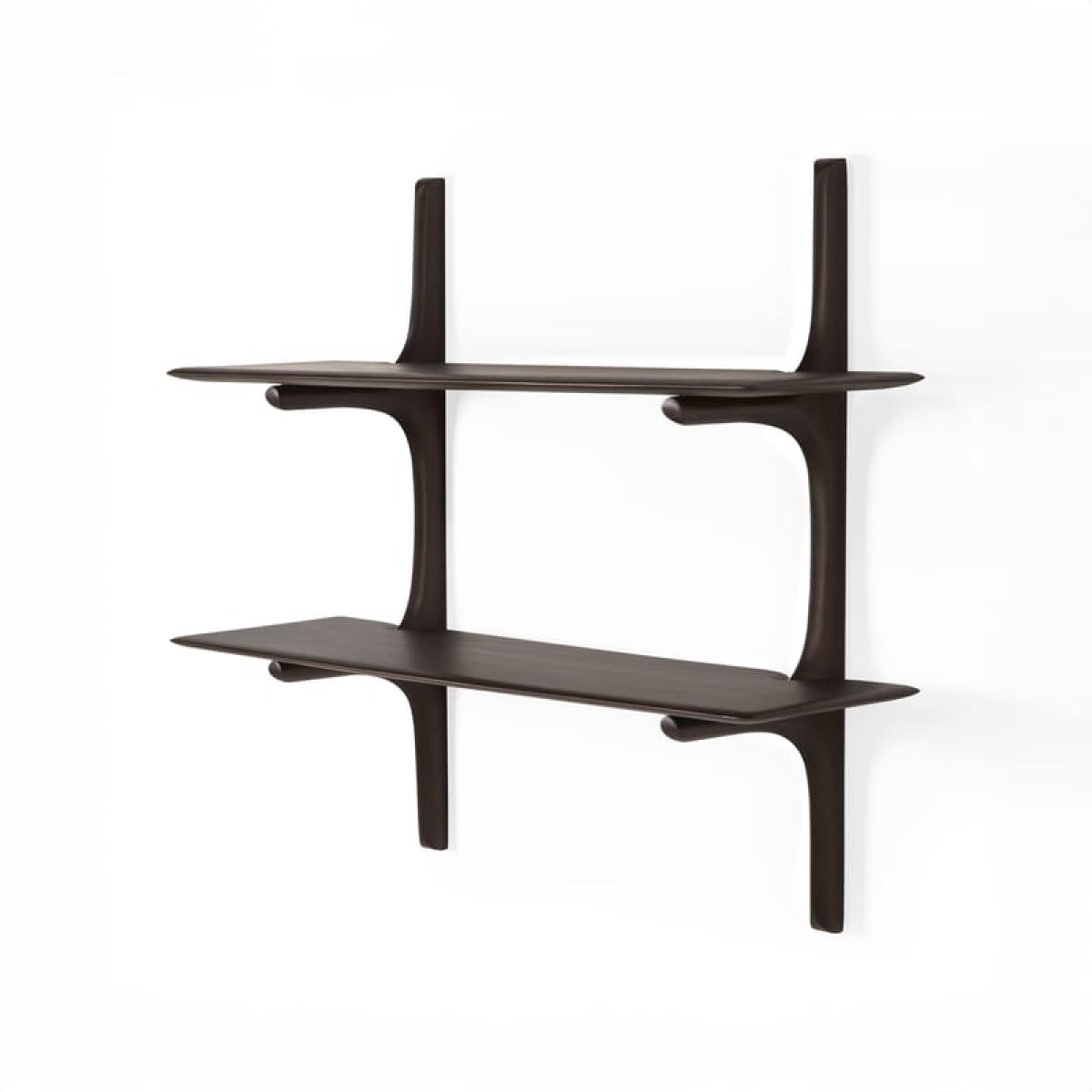 The PI wall shelving collection pays homage to living design, retaining the strength, curves and lines created by nature. Curved forms, organic and intriguing, take shape in Solid mahogany with a Polished finish. Each Wood shelf is hand-finished to respect the unique character of the wood.