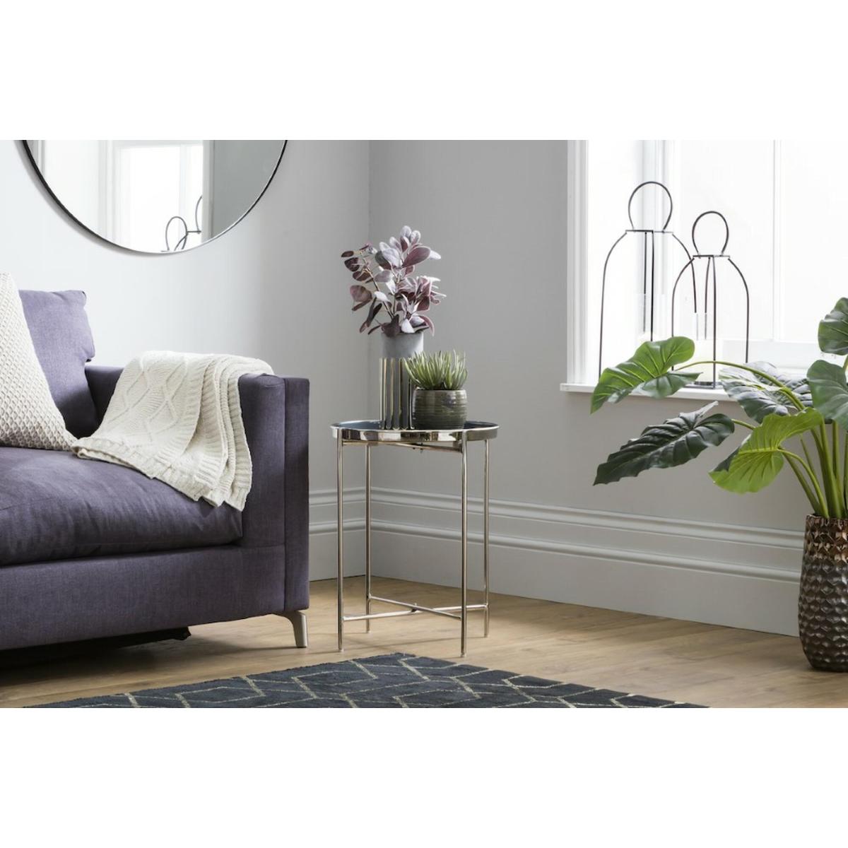 I love this side table for its sleek, contemporary look, which pairs well with both modern and eclectic interiors. Its reflective glass top and metallic frame make it a real statement piece without overwhelming the space. It works particularly well in minimalist, polished living rooms, or as a chic accent in a bedroom corner. A good styling tip is to keep the surface free of clutter and add a small lamp, a book, or a potted plant for an effortless yet polished finish. This table’s height makes it ideal for next to a sofa or armchair, where it can serve as a practical space for a drink or a favourite read. Its versatile design also lends itself to being layered with other metallic or glass accents to create a cohesive, sophisticated look.