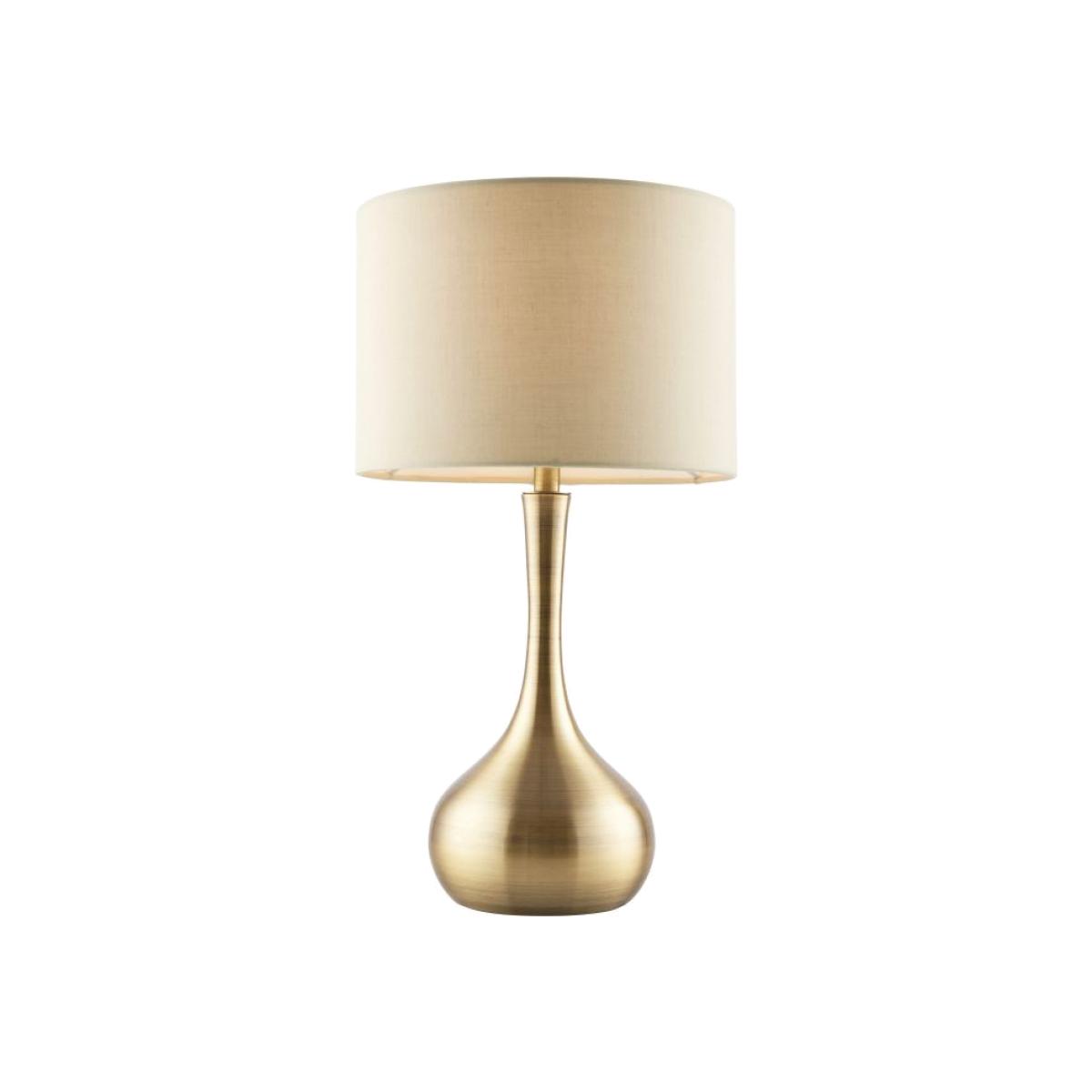 A sleek and stylish table light with a soft brass plate and a simple taupe fabric shade. Clever touch technology is used for operating and dimming. Other colour options available.